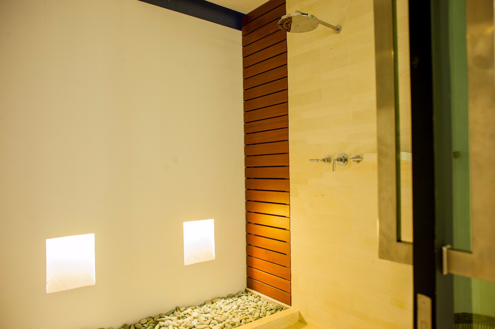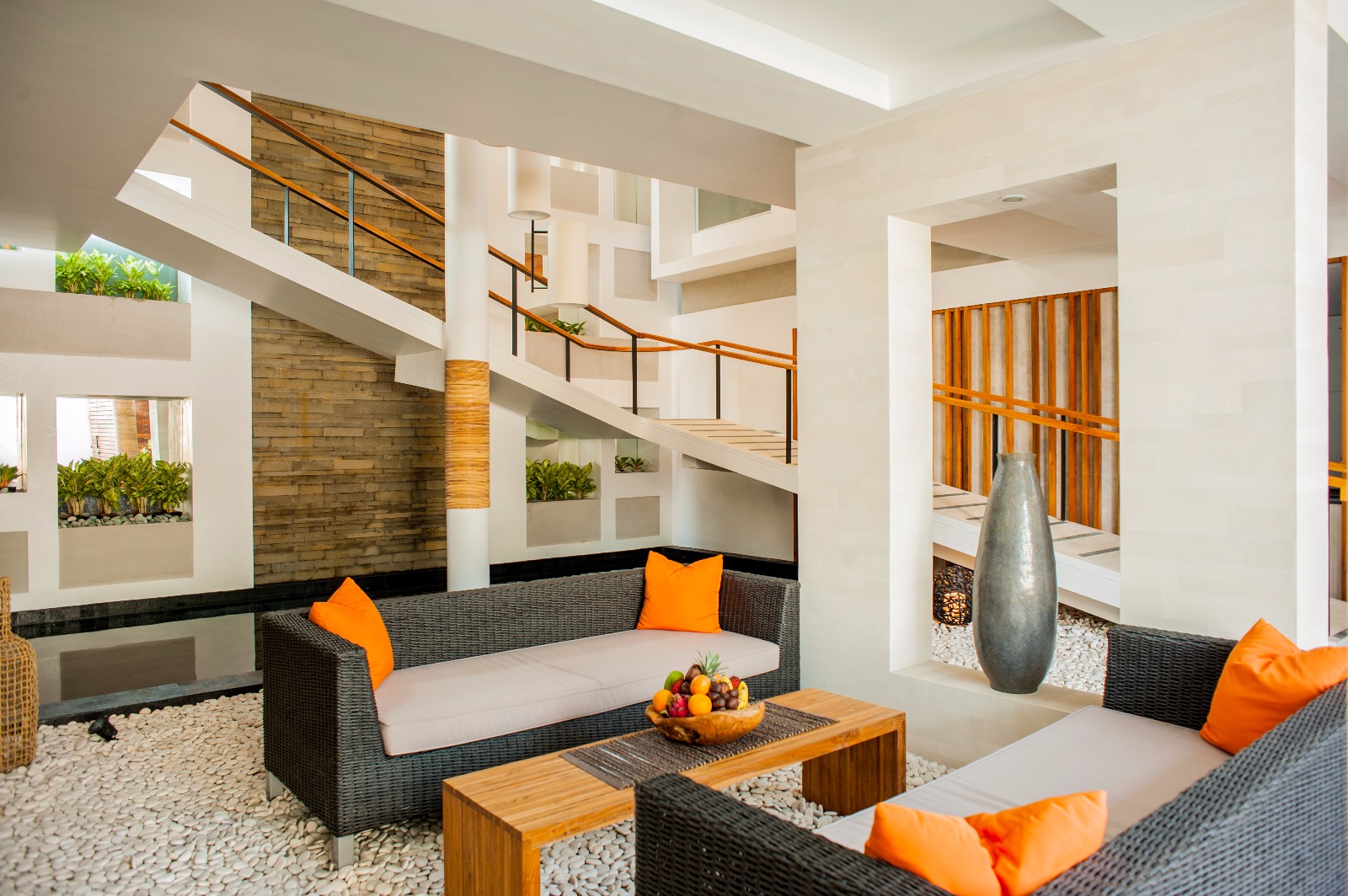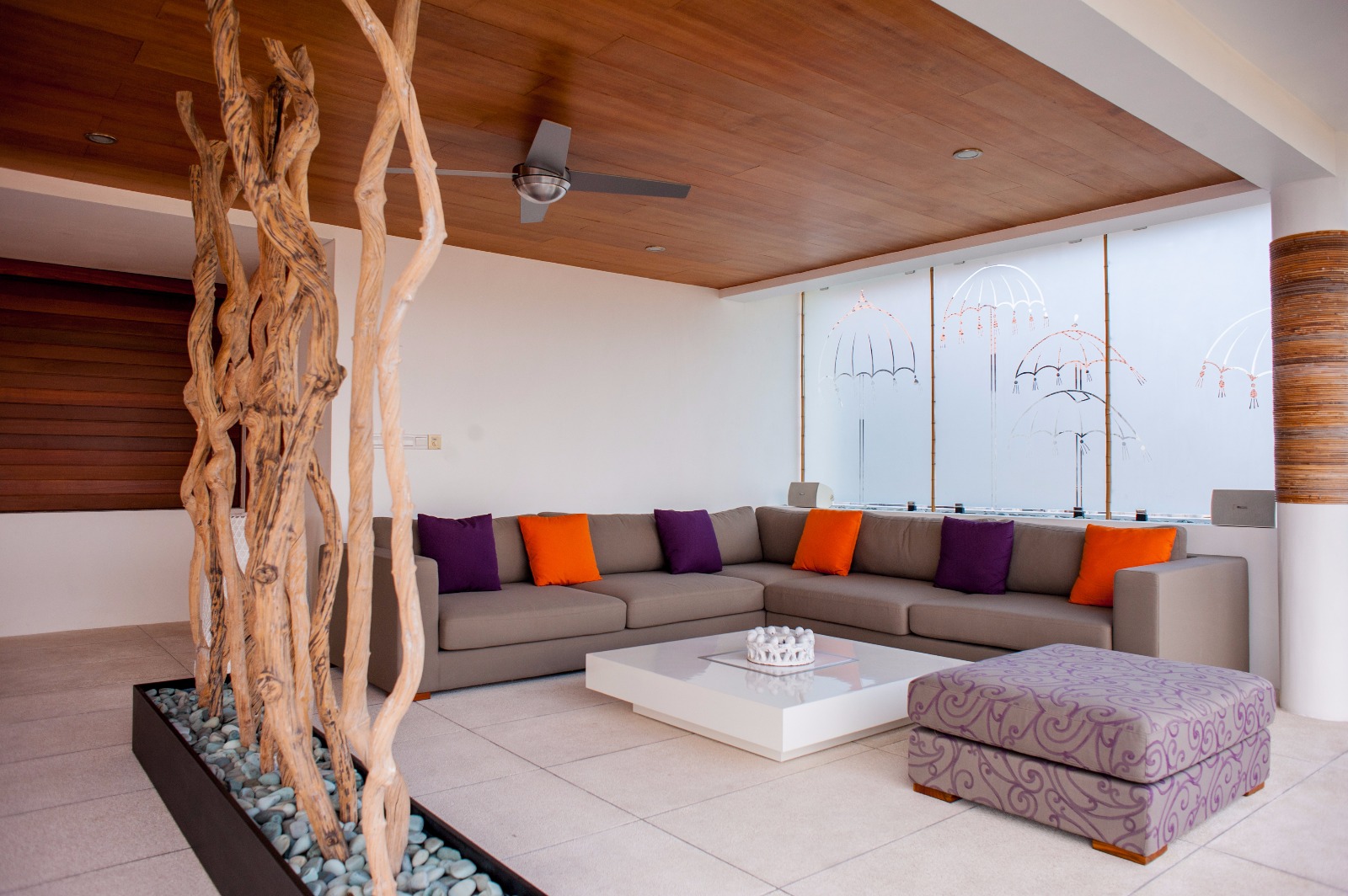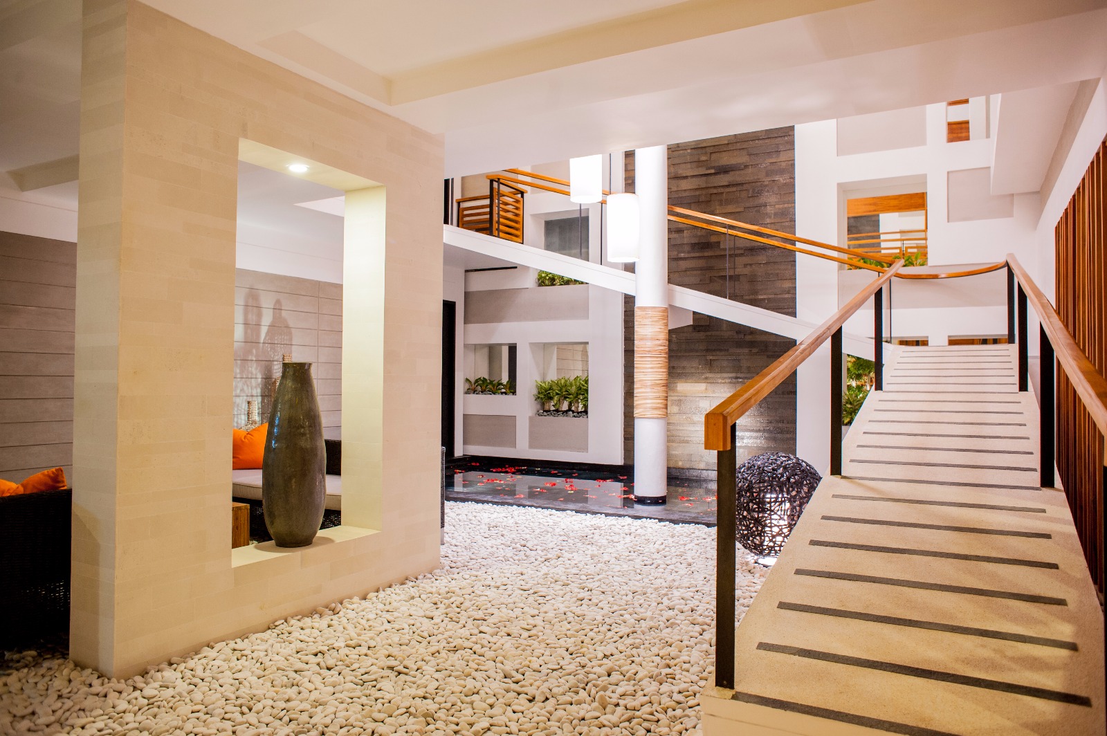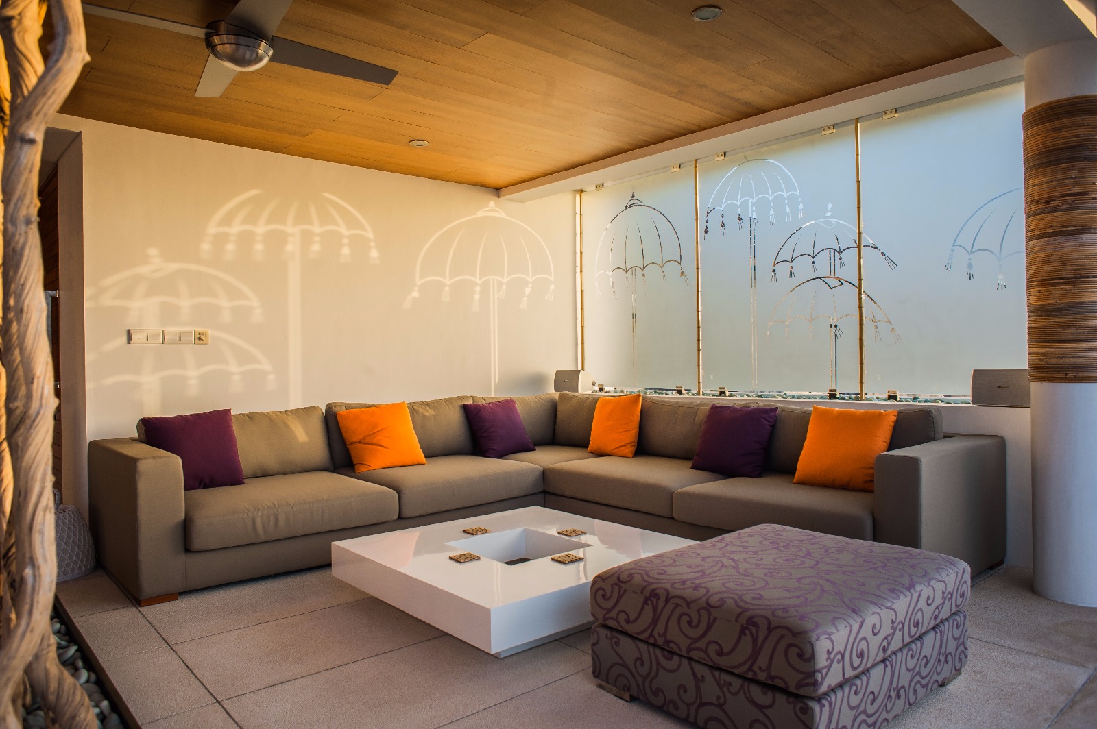 The villa is built around an atrium with a waterfall that drops into a reflecting pool on the ground floor, where there is a double bedroom , sitting area and a small garden. On the 1st floor are a double bedroom and a twin bedroom, each with their own sitting area and the home theatre. The 2nd floor has a third double bedroom with a balcony and another bathroom and the terrace and pool are located on the 3rd floor.