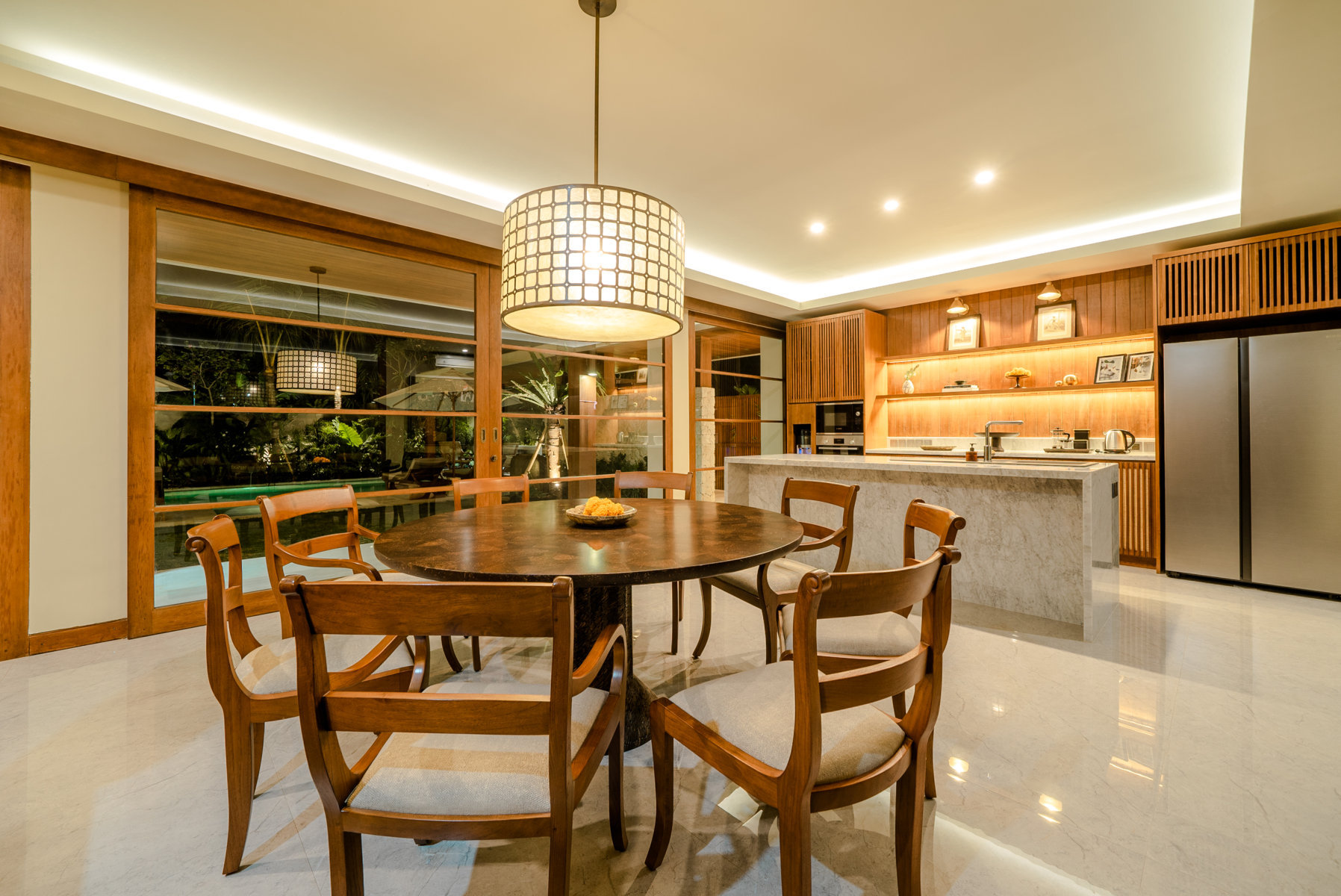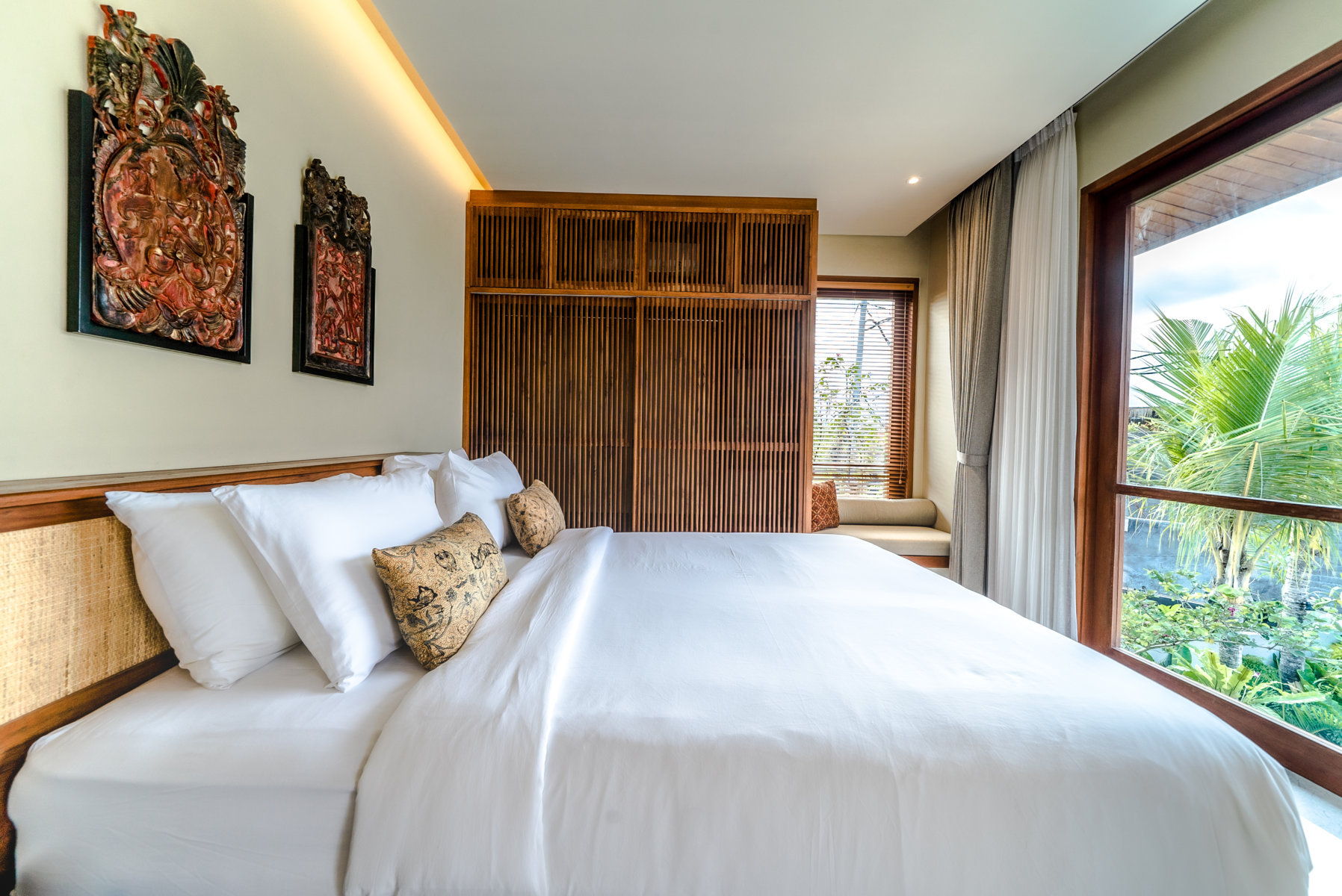 This villa boasts 5 bedrooms spreading over two storeys. Each room delights with modern contemporary design tinged with Balinese sensibilities. Large glass windows ensure ample mix of natural light and nature views at every turn. All bedrooms on the top floor overlook the magnificent garden pool and adjacent areas. The two ground floor bedrooms open out to the garden few steps from the pool. Each room comes with king-sized bed, en-suite, TV and AC.