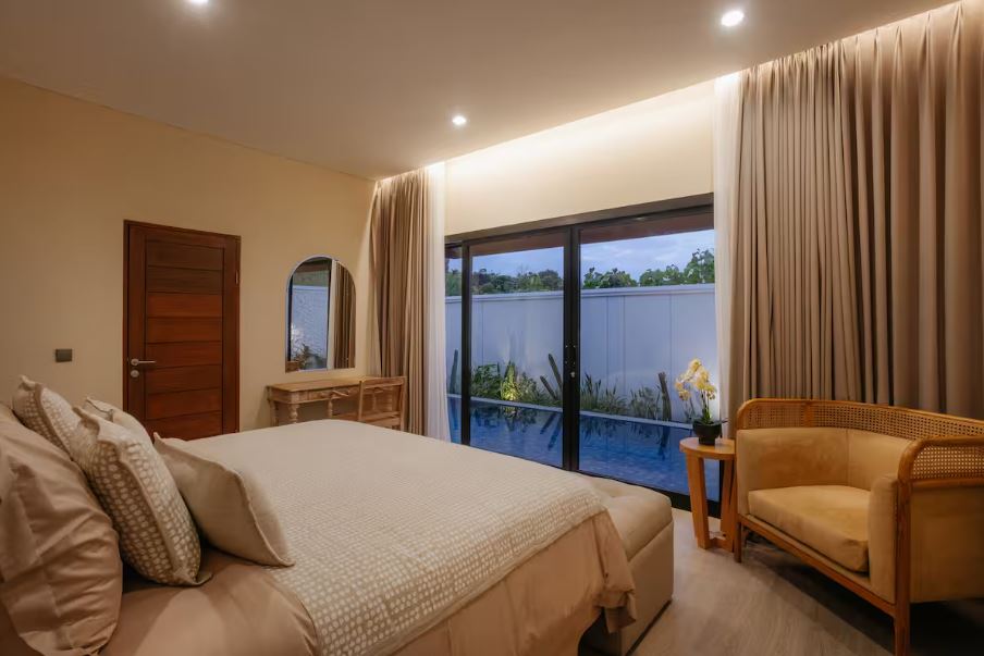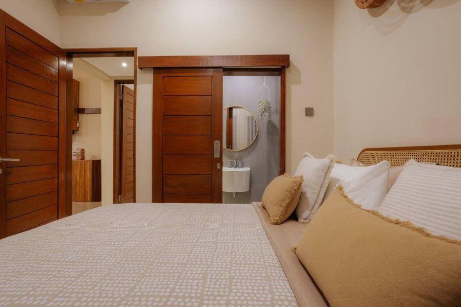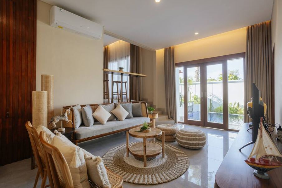 This villa is a cozy 3-bedroom villa with a rooftop patio offering scenic views of the Uluwatu and Ungasan areas. Located in a quiet and peaceful part of Ungasan, the villa is just 5-10 minutes by car from popular beaches like Melasti and Karma Kandara. The villa features three spacious bedrooms, including a master bedroom with an en-suite walk-in wardrobe and bathroom, plus direct access to the swimming pool. The two guest bedrooms share a bathroom, and one includes a mezzanine single bed, perfect for a 7th guest or children. Complimentary services include cleaning, linens, towels, kimonos, toiletries, Wi-Fi, and a minibar with soft drinks and fruits on arrival. Guests can enjoy the serene surroundings and stunning views from the large rooftop.