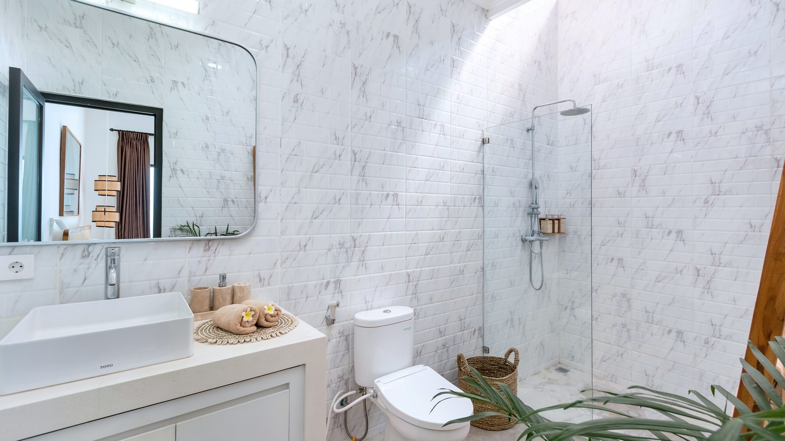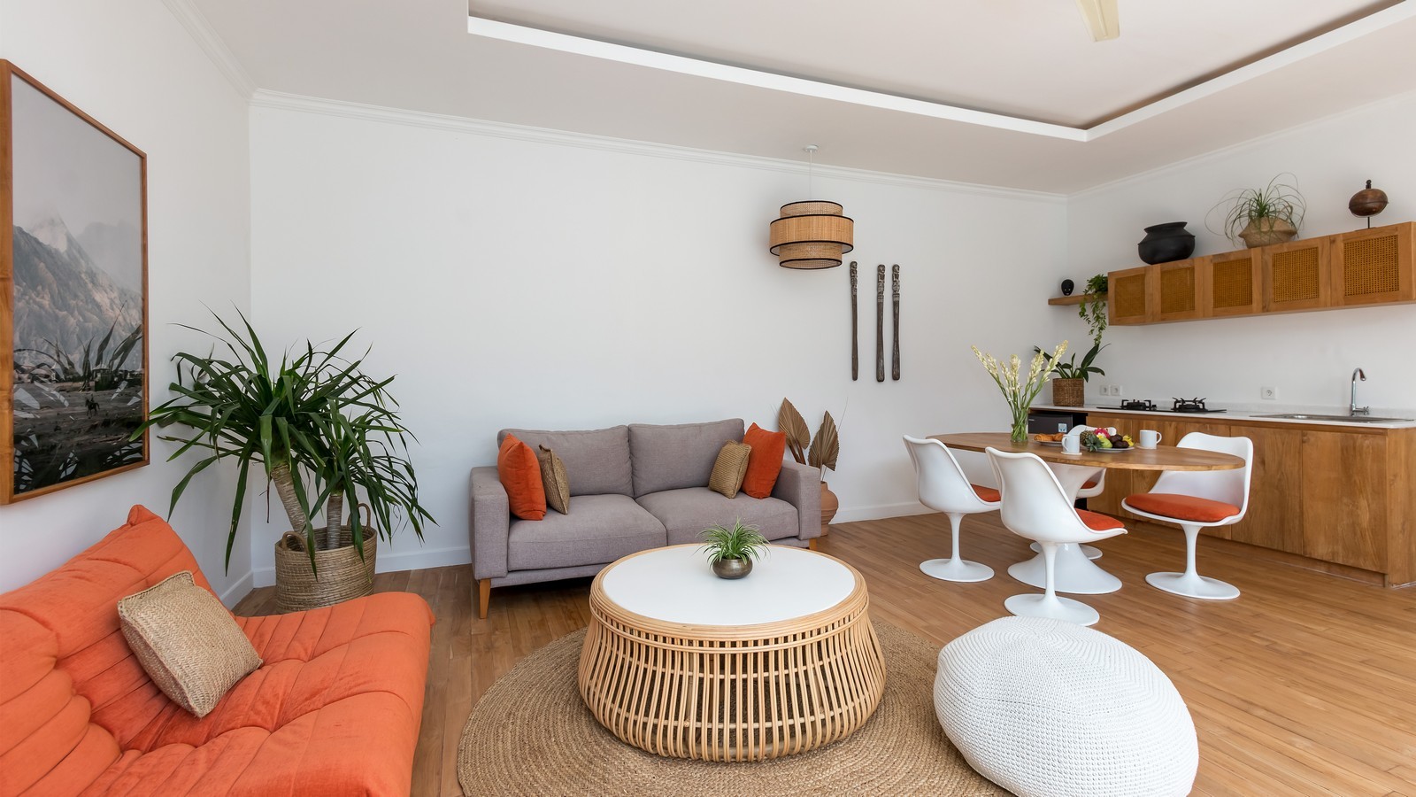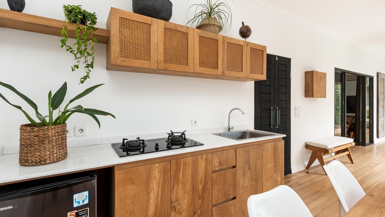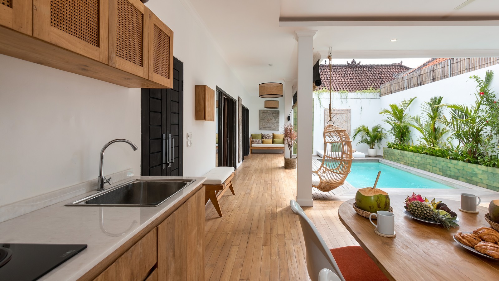 Ideally located close to Berawa beach in a quiet gang, This Villa is a chic and modern escape for a Bali adventure. With a classic Bali open plan style, there are 2 bedrooms, breezy living areas, fully equipped kitchen, sunny garden and swimming pool. Spend island days in the sun, exploring the town and lounging on the beach. Just a moment’s walk from the beach and nearby restaurants, you can visit all the best bits of town with a comfortable home to return to. Each of the bedrooms in this Villa are chic and beautiful with a boho island style. Looking out over the pool, the bedrooms both feature deluxe double beds, ensuite bathrooms and cool air-conditioning. The perfect setup for a family or couple of friends, everyone will have their own private space to relax and unwind. You can lounge back on the beds, look out over the pool and gardens, and bask in a tropical breeze. The ensuite bathrooms are modern and elegant with large mirrors, rain showers and Western facilities. You can quickly feel at home in the magnificent space. The Villa has spacious interior living areas with a breezy open-air design. There is a comfortable lounge space, fully equipped kitchen and dining area with everything you need to quickly feel at home.