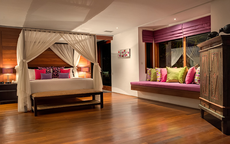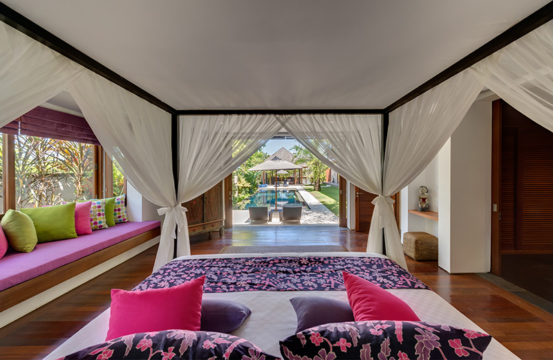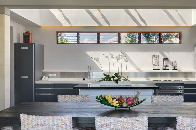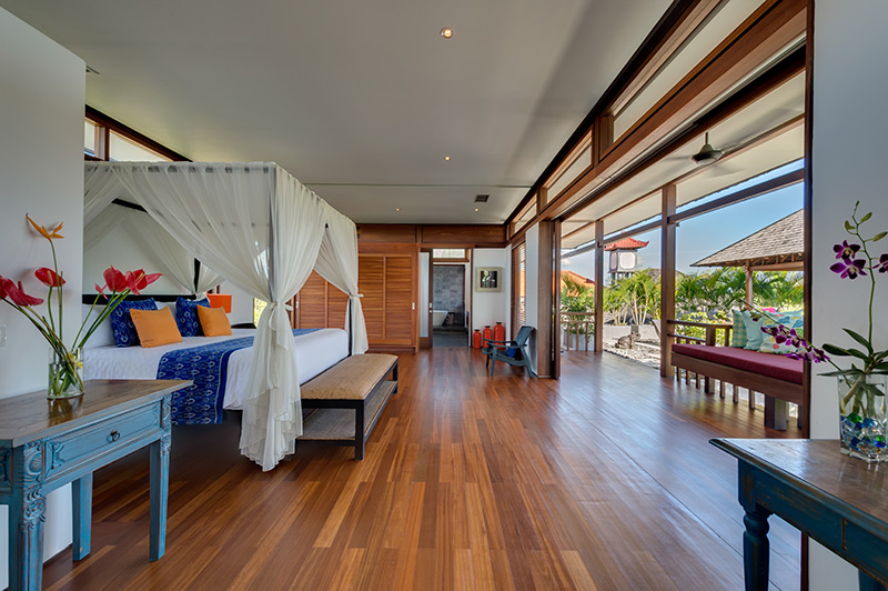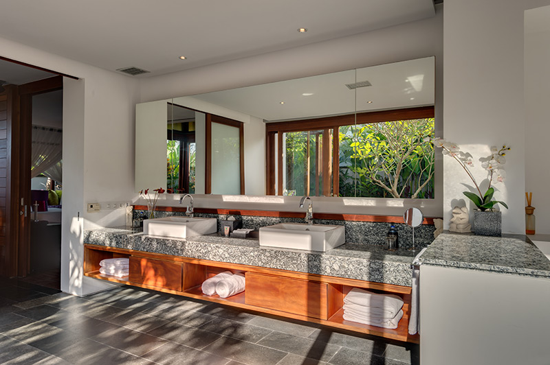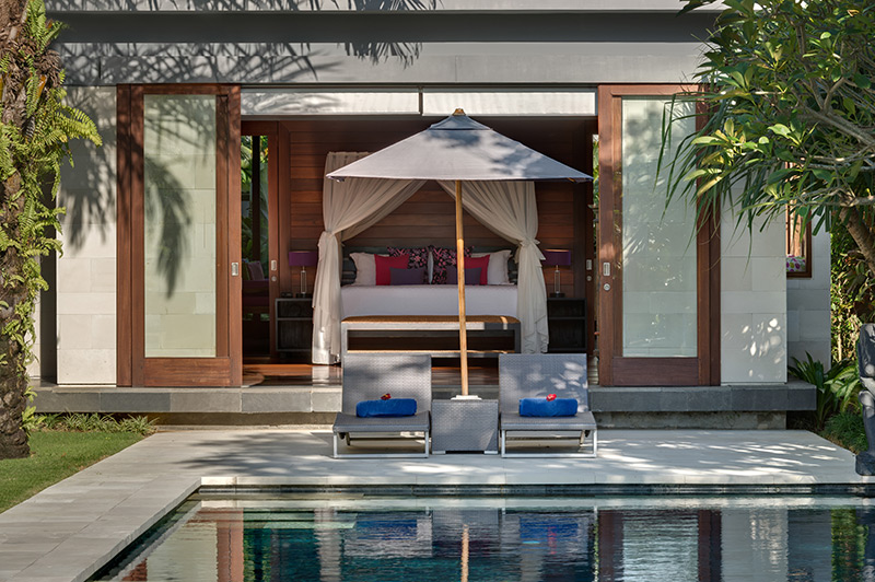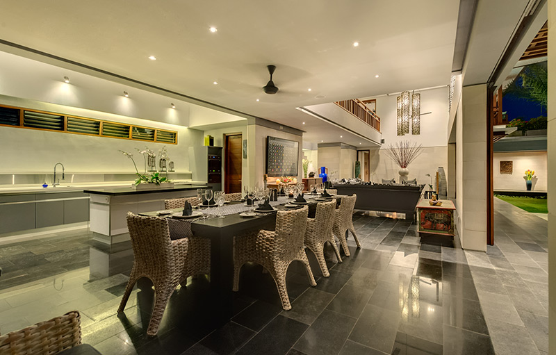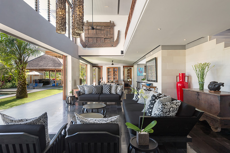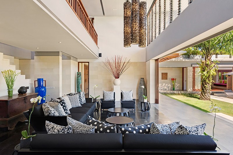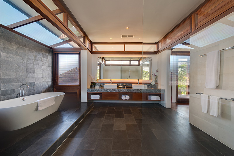 At this villa, modern Bali style, the greys of Echo Beach, the blues and whites of the sea and sky, five-star comforts and superb staff combine to create a luxury retreat in a small fishing village in Canggu. The villa greets you through antique Javanese doors before you walk across a traditional Balinese pond. A vaulted open-plan living and dining area looks out onto the lush tropical garden and the 18 x 7-metre grey slate pool. A pool balé. with an antique bar and table seating ten, is the perfect place to unwind, while a media room, complete with state-of-the-art audio and video equipment, will keep you entertained. Upstairs, a sundeck and rooftop balé provide panoramic views of the legendary Bali sunsets. The villa offers three master bedrooms each with large ensuite bathroom, while a very private master suite with its own plunge pool, sun deck and garden balé – can be added as an optional fourth room. The nearest beach is just a five-minute walk away, and Echo Beach, with its laid back restaurants and world class surfing, just a few minutes further along the sands. The chic restaurants and bars of Petitenget and Seminyak are also easily accessible. You’ll be close to the excitement but far enough away to truly enjoy the peace and tranquility of Bali.