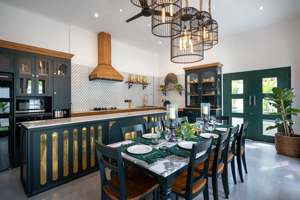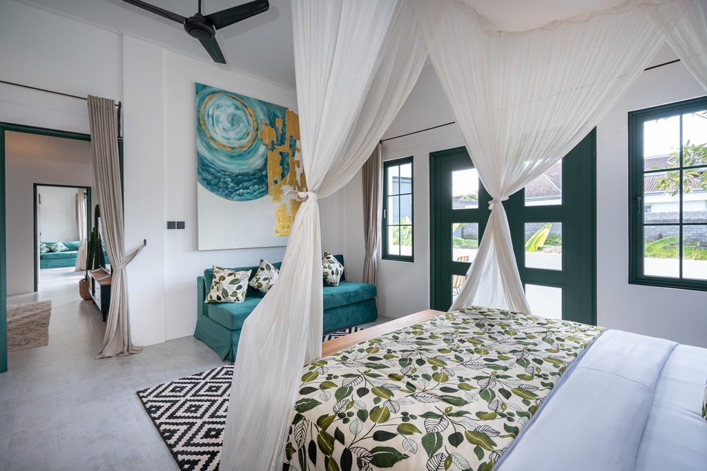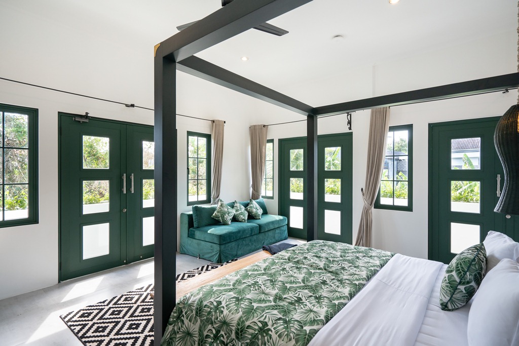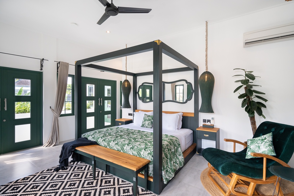 This Villa means the Green House, which explains the lively colour interiors throughout this lovely 4-bedroom luxury Berawa villa. Nestled at the end of a street fronted by paddy fields, The Villa features two sundecks, and a raised swimming pool. Dining for ten next to a grand fully equipped kitchen gives way to the lush living room in hues of cream and green. The stairs ascend to the TV room resting centre stage between all 3 first floor bedrooms, each with balconies and a view. All walls are adorned with artwork in wood, tile, and extravagant wall paper depicting verdant flora.