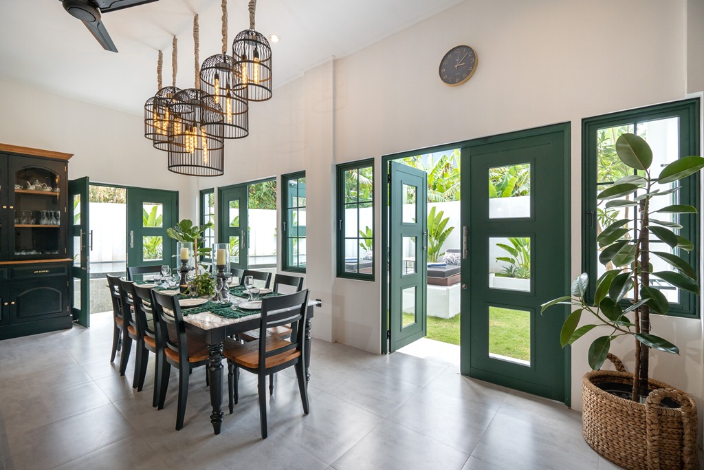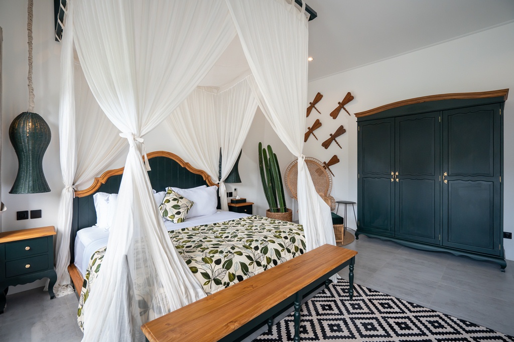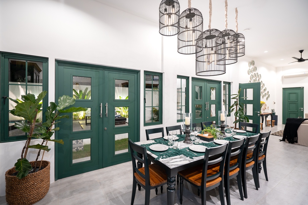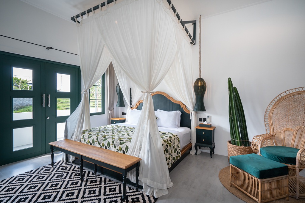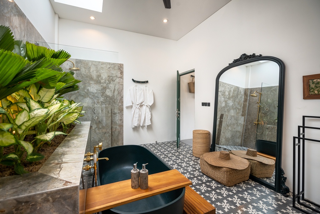 This Villa means the Green House, which explains the lively colour interiors throughout this lovely 4-bedroom luxury Berawa villa. Nestled at the end of a street fronted by paddy fields, The Villa features two sundecks, and a raised swimming pool. Dining for ten next to a grand fully equipped kitchen gives way to the lush living room in hues of cream and green. The stairs ascend to the TV room resting centre stage between all 3 first floor bedrooms, each with balconies and a view. All walls are adorned with artwork in wood, tile, and extravagant wall paper depicting verdant flora.