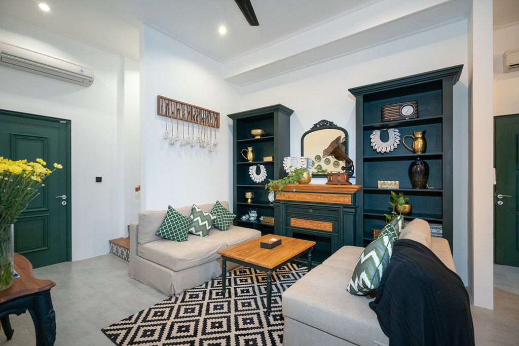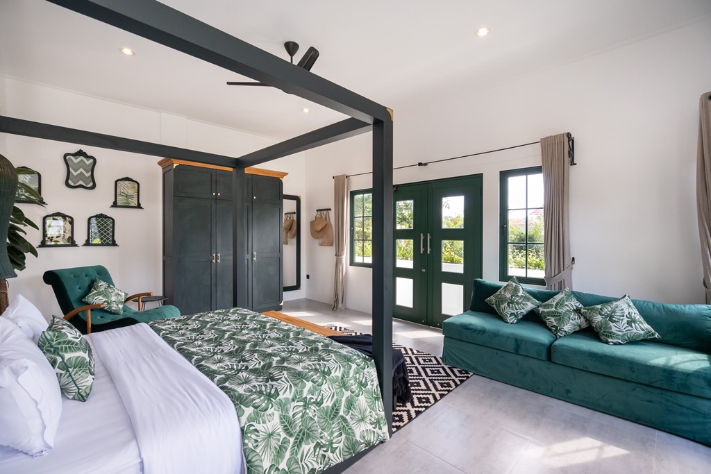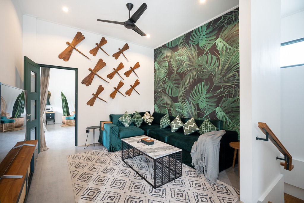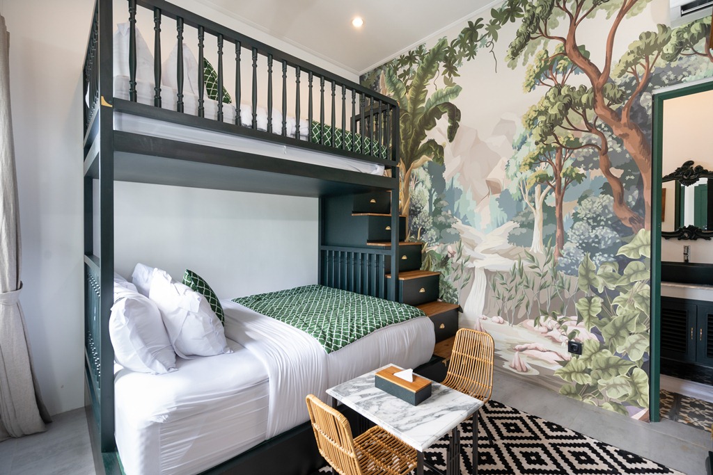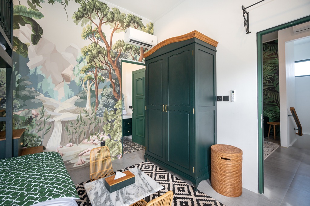 Upstairs, centered between all the bedrooms, sumptuous green sofas face the massive 65” TV. Behind the sofas, glorious dark jungle wall paper mesmerize, while the side wall is adorned in firefly woodwork. Here, green edged wood and glass doors lead off to each bedroom. All bedrooms feature ample wall artwork, with green and white bedspreads, throw pillows, hanging and storage space, ensuite bathrooms, carpets, plenty of lighting to suit different moods, the design reminiscing a tropical colonial dream.