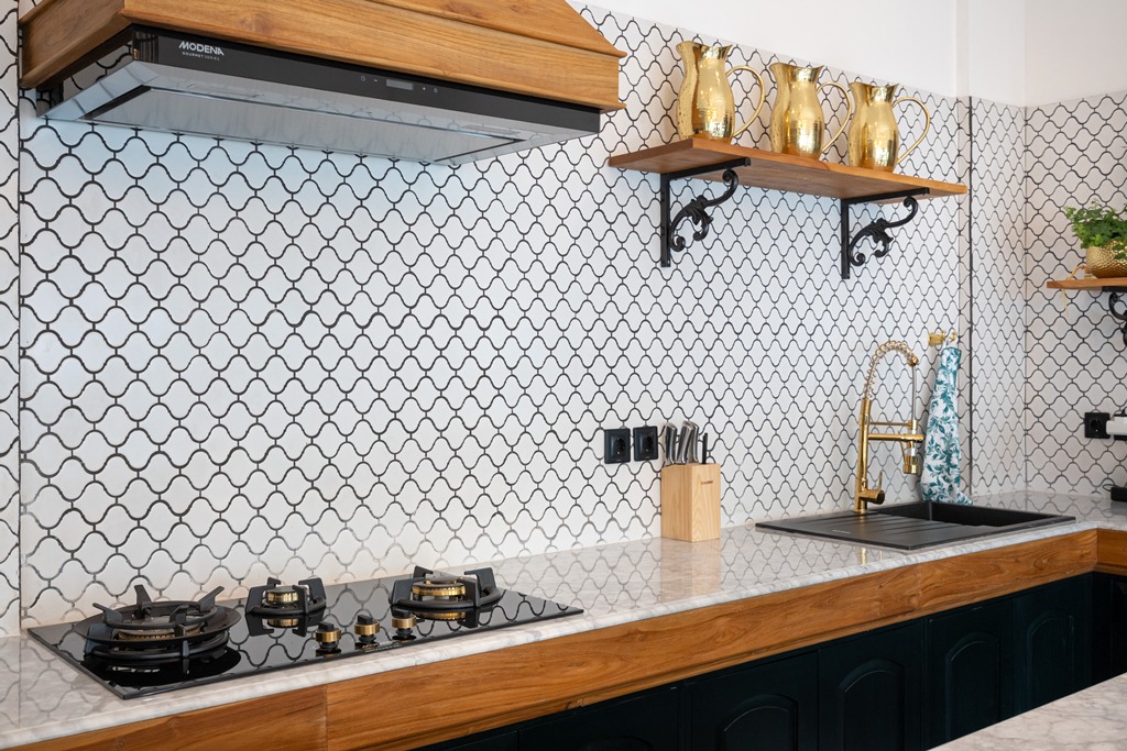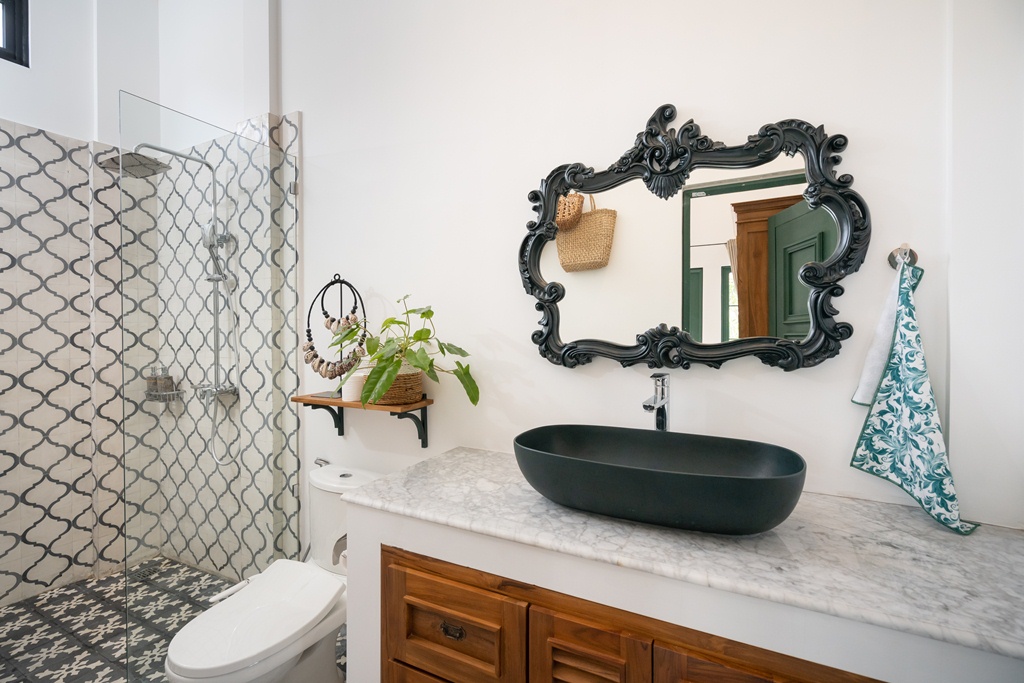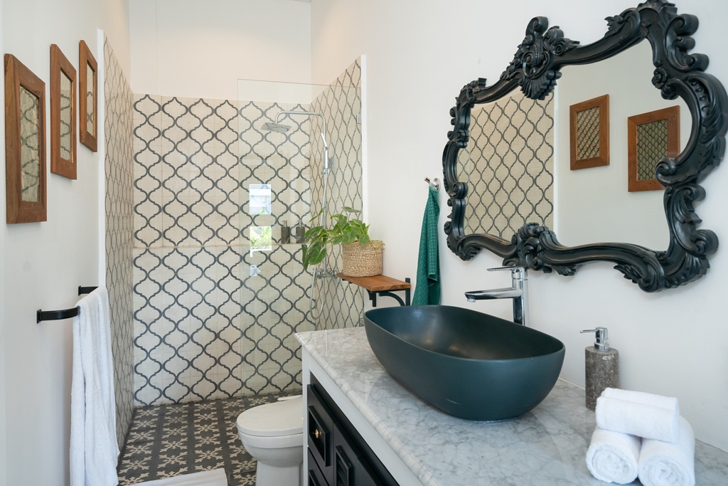 The fourth bedroom on the ground floor, leads off to one side of the living room, also in shades of white and green, with a generous ensuite bathroom showcasing vertical Moroccan style wall tiles complimented with a similar floor tile.