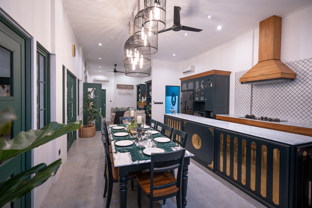 The dining table comfortably seats 10 people. The blue white tea service is eye catching, along with the glassware stocked cupboards. Further cabinets in dark green house purified water, oven, microwave and two-door fridge, with coffee plungers at attention on the shelves above.