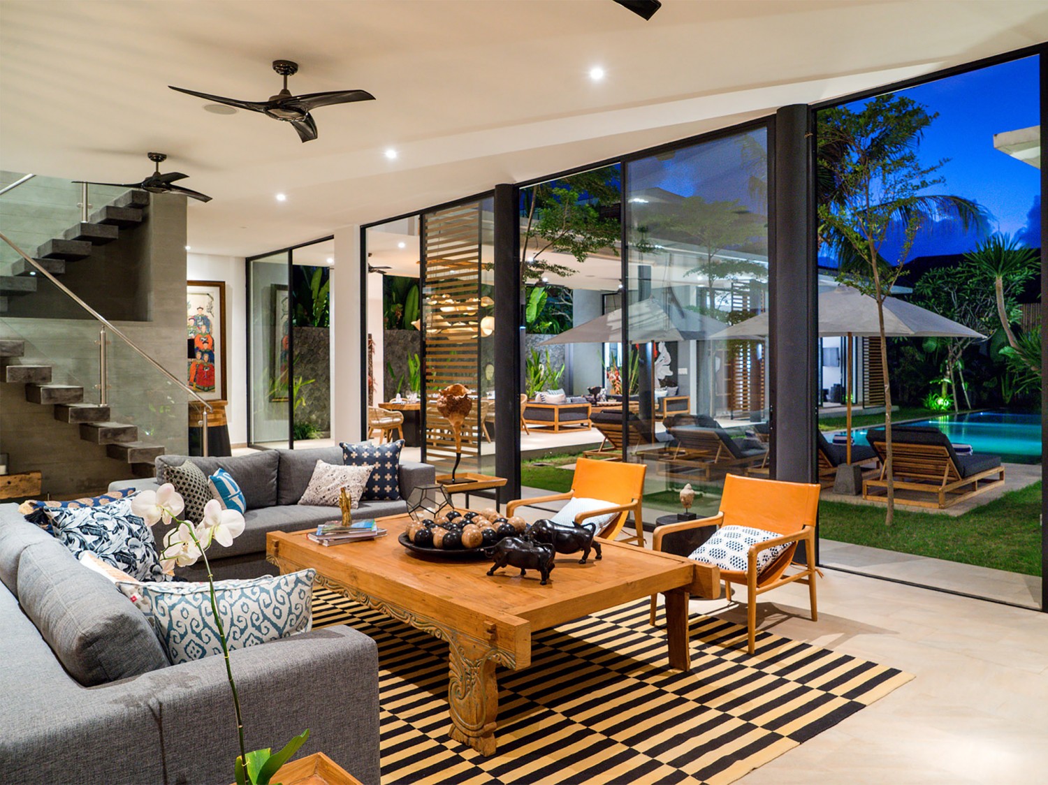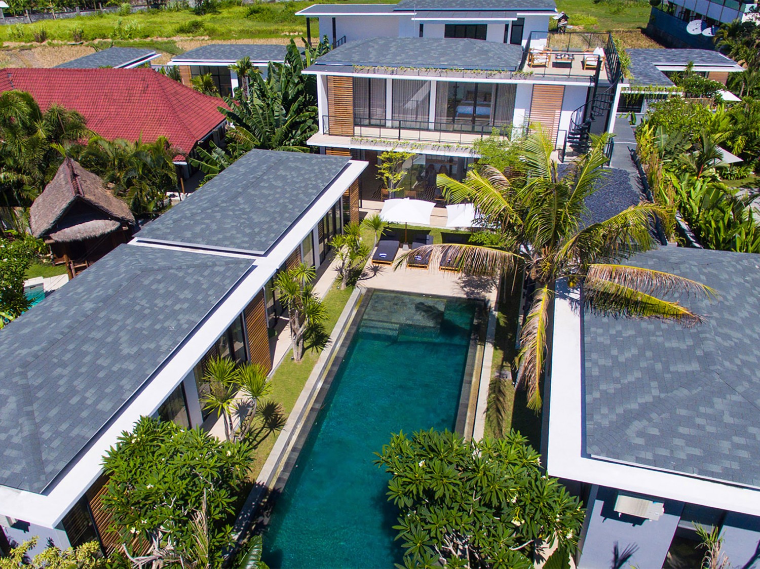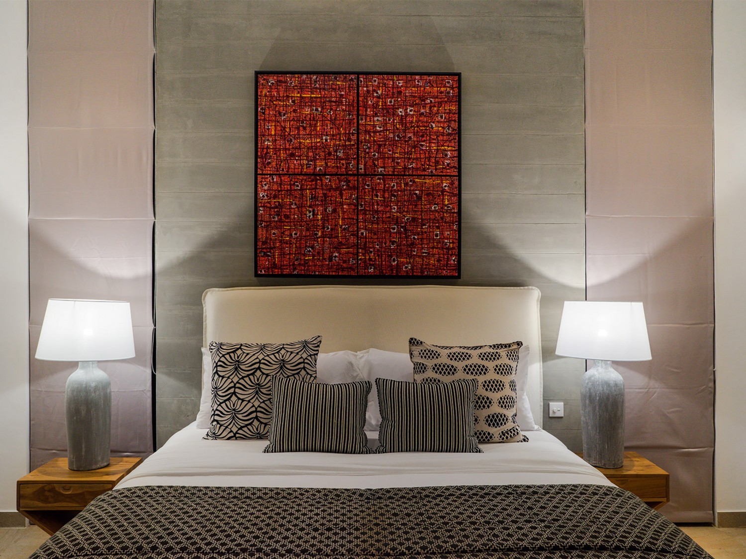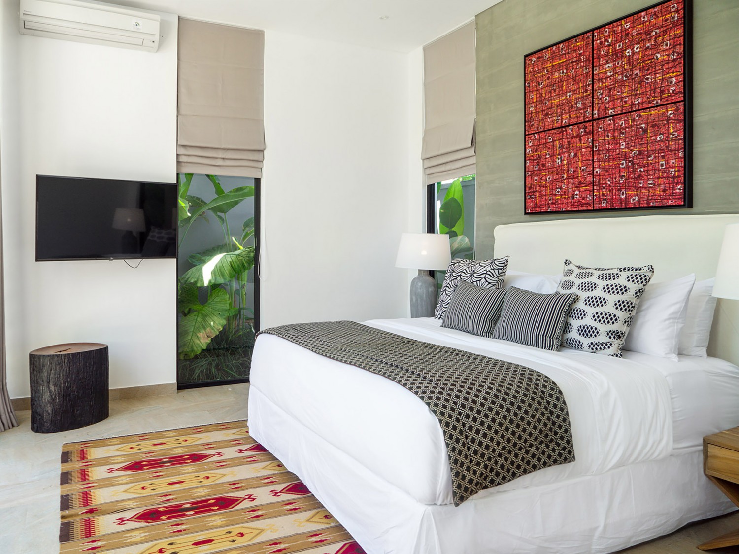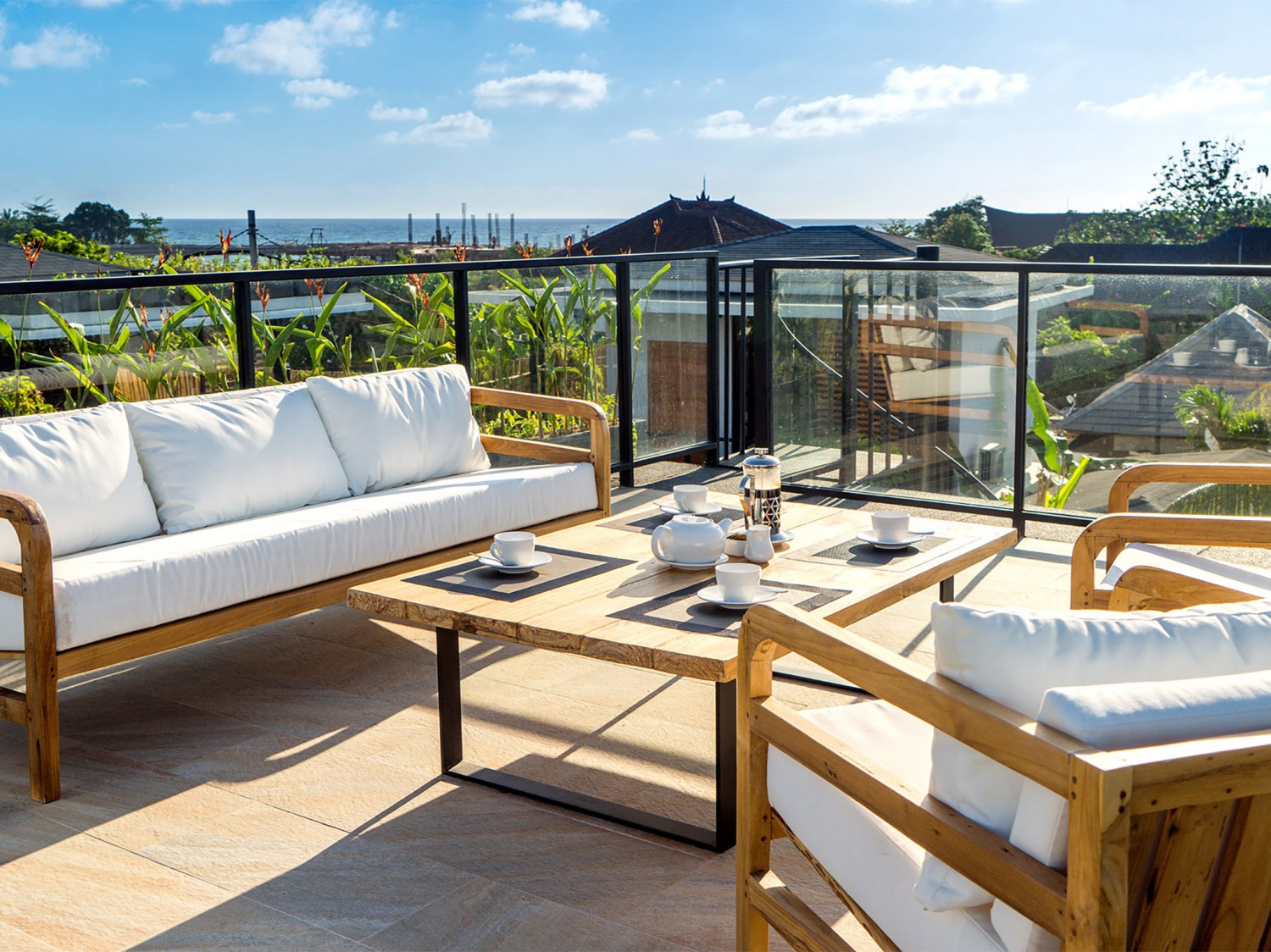 This villa is built in a U-shape around a beautiful tropical garden and swimming pool. Beyond the villa’s private entrance is a spacious lounge, a well-equipped kitchen and a guest washroom. A staircase from the lounge goes up to the first floor with its master bedroom and large terrace. A second staircase leads to the roof terrace. Beyond the lounge to the left is a beautiful outdoor dining and seating area, along with one of the guest bedrooms. The other two guest bedrooms are on the right-hand side of the pool, separated from each other by a small patio garden. The villa's lounge is furnished with comfortable sofas and features floor-to-ceiling windows and a fascinating collection of art pieces, including a number of authentic Balinese and Javanese antiques, which perfectly complement the villa’s minimalist theme. Adjacent to the lounge is a separate kitchen with all mod cons, including a wine cooler. Villa’s poolside layout gives the villa a real ‘Malibu’ feel. Windows look out either to the pool or the lush green foliage of the garden. The water feature in the outdoor dining area provides a calming vibe throughout the property. The outdoor living and dining space is a real showstopper with its dark volcanic stone wall, huge tropical leaves and massive painting featuring Japanese Koi Carp. This a wonderful spot for hanging out with loved ones or for enjoying a meal at the large solid wooden dining table. The 15 x 4-metre private pool has plenty of sunbeds – great for topping up your tan or enjoying a freshly made cocktail. You’ll also enjoy a bird’s eye view of the ocean and the surrounding rice fields from the private rooftop terrace on the second floor.