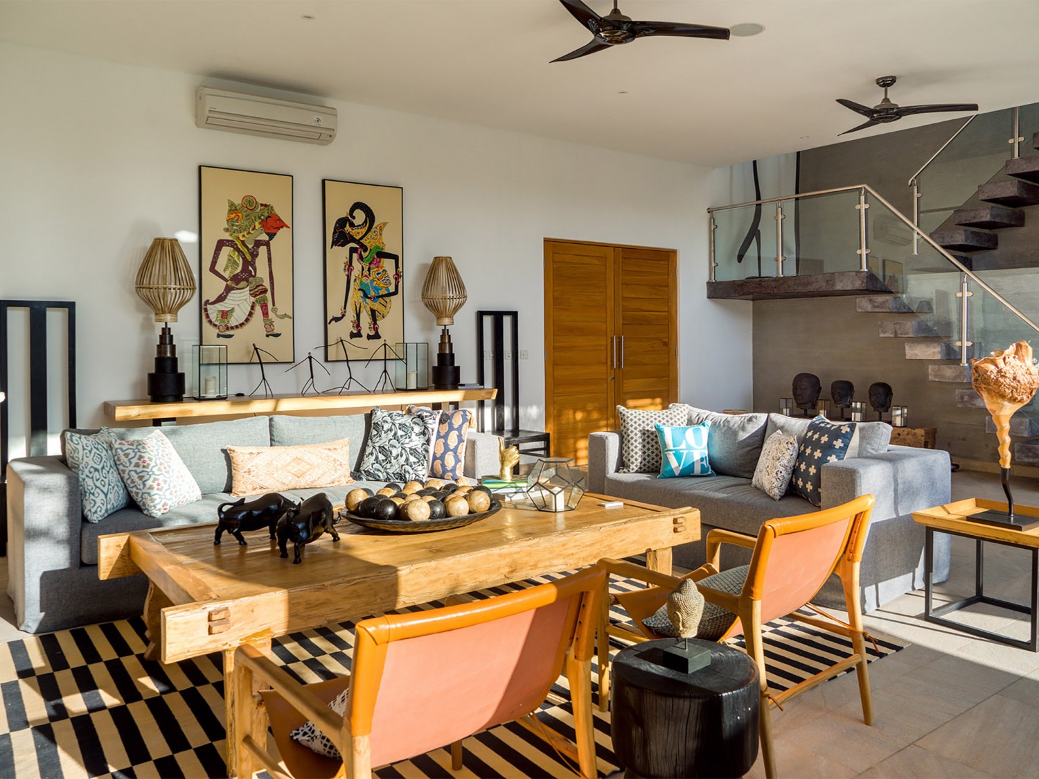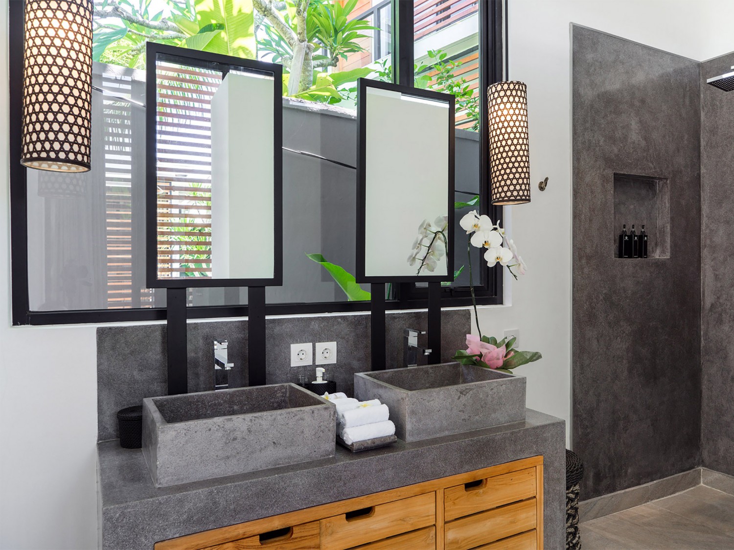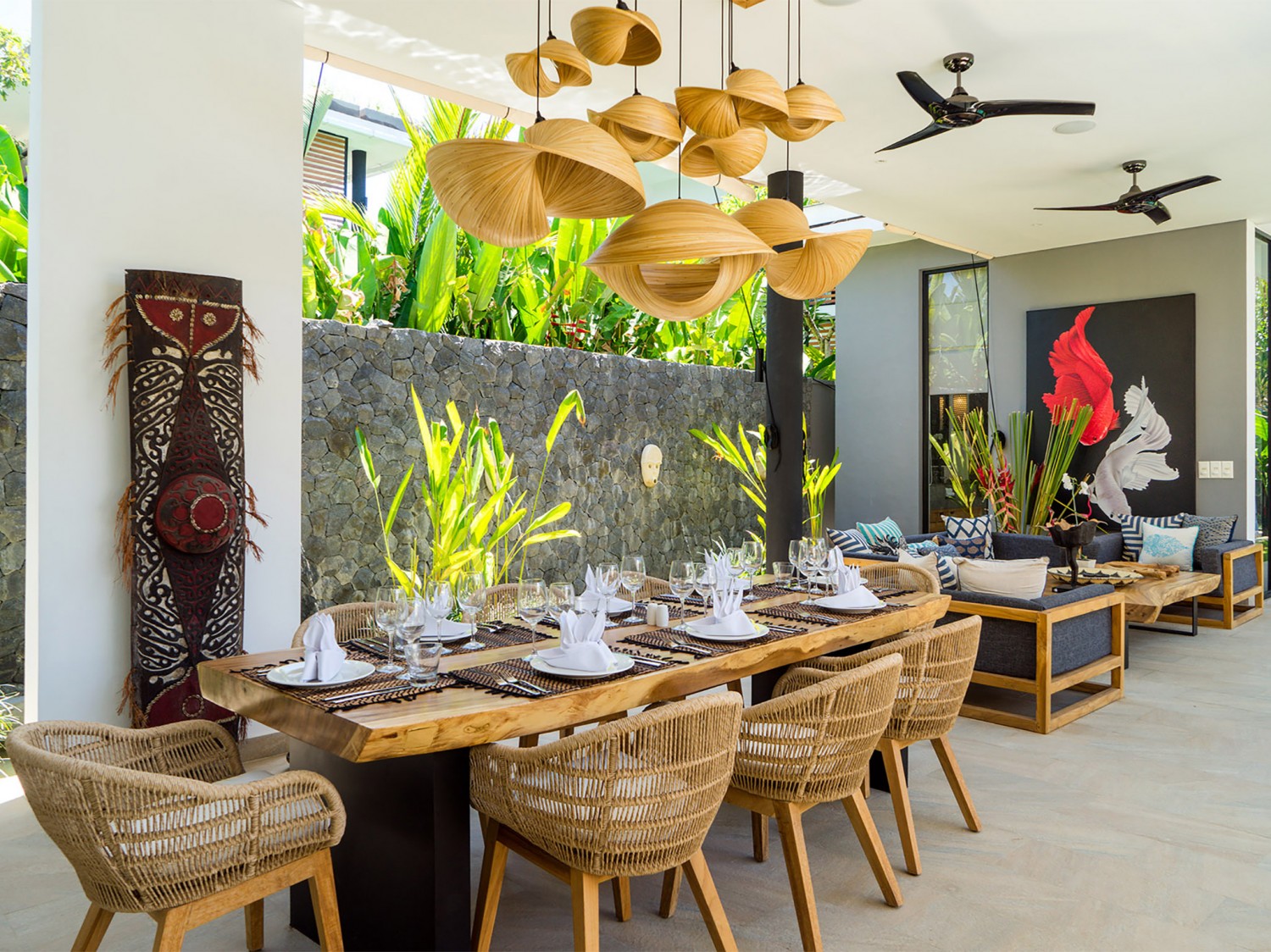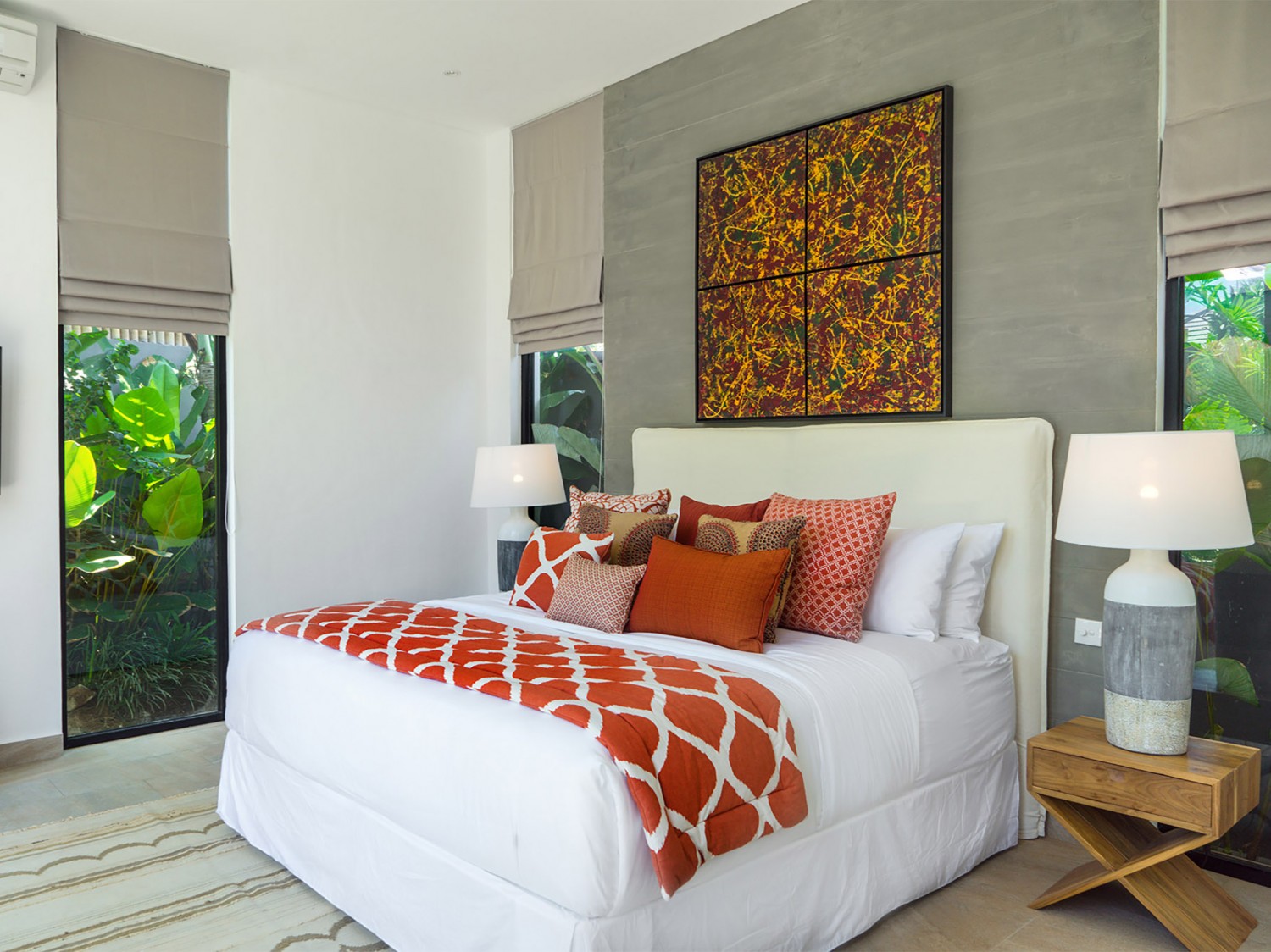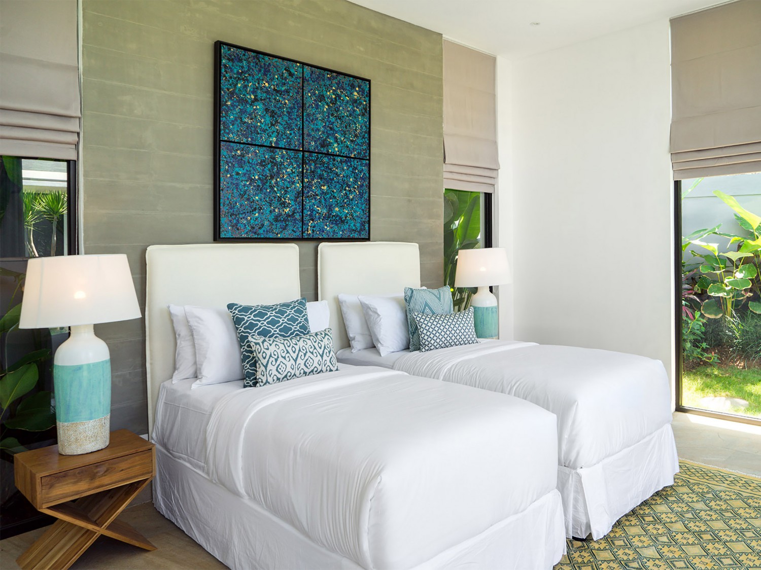 This villa is built in a U-shape around a beautiful tropical garden and swimming pool. Beyond the villa’s private entrance is a spacious lounge, a well-equipped kitchen and a guest washroom. A staircase from the lounge goes up to the first floor with its master bedroom and large terrace. A second staircase leads to the roof terrace. Beyond the lounge to the left is a beautiful outdoor dining and seating area, along with one of the guest bedrooms. The other two guest bedrooms are on the right-hand side of the pool, separated from each other by a small patio garden. The villa's lounge is furnished with comfortable sofas and features floor-to-ceiling windows and a fascinating collection of art pieces, including a number of authentic Balinese and Javanese antiques, which perfectly complement the villa’s minimalist theme. Adjacent to the lounge is a separate kitchen with all mod cons, including a wine cooler. Villa’s poolside layout gives the villa a real ‘Malibu’ feel. Windows look out either to the pool or the lush green foliage of the garden. The water feature in the outdoor dining area provides a calming vibe throughout the property. The outdoor living and dining space is a real showstopper with its dark volcanic stone wall, huge tropical leaves and massive painting featuring Japanese Koi Carp. This a wonderful spot for hanging out with loved ones or for enjoying a meal at the large solid wooden dining table. The 15 x 4-metre private pool has plenty of sunbeds – great for topping up your tan or enjoying a freshly made cocktail. You’ll also enjoy a bird’s eye view of the ocean and the surrounding rice fields from the private rooftop terrace on the second floor.