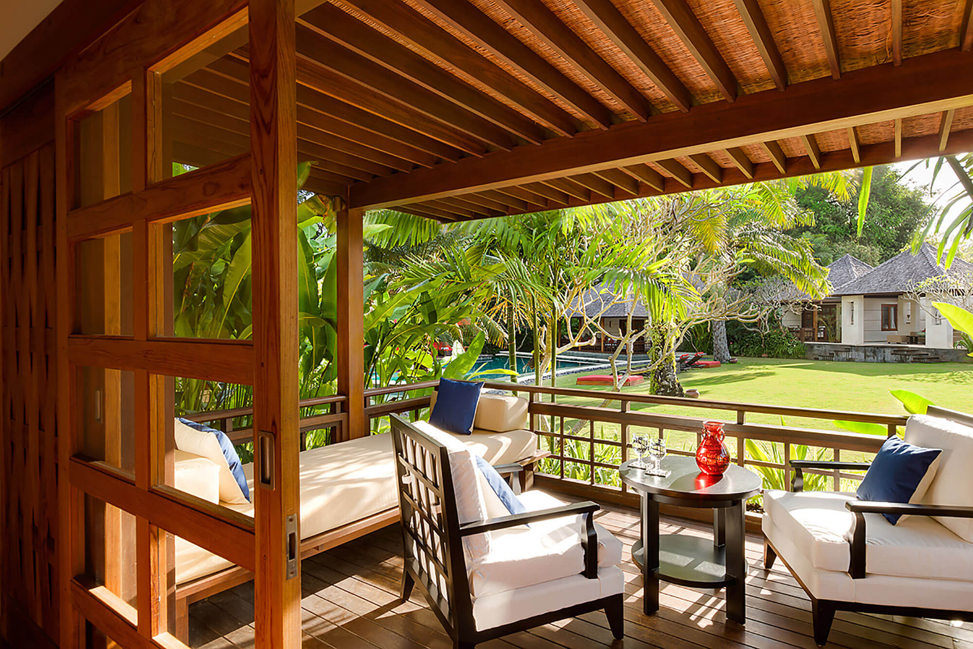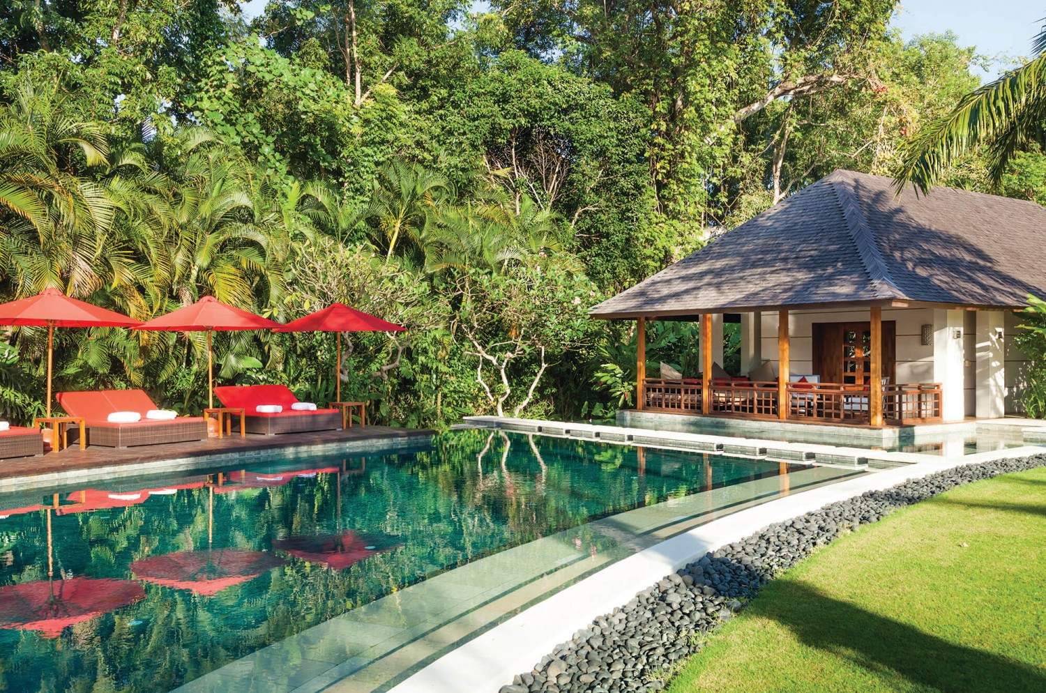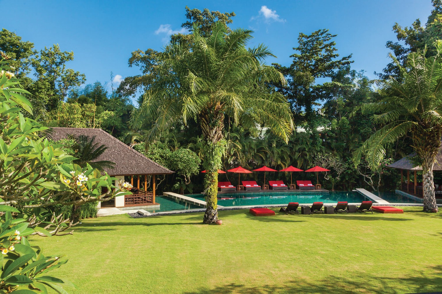 The villa comprises a dozen living and sleeping pavilions loosely arranged in a U-shape within the 6,500-metre gardens, fanning out from the lawn and 21-metre swimming pool. From the entrance, a path leads to the open-sided living pavilion and, beyond an alfresco decked sitting area, the dining pavilion, with a western kitchen behind, a guest washroom, and steps to the media room above. Mirrored on either side of the lawn are two guest bedroom pavilions with open-sided lounges in between, and the two master bedroom pavilions facing each other across the length of the pool. In the recreation area bordered by rice fields is a tennis court and bale, mini football field, and a gym.