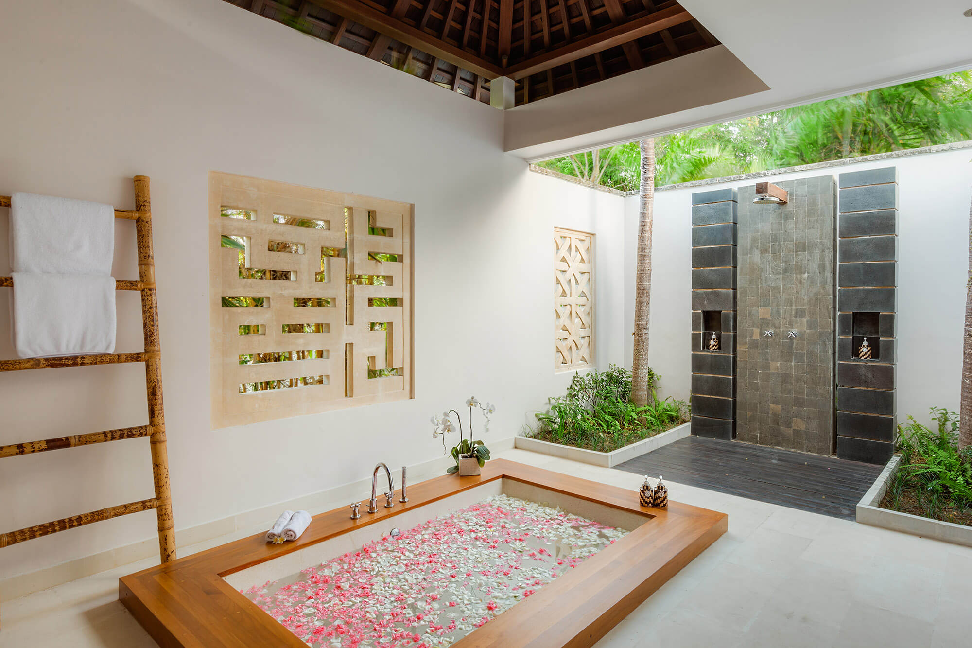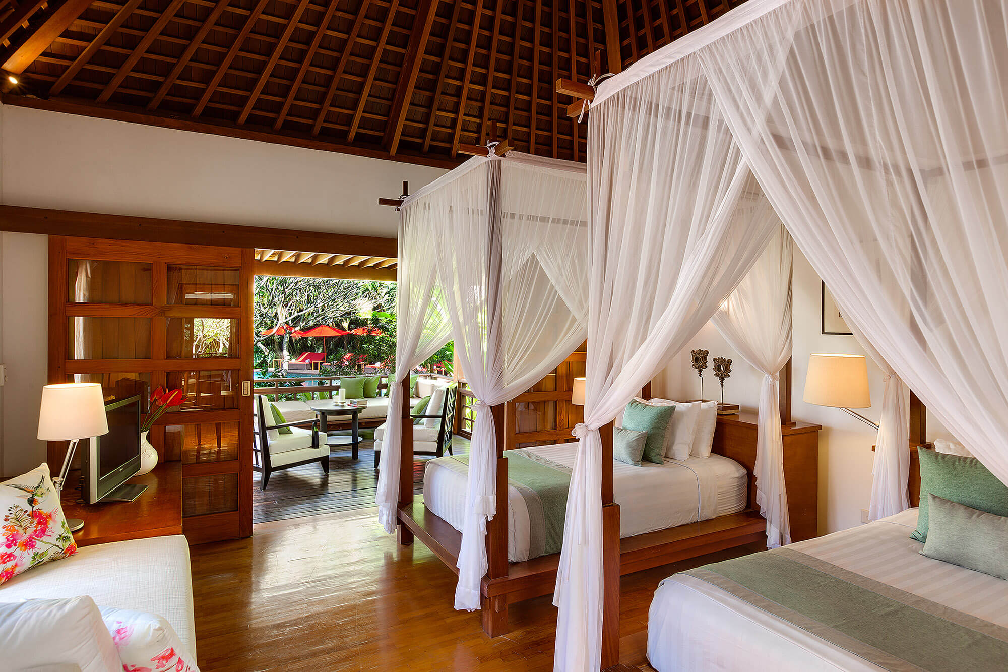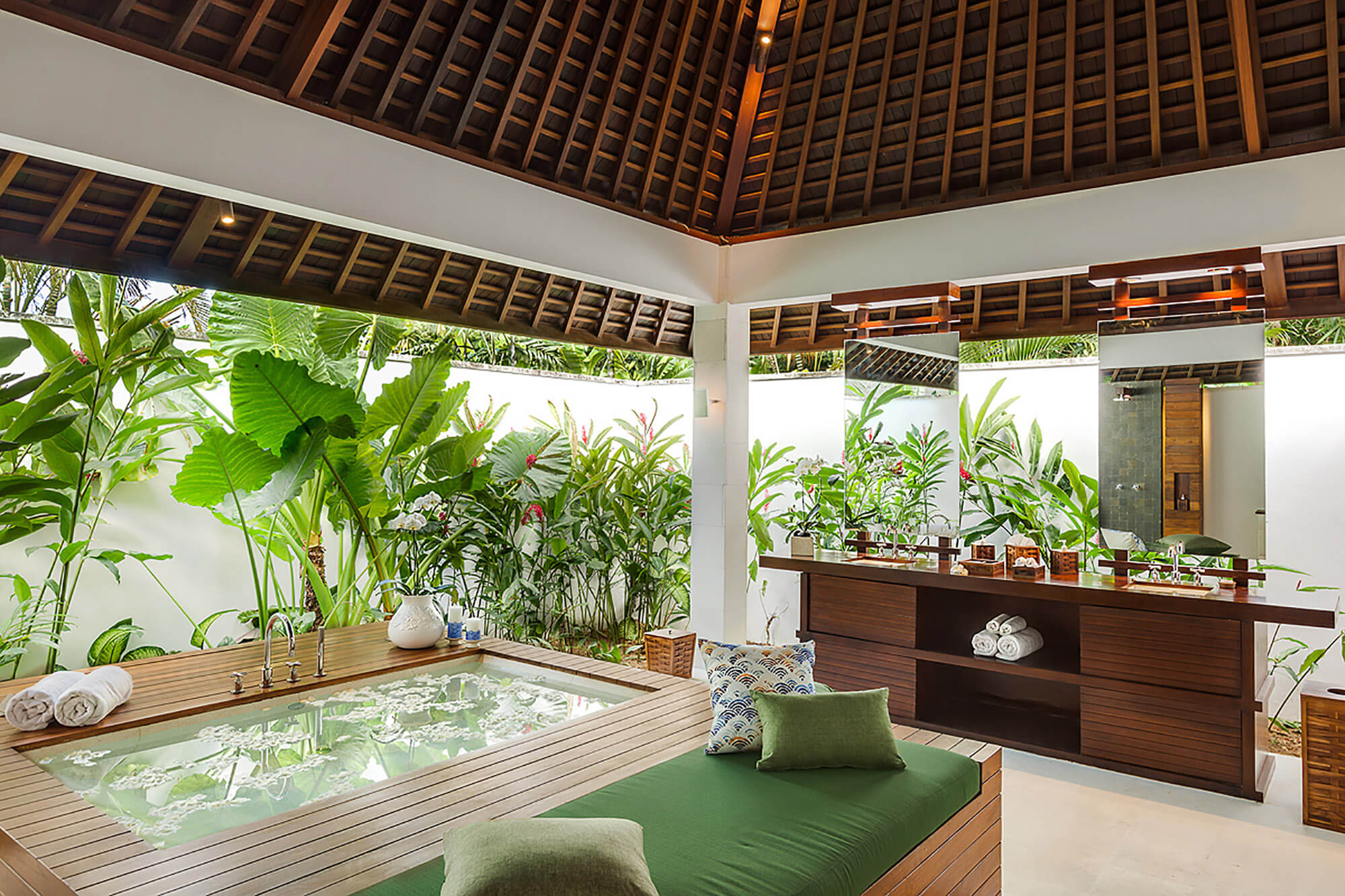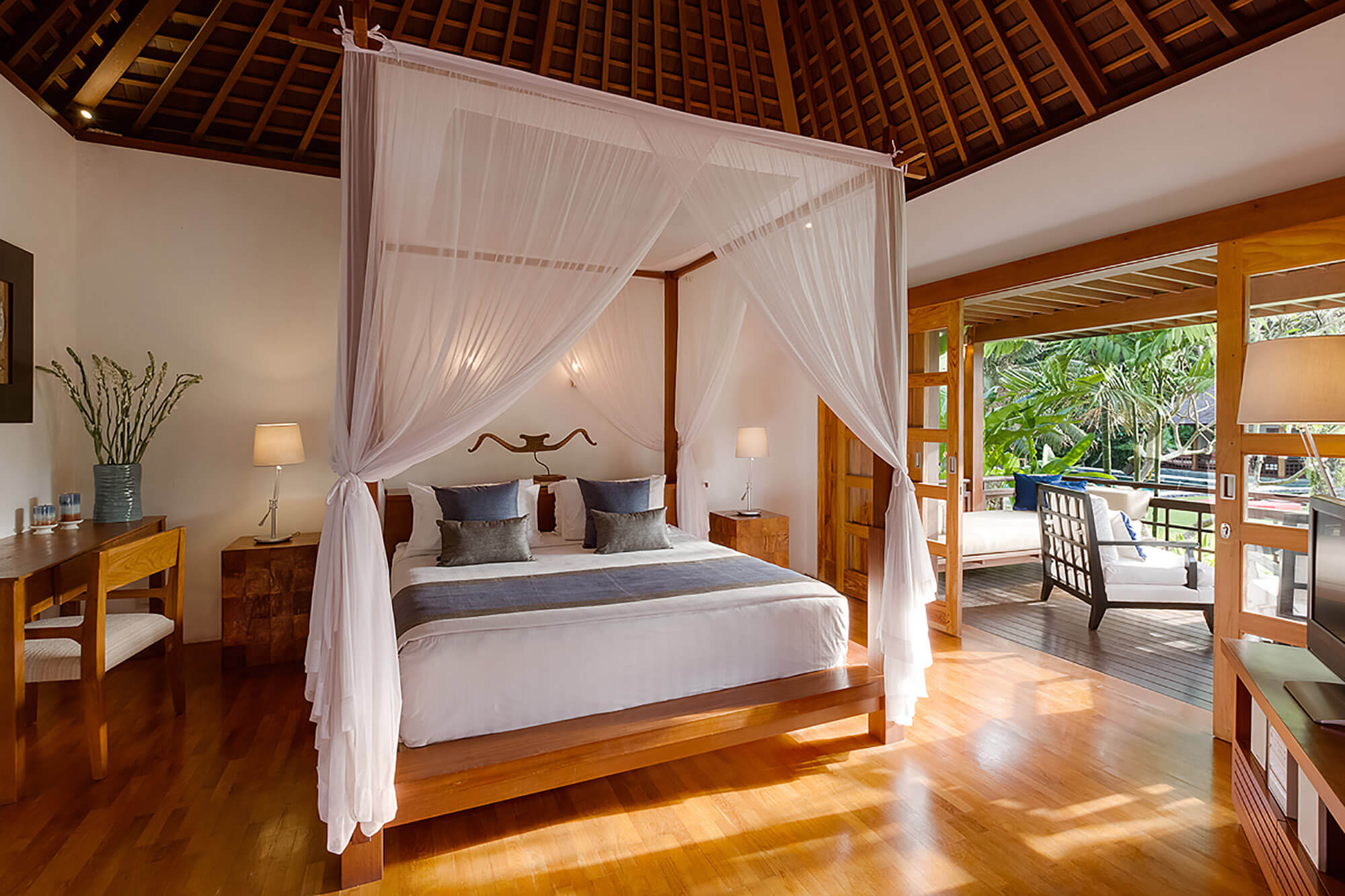 The villa comprises a dozen living and sleeping pavilions loosely arranged in a U-shape within the 6,500-metre gardens, fanning out from the lawn and 21-metre swimming pool. From the entrance, a path leads to the open-sided living pavilion and, beyond an alfresco decked sitting area, the dining pavilion, with a western kitchen behind, a guest washroom, and steps to the media room above. Mirrored on either side of the lawn are two guest bedroom pavilions with open-sided lounges in between, and the two master bedroom pavilions facing each other across the length of the pool. In the recreation area bordered by rice fields is a tennis court and bale, mini football field, and a gym.