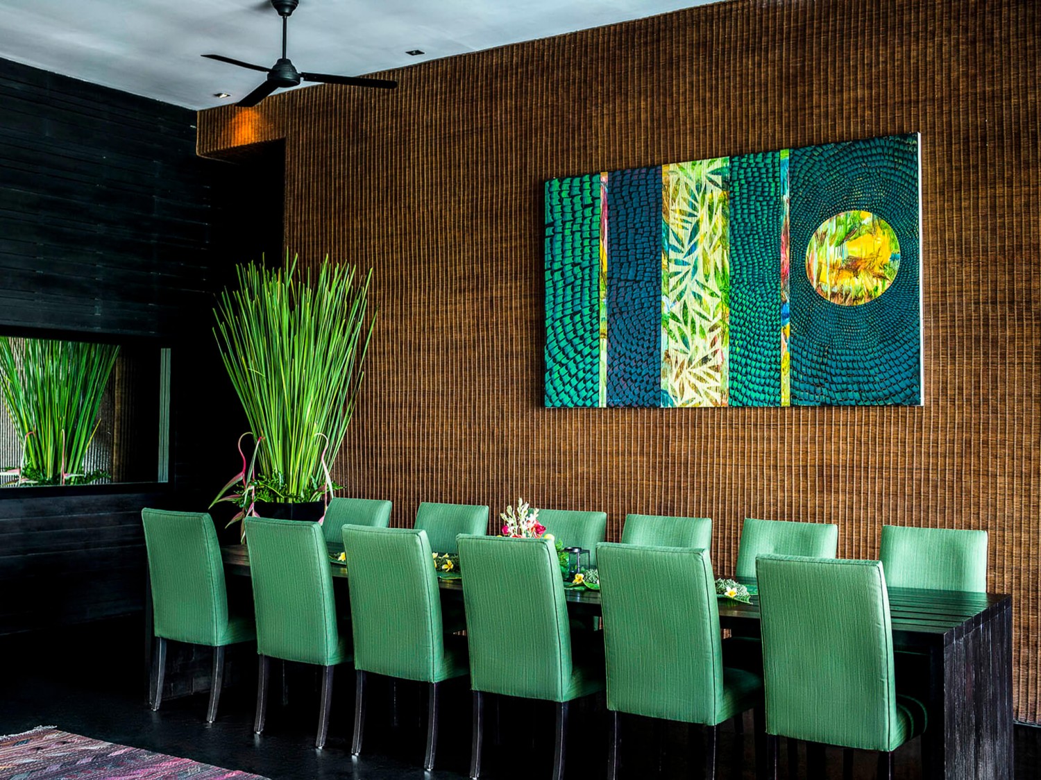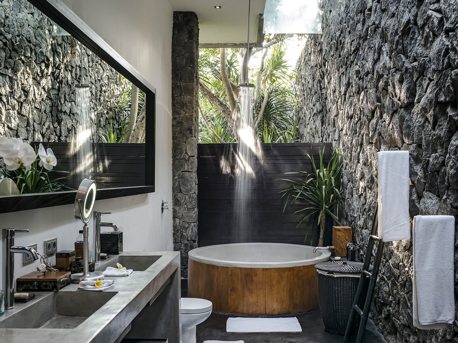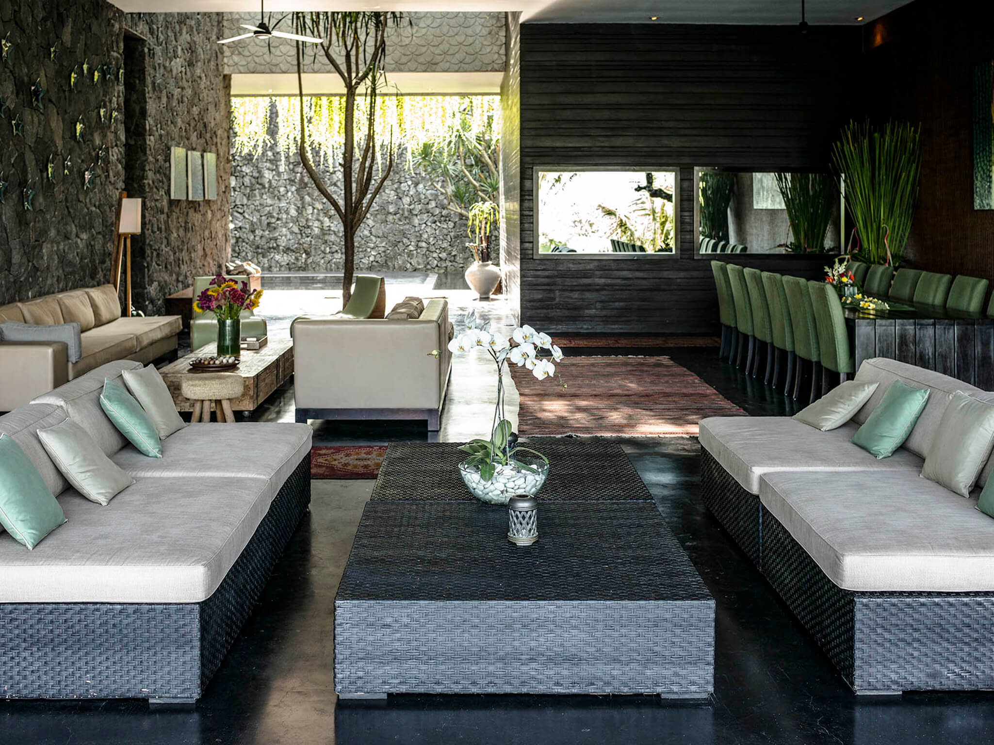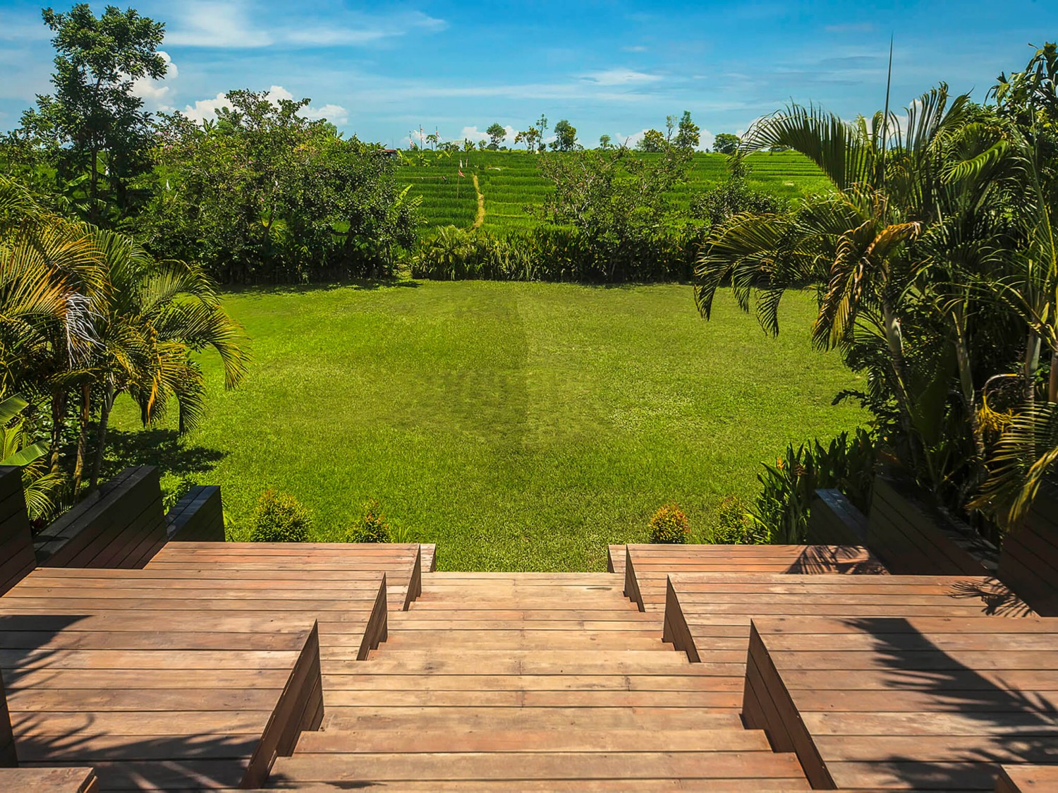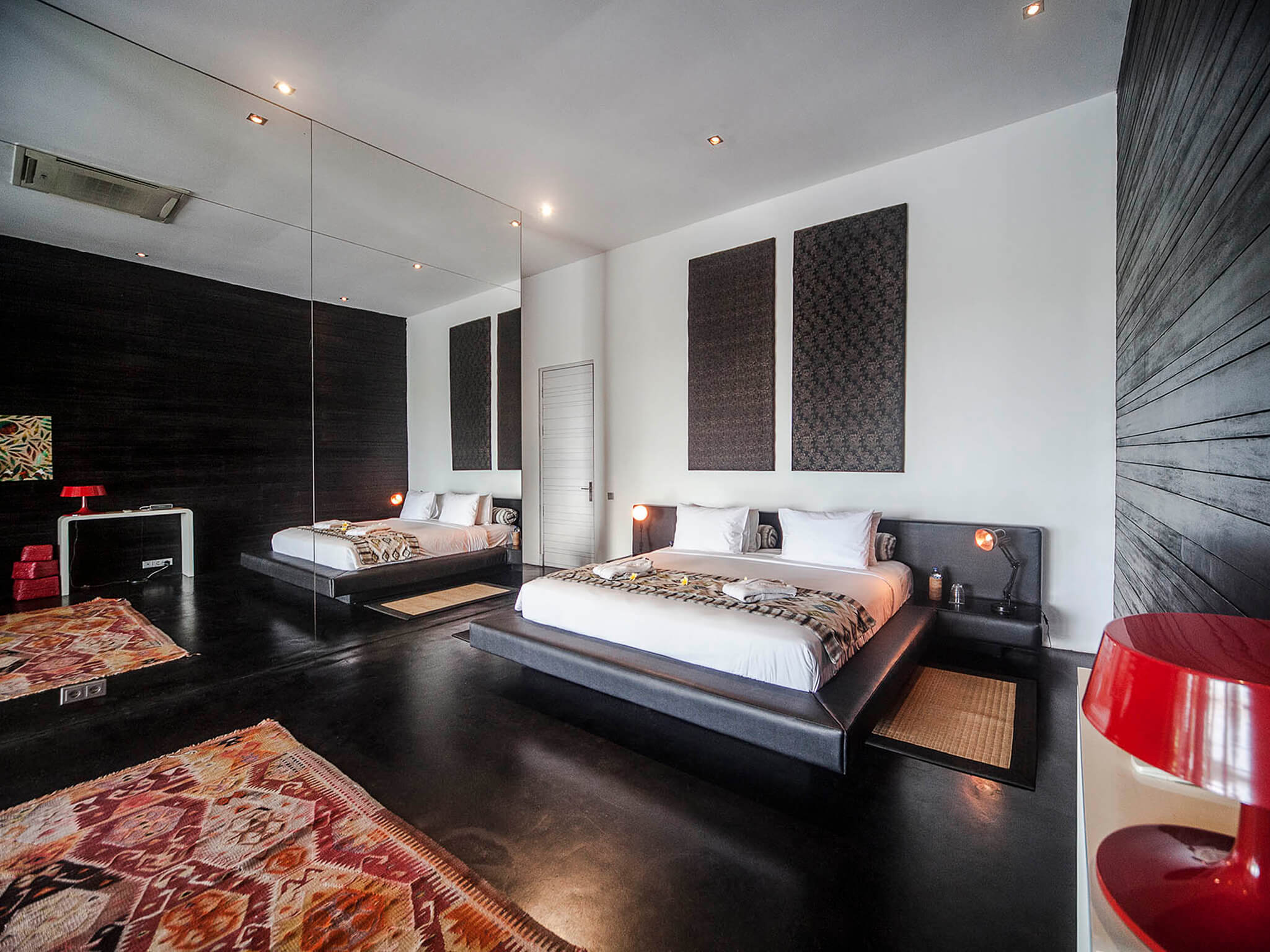 This Villa is super-sized. Its generous proportions are obvious from the moment you cross the shallow pool marking its zen-serene entrance. Soaring ceilings, walls of glass opening onto expansive terraces, multiple media rooms – the sheer amount of living space is peerless, and completely in keeping with the villa’s magnificent 180-degree rice field panorama. Uncompromisingly modern, with clean lines, contemporary furnishings and a strong colour scheme, this villa makes abundant use of local natural materials, with striking walls of rough river stone, woven rattan and tropical woods. Brightly coloured kilim rugs and plushly upholstered sofas scattered across the black concrete floors bring boho-chic to the minimalist interiors. This is indoor-outdoor living at its best, focused on the 17-metre infinity pool and ‘football-pitch’ garden below. Luxury extras like Bose sound systems, iPod docks in every room and bathtubs big enough for two raise the bar on villa living. With seven large bedroom suites and seemingly acres of multi-level open and enclosed living areas, This Villa is perfect for extended families or groups of friends who love holidaying together yet appreciate having their own breathing space and the support of full-time staff, including a resident cook to take care of all meals. With its large lawn, rooftop terrace and glorious rice field outlook, the villa is also an idyllic wedding venue. One of the delights of staying at this Villa is exploring the traditional villages in the area and dipping into local rural and religious life. Six bicycles are available for your use, an eco-friendly and healthy way to visit the black sand beach and famed surf breaks just three kilometres away.