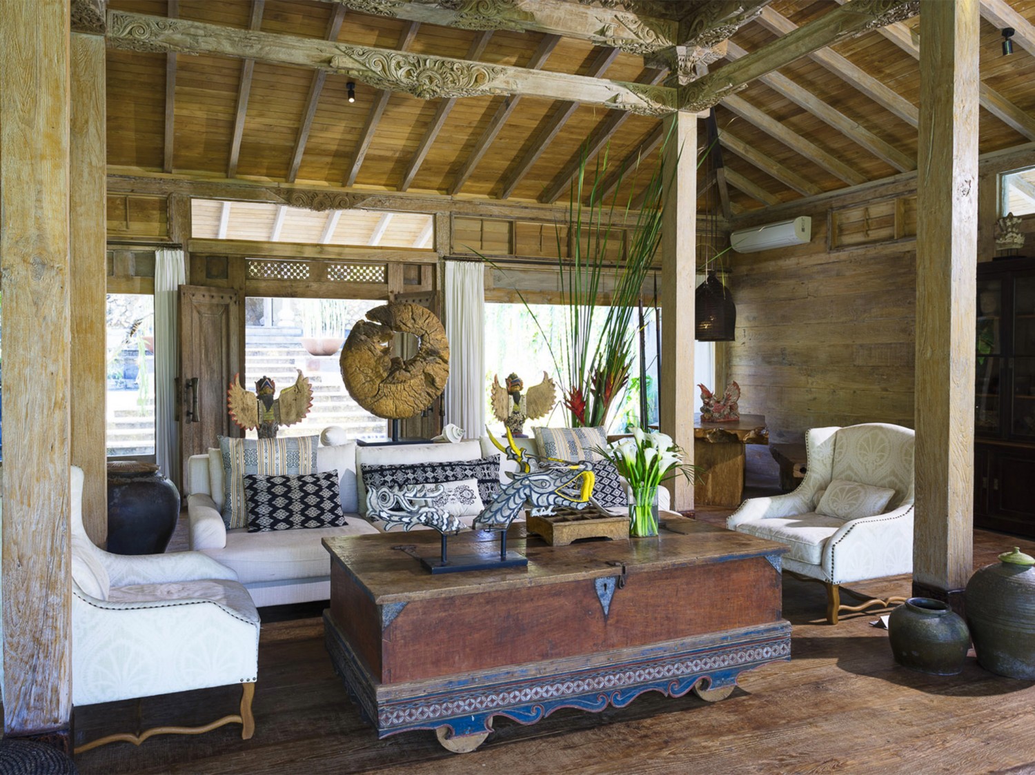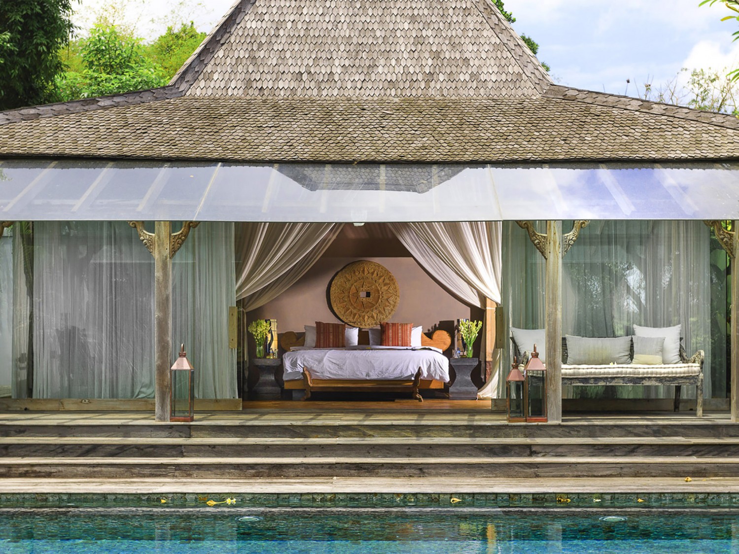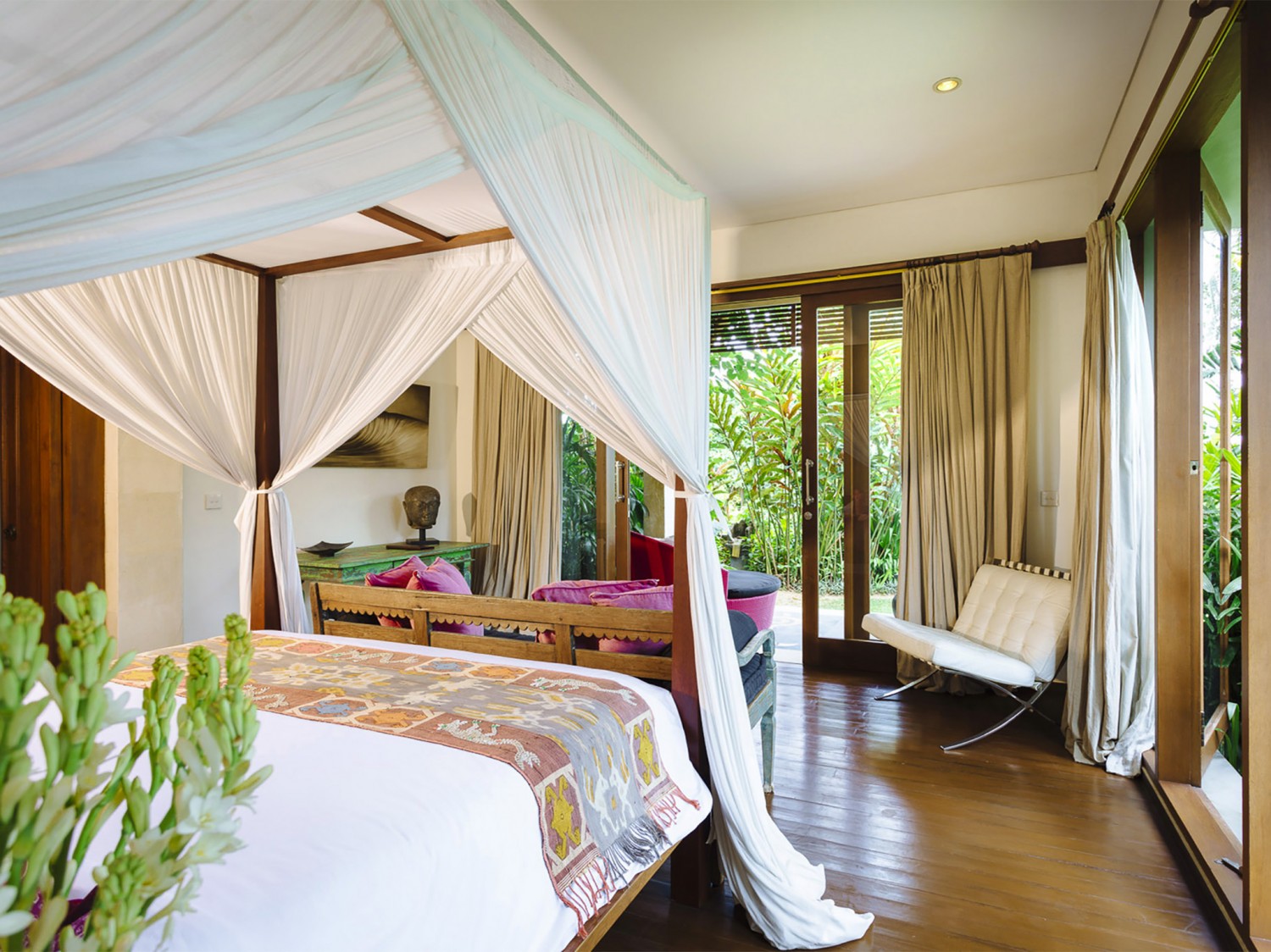 The seductively exotic this villa lays claim to an exclusive riverside position overlooking south-west Bali’s luscious rice terraces. This luxurious private villa is set in the beautiful village of Pererenan, where bohemian cafés meet traditional Balinese life within a stone’s throw of the ever-popular Echo Beach and its revered surf break. A chic contemporary pavilion and antique timber joglos elegantly adapted for luxury living house this villa's seven bedrooms. Sweeping lawns, gorgeous tropical gardens, two swimming pools and dining areas, a barbecue and billiard balé, yoga studio, garden grottos and a full team of professional staff coalesce to create a chilled and extravagant habitat. Seven luxurious bedrooms are spaced throughout the estate, providing an ideal arrangement for extended families or groups of friends to enjoy blissful privacy. Expansive lawns separate the buildings, dotted with shady daybeds set within the established tropical gardens that also forge secluded spaces. At the centre of this villa is an 16-metre swimming pool, which is crowned by an open-fronted entertainment space and bordered by sun loungers, cushioned daybeds and a freshwater shower carved from stone. Beyond the pool a large balé with charming views of the river and surrounding rice fields houses a pool table, abundant seating and a barbecue.