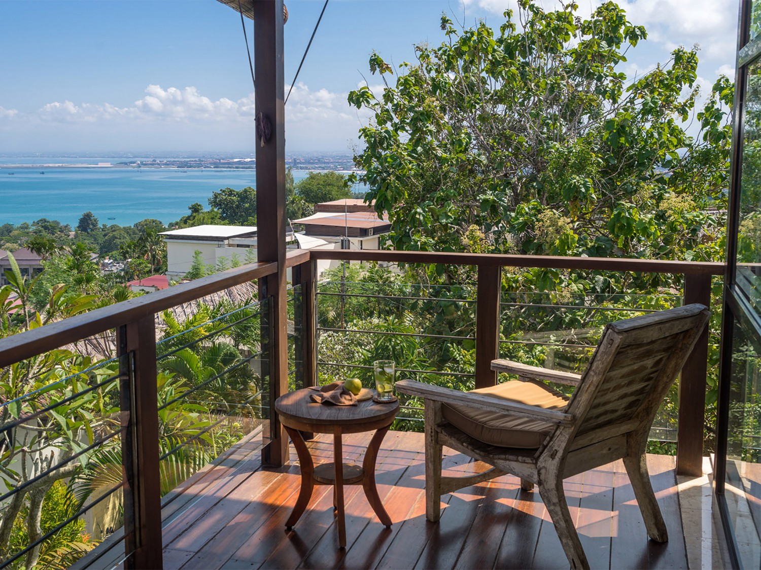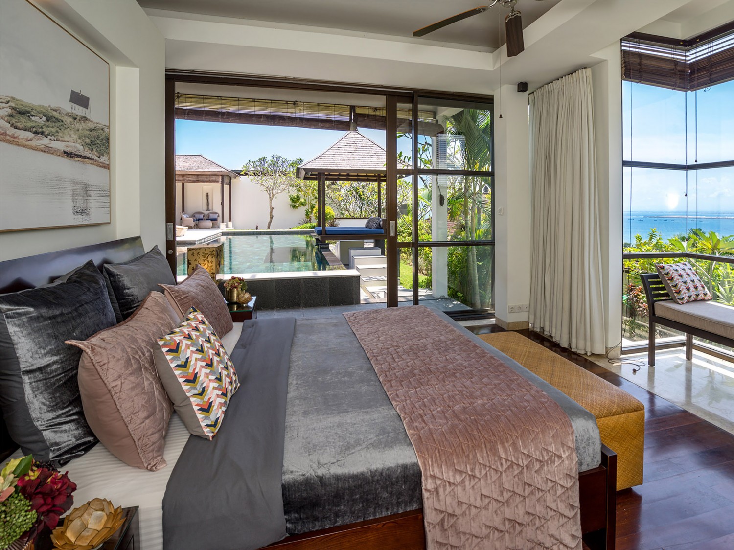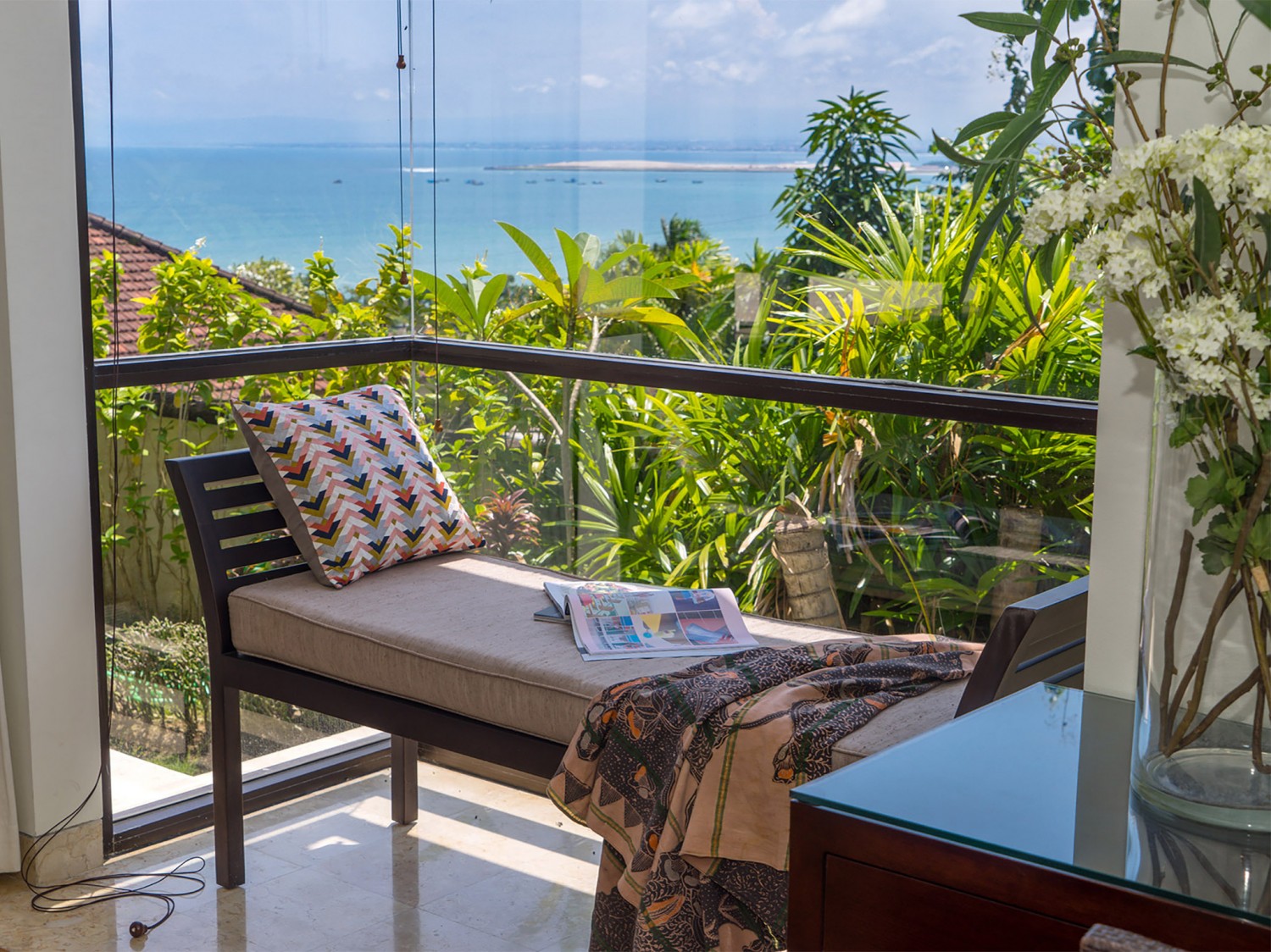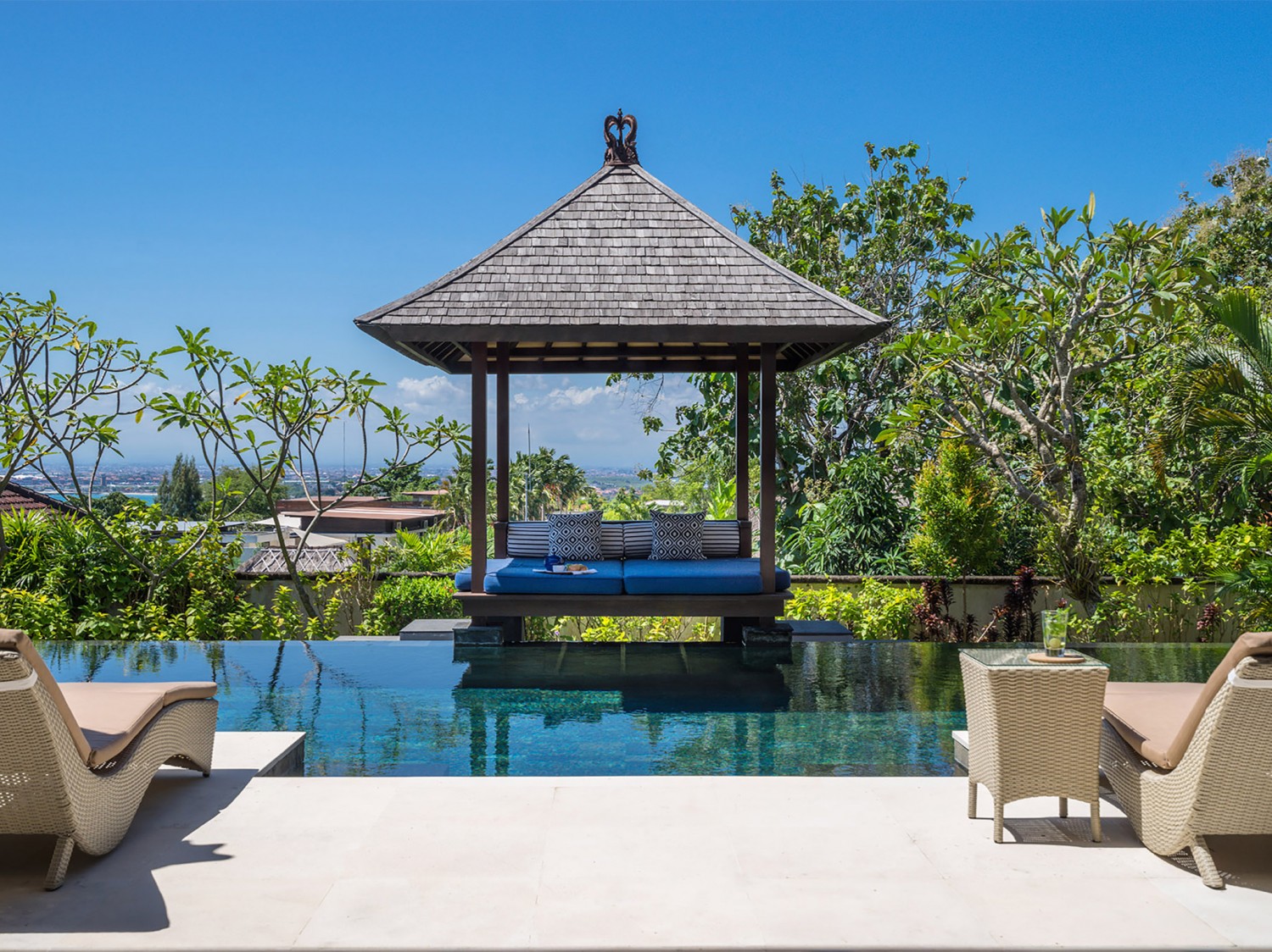 This villa is located within the secure hillside complex of Temple Hill Upper II, only a five-minute walk from Jimbaran; a sweeping bay that curves for five kilometres from the southern side of the airport to the start of the Bukit Peninsula. The bay is protected by an unbroken coral reef, which can be traversed only by small jukung fishing boats, so although the calm water here is not suitable for surfing, it’s excellent for swimming. Jimbaran is also renowned for its beachside warungs (local eateries) offering just about every type of fresh seafood you can think of, making it a very popular venue for sunset dinners. The Bukit Peninsula’s beautiful beaches and many of Bali’s world-famous surf breaks are within a 20-minute drive of the villa, including Padang-Padang and Bingin. And a sunset visit to the magical clifftop temple at Uluwatu shouldn’t be missed.