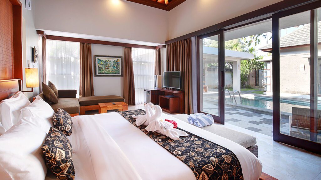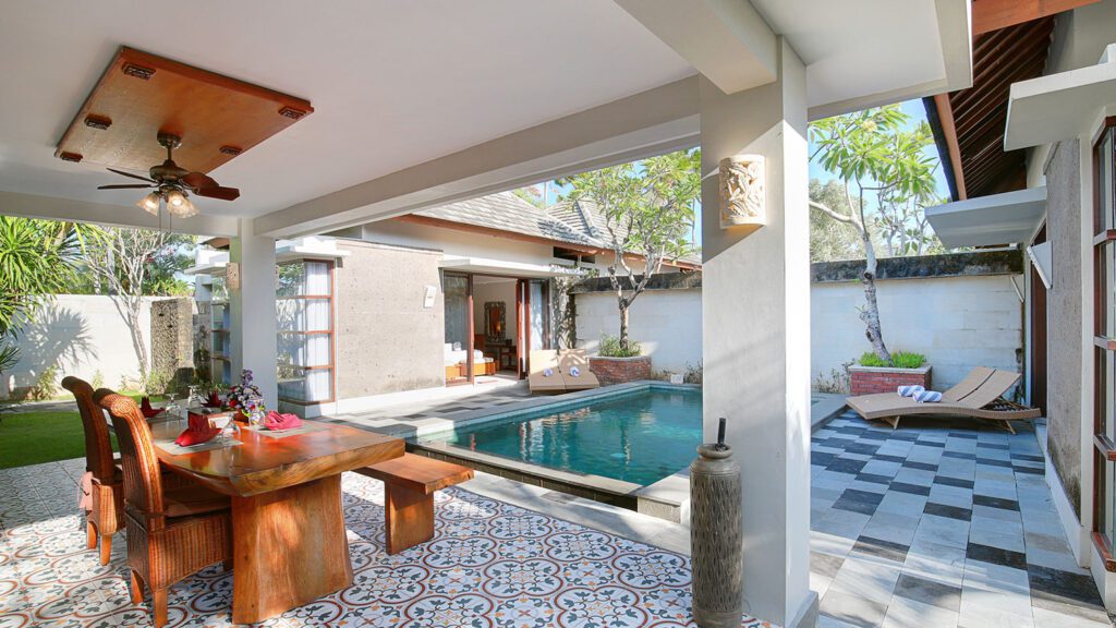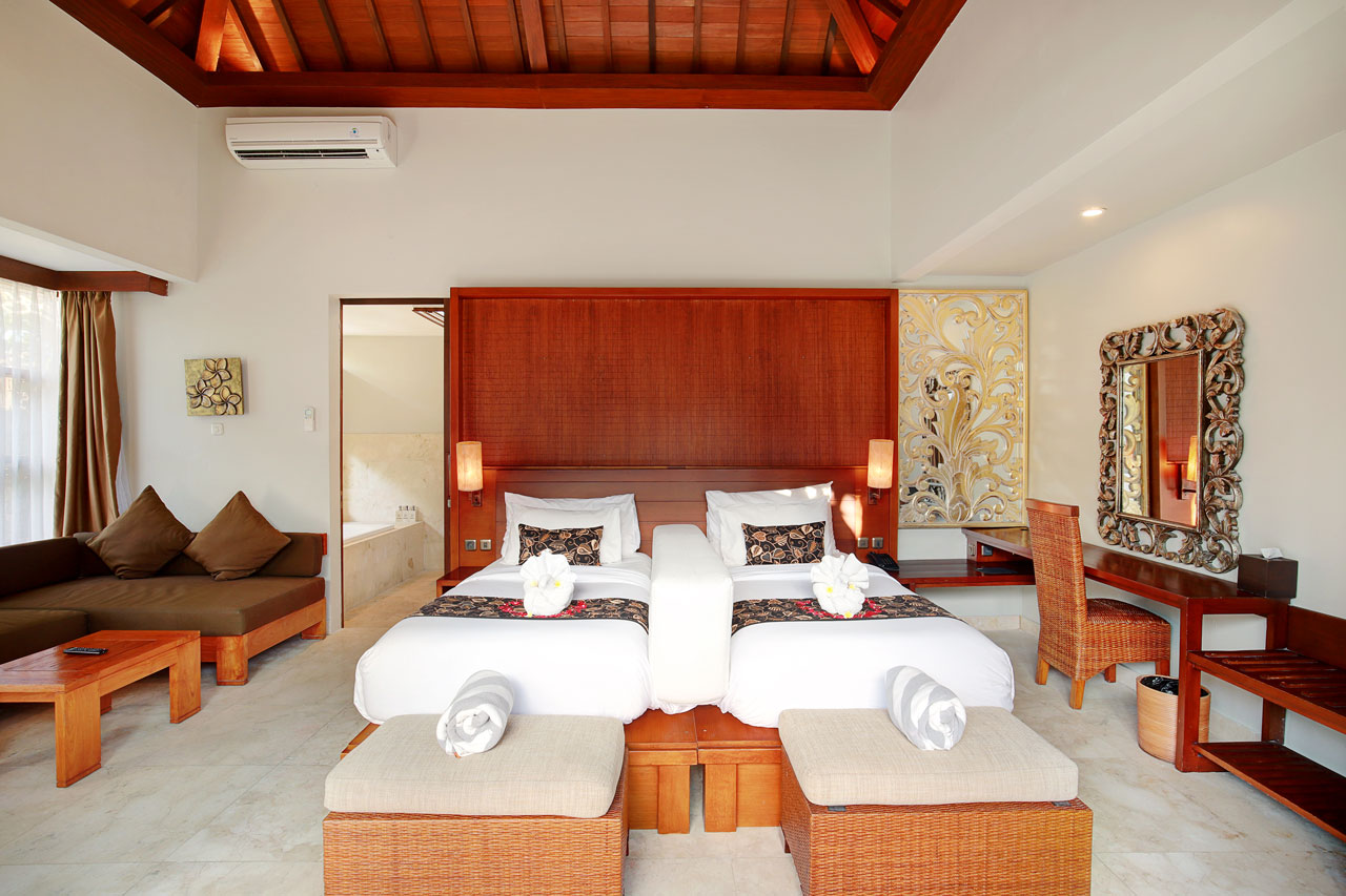 As a sublime seclusion, the two-bedroom villa is more convenient and spacious for guests traveling in a group or family. This condition enables you to always get in touch with family and maintain harmony. You have the right choice of a magical island hideaway that delights and indulges. For your comfort, the exterior and interior have been elegantly designed with perfect touch to meet every need. Both bedrooms are separated by pool, while dining area and living area sits in front of pool (3.5 m x 6 m).