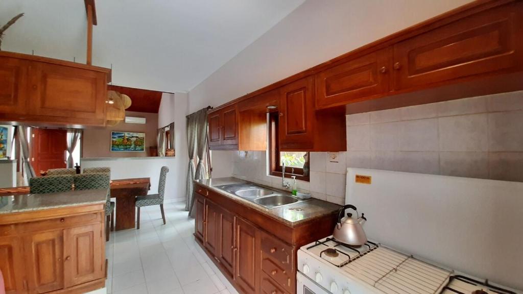 This inviting villa in Bali offers a peaceful escape with a lush garden, spacious terrace, and an outdoor swimming pool. Guests can stay connected with free WiFi available throughout the property. Ideal for families, the villa includes air-conditioned rooms, a fully equipped kitchenette, a balcony, and convenient amenities such as a hot tub and washing machine. Free private parking is also provided. Conveniently situated 6.2 miles from Ngurah Rai International Airport, the villa is within easy reach of popular attractions like Garuda Wisnu Kencana (2.5 miles), Uluwatu Temple (6.8 miles), and Waterbom Bali (9.3 miles).