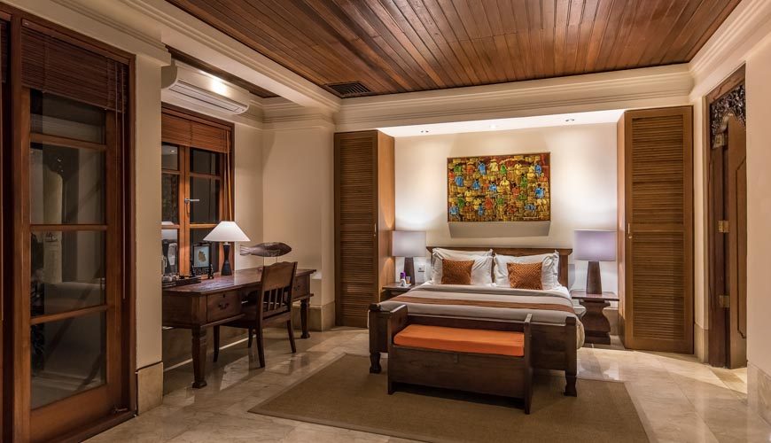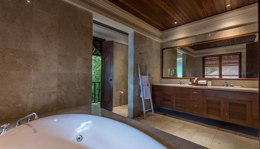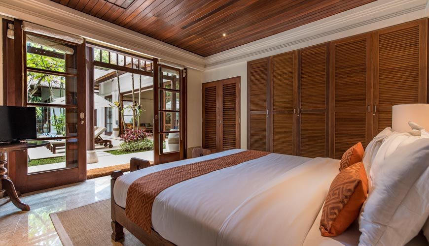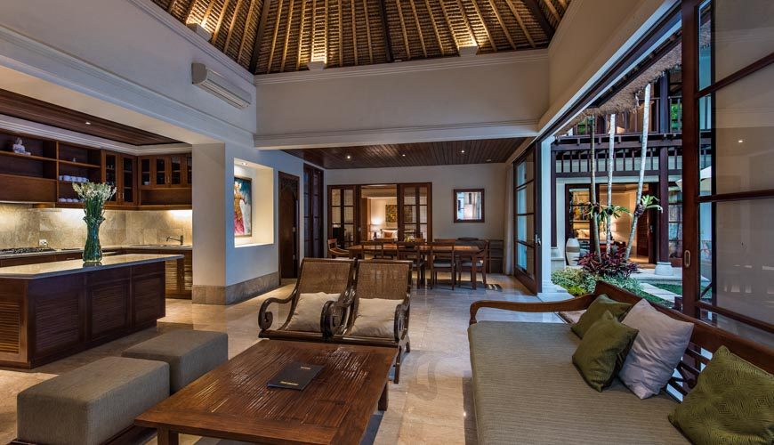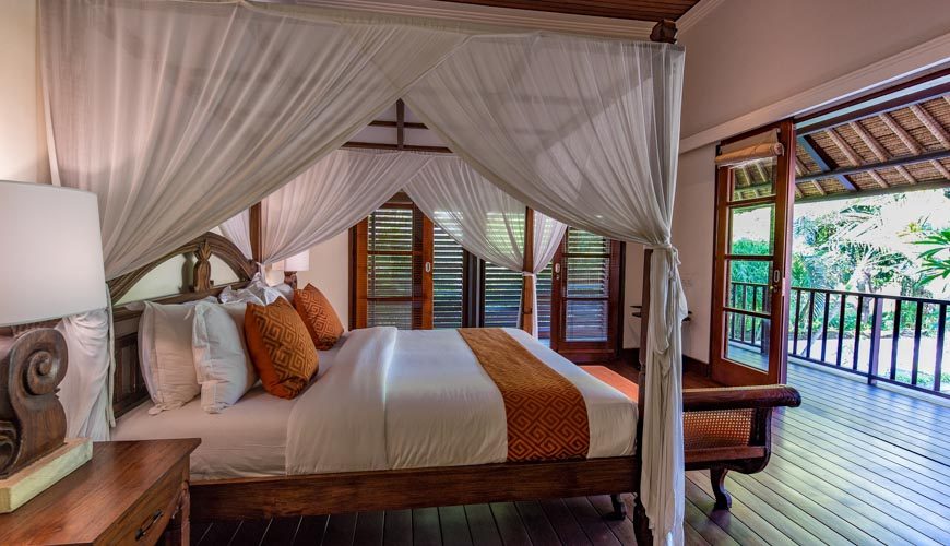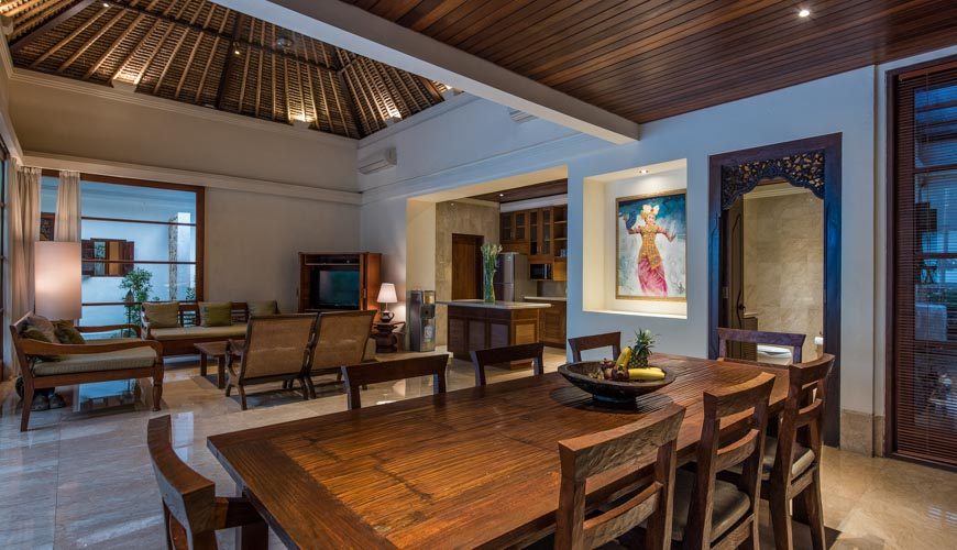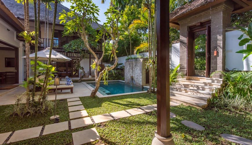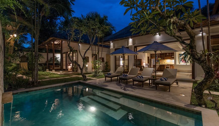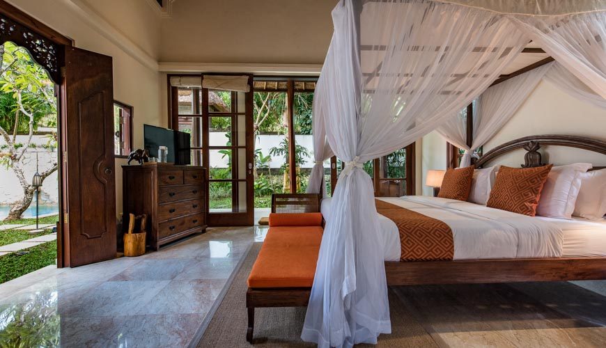 This villa offers the perfect mix of tropical charm and modern comfort, featuring four air-conditioned bedrooms, a lush garden with a private pool, and a prime location near the beach and Jimbaran’s famous seafood bay. The master suite, located upstairs, comes with a canopied king bed, balcony, dressing room, and en-suite bathroom with shower and bathtub, while the other three bedrooms each have king beds and tropical-style en-suites with open-air showers. The elegant living room combines traditional design with modern convenience, offering both open-air tropical living and full AC comfort, along with a dining area, lounge with TV, and a fully equipped kitchen. With its inviting pool and serene setting, this villa is an ideal island getaway for families and friends.