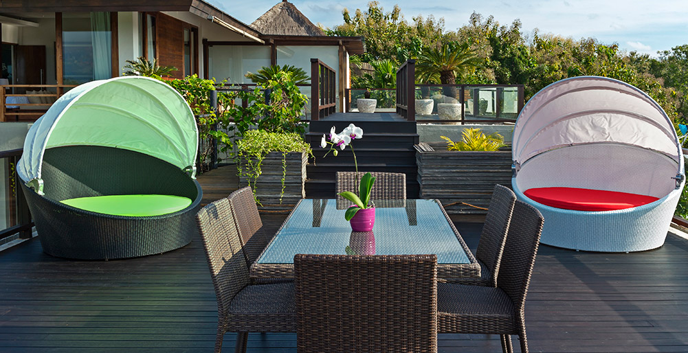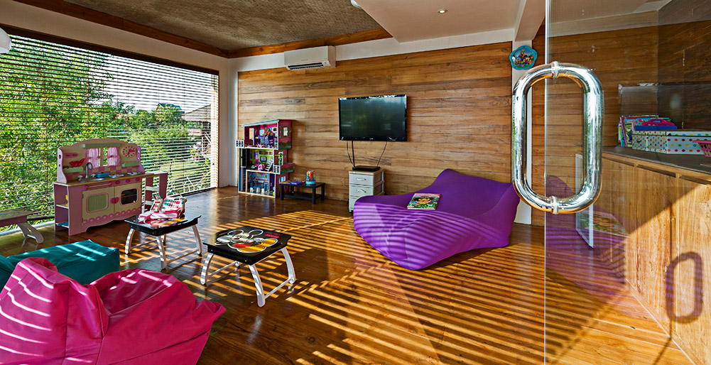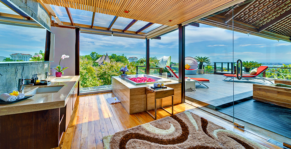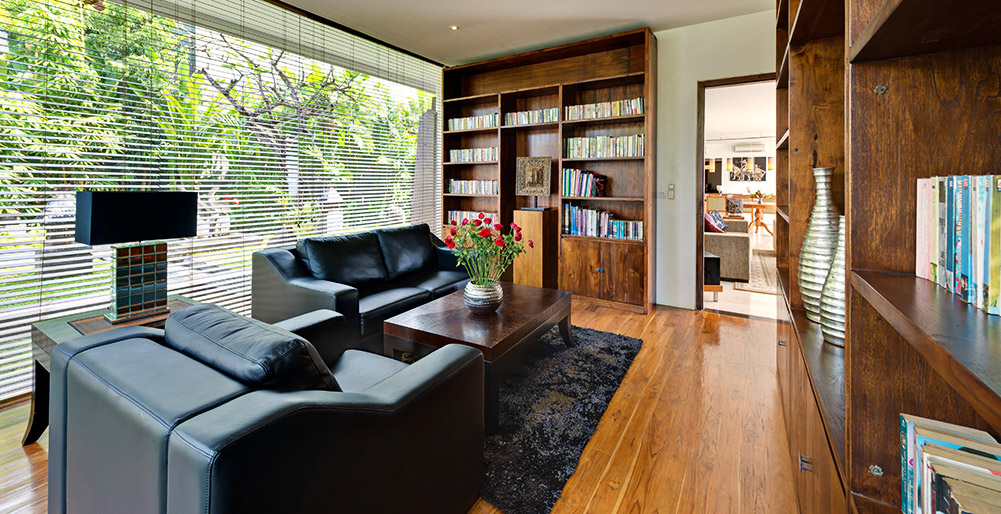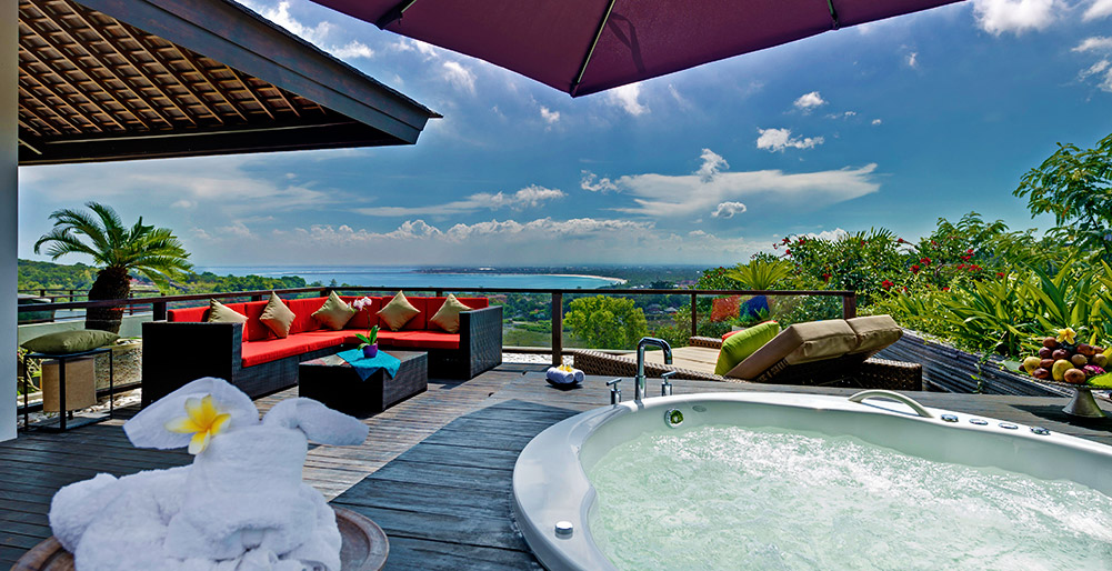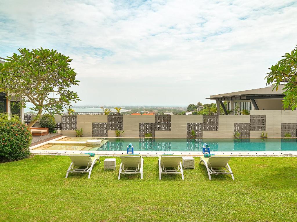 This villa is located on a hill overlooking the seaside village of Jimbaran and is just a short drive from the calm and safe white-sand beaches of Jimbaran Bay. After a day on the beach, sample some of the island’s freshest seafood at the local beachside warungs, where the tables are set on the sand. Wash down the catch of the day with an iced beer while watching one of Bali’s famous sunsets. The area around is also home to many five-star resorts offering the ultimate in fine dining. And the championship standard, 18-hole New Kuta Golf course, with its dramatic cliff-top setting, is only four kilometres from the villa. If you’re keen to surf some of Bali’s most famous breaks, Padang Padang, Bingin and Dreamland, are just a twenty-minute drive away. This villa is a beautiful four-bedroom blend of East and West in picturesque Jimbaran Bay. Contemporary in design, with sweeping views across the idyllic Bukit Peninsula, every space at the villa makes the most of its spectacular hilltop location and breathtaking vistas. The villa design references the ancient Chinese philosophy of yin and yang with a dramatic play on light, space and airiness balanced with classic architectural lines created from teak, marble, granite and recycled ironwood. A liberal use of glass floods the villa with natural light and offers expansive views over manicured lawns, calming water features and an alluring infinity-edge lap pool. The villa’s four bedrooms are spacious and private, boasting ensuite bathrooms with chic Grohe fixtures polished wood flooring and high quality entertainment facilities. Two of the main bedrooms also offer expansive views over the beautiful Bukit Peninsula – perfect for taking in the scenery from the comfort of your king-sized bed. Enjoy a lazy day lounging in the sun on your private veranda or retreat from the heat and relax in the comfort of the air-conditioned library.