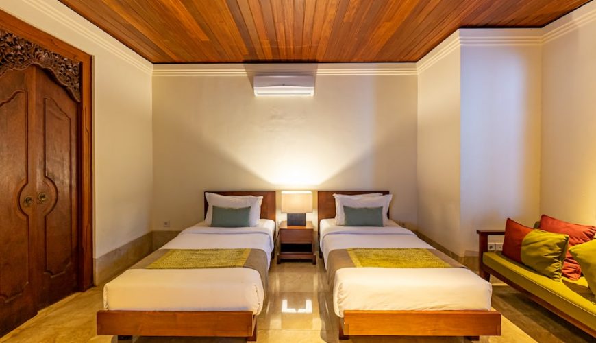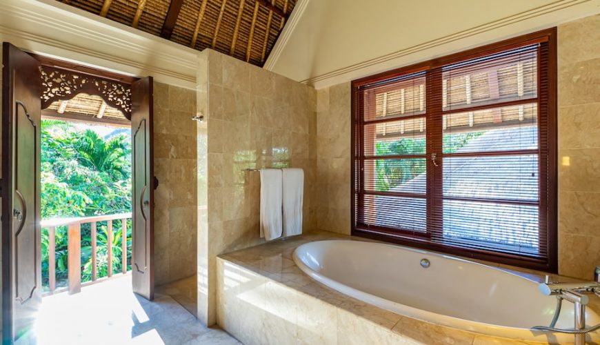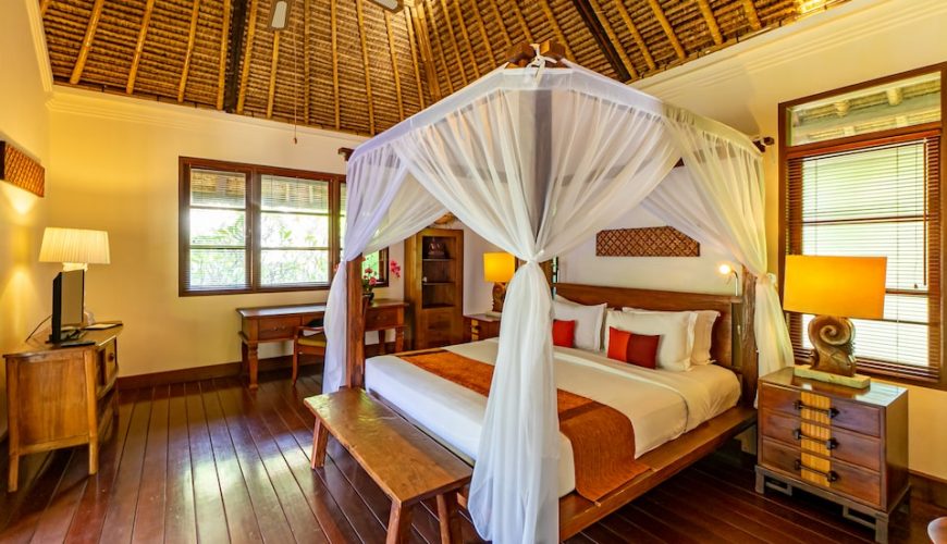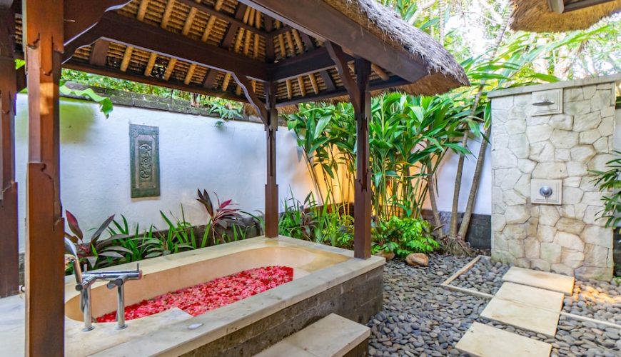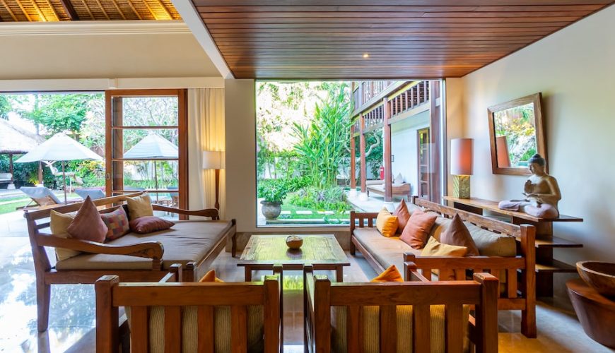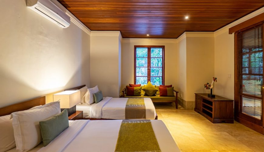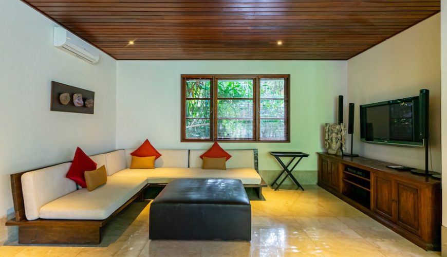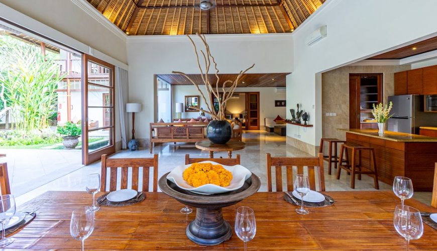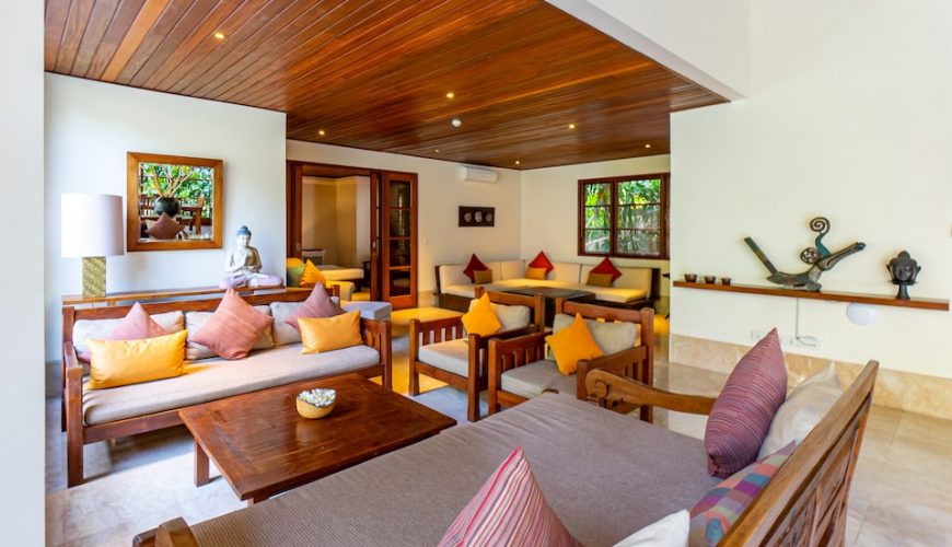 Each of the bedrooms has double beds, TV, Air Conditioner and is located at great proximity to ensure full privacy. All with en-suite and large timber wardrobe closets, two of the bathrooms on the ground floor open out to the outdoor garden area and the other to an outdoor jacuzzi. The master bedroom on the top floor epitomizes luxury living with separate room for jacuzzi and showers respectively, and a balcony overlooking the verdant garden below. The interior décor combines to perfection modern comfort with traditional Balinese edge with ample of natural light.