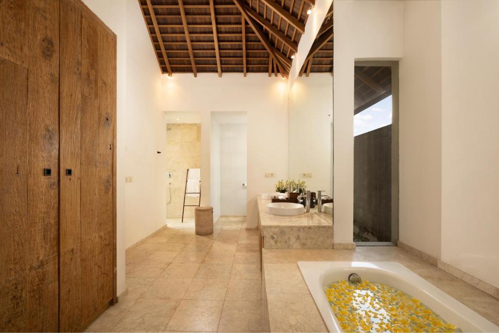 Experience paradise at this villa, featuring private pool villas in the prime Seminyak–Canggu–Kerobokan area. This exceptional three-bedroom villa boasts a 14-meter swimming pool, lush gardens, and attentive staff. With comfortable furnishings and air-conditioned dining and living spaces adorned in modern wooden interiors, this villa offers a welcoming home-like atmosphere. The villa features three bedrooms, accommodating up to six guests. The master bedroom, located on the ground floor with views of the swimming pool, includes a king-sized bed, flat-screen TV, and a master bathroom with a walk-in shower and bathtub. The two additional ensuite bedrooms also have king-sized beds and ensuite bathrooms with rainfall showers, all opening to the pool for a vibrant Bali experience right from your room.