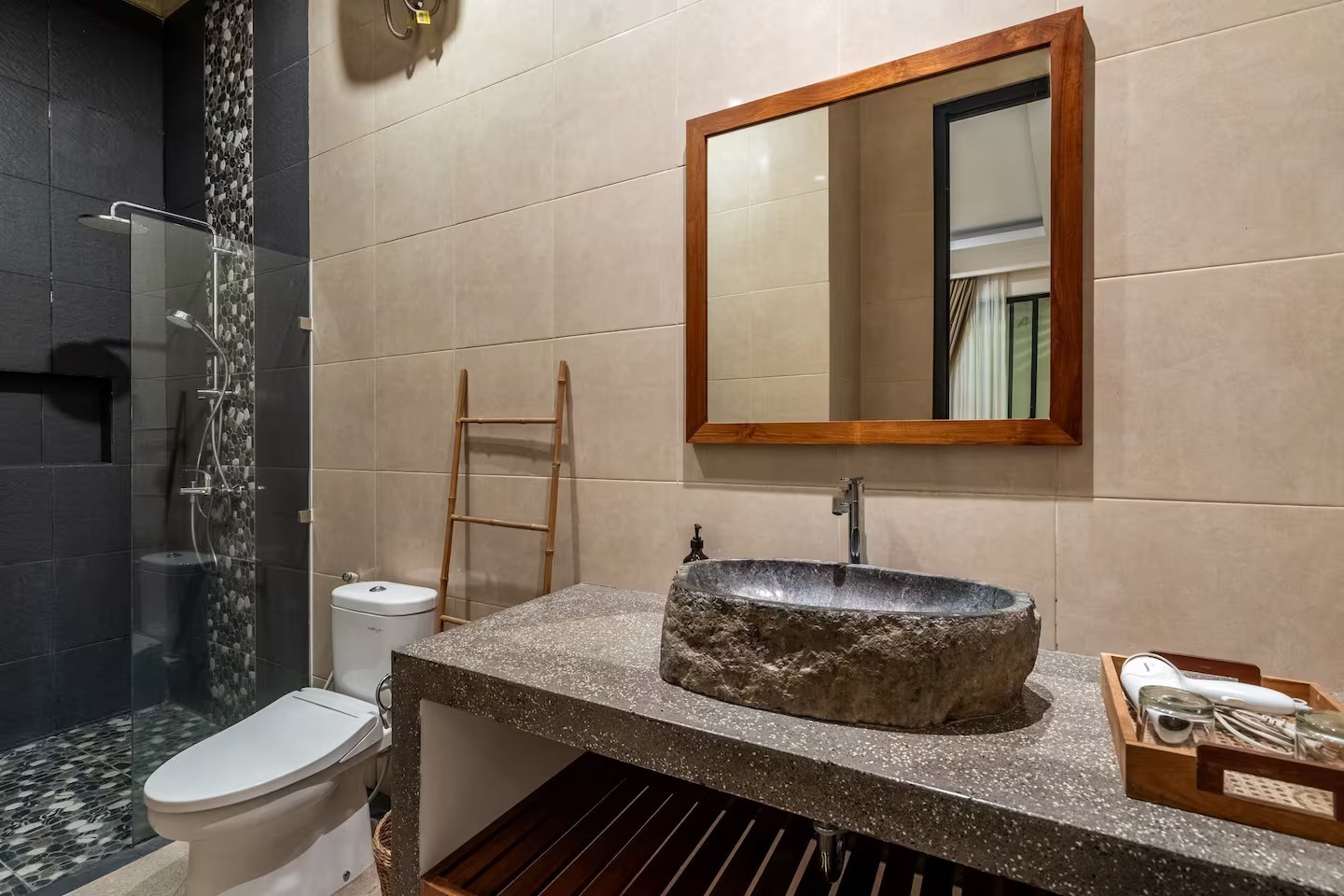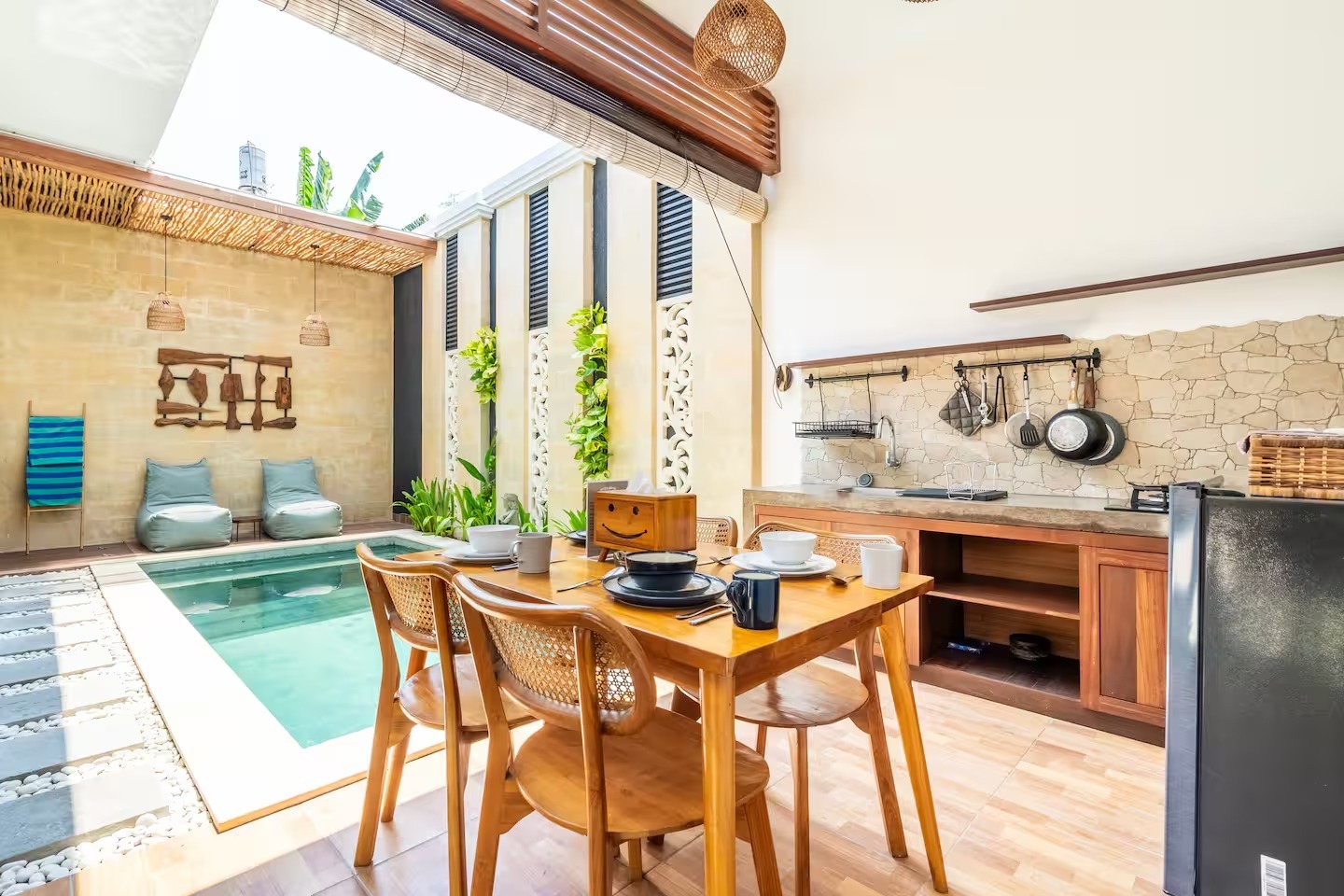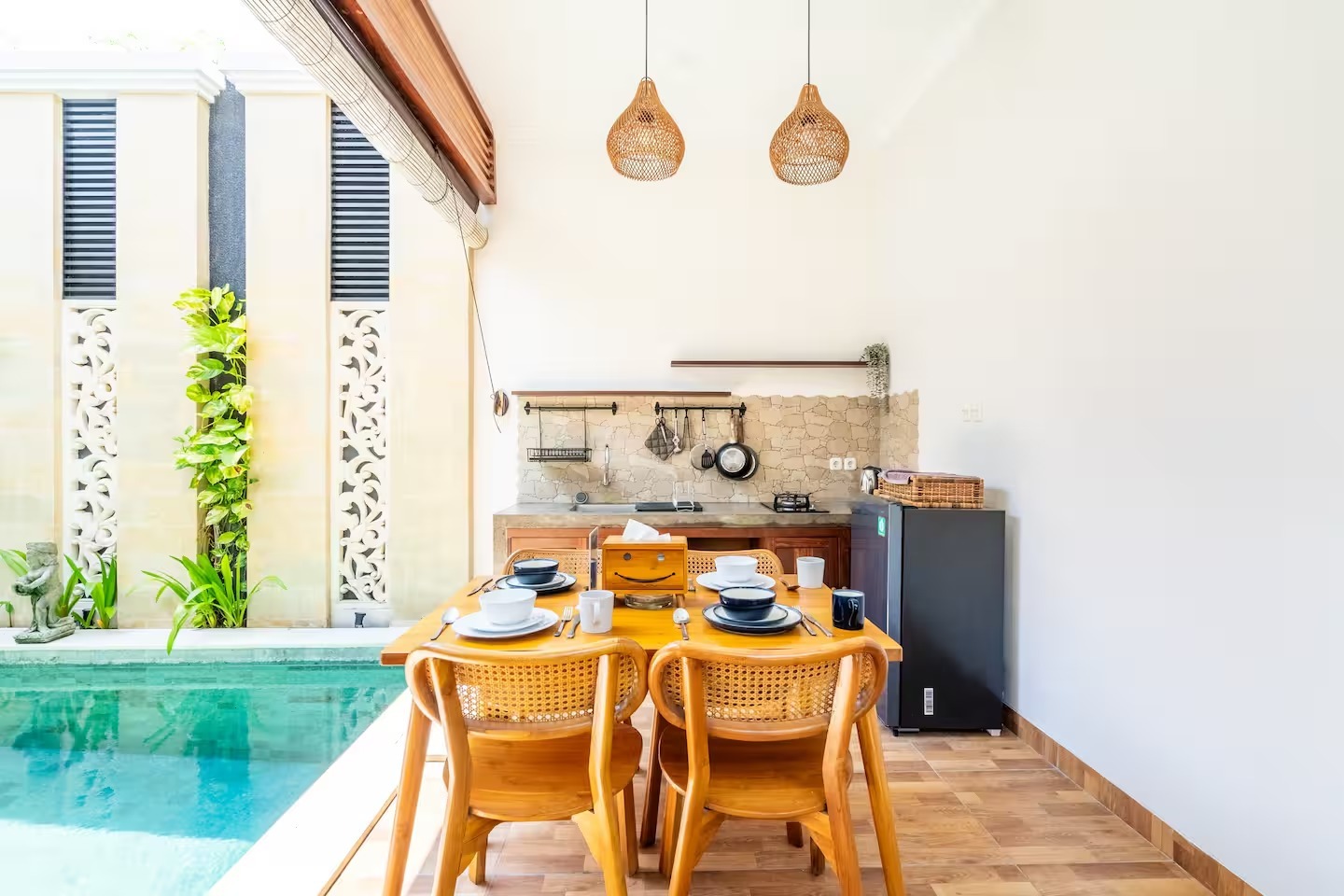 Relax with family at this peaceful place to stay. This villa is just steps away from Legian eat street. You will experience easy access to all restaurants and entertainment that Legian and Seminyak have to offer. The villa offers one spacious bedroom with en – suite bathroom, overlooking to the swimming pool, it is also completed with dining area & kitchen.