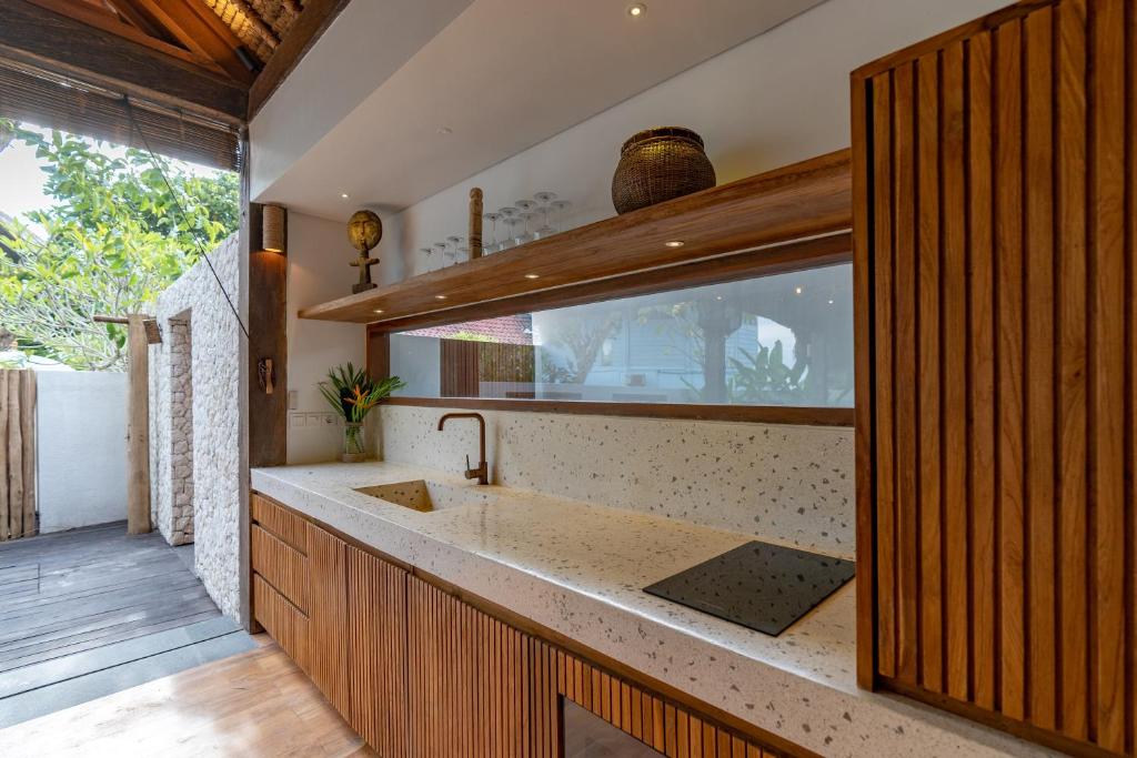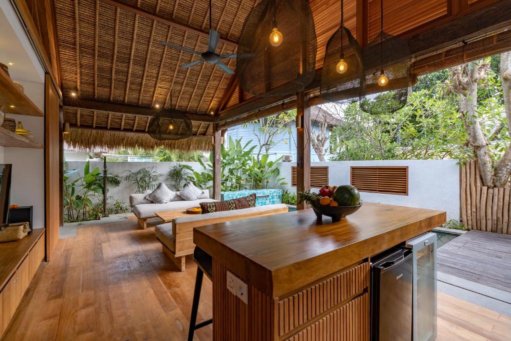 Continue down the boardwalk into the stunning open air living space featuring dramatic recycled Ulin timber beams and a soaring traditional alang alang roof. You can cook up a storm in the fully fitted out kitchen with locally sourced produce or popped over to Sandy Bay Beach Club for all day dining and amazing cocktails.