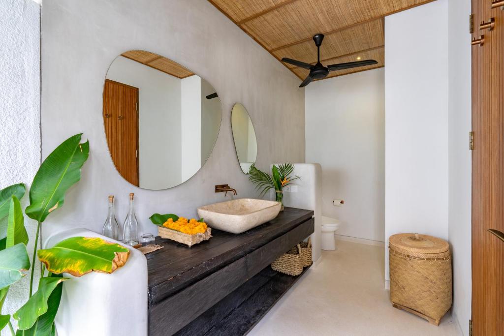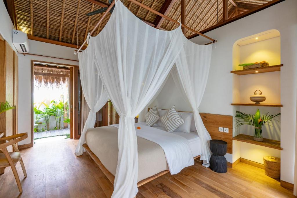 Sliding back the screen reveals the master bedroom surrounded by garden with a beautifully styled ensuite featuring an outdoor rain shower. The luxurious king size bed and suspended mosquito net draped from the vaulted ceiling provide a perfect retreat for blissful rest.