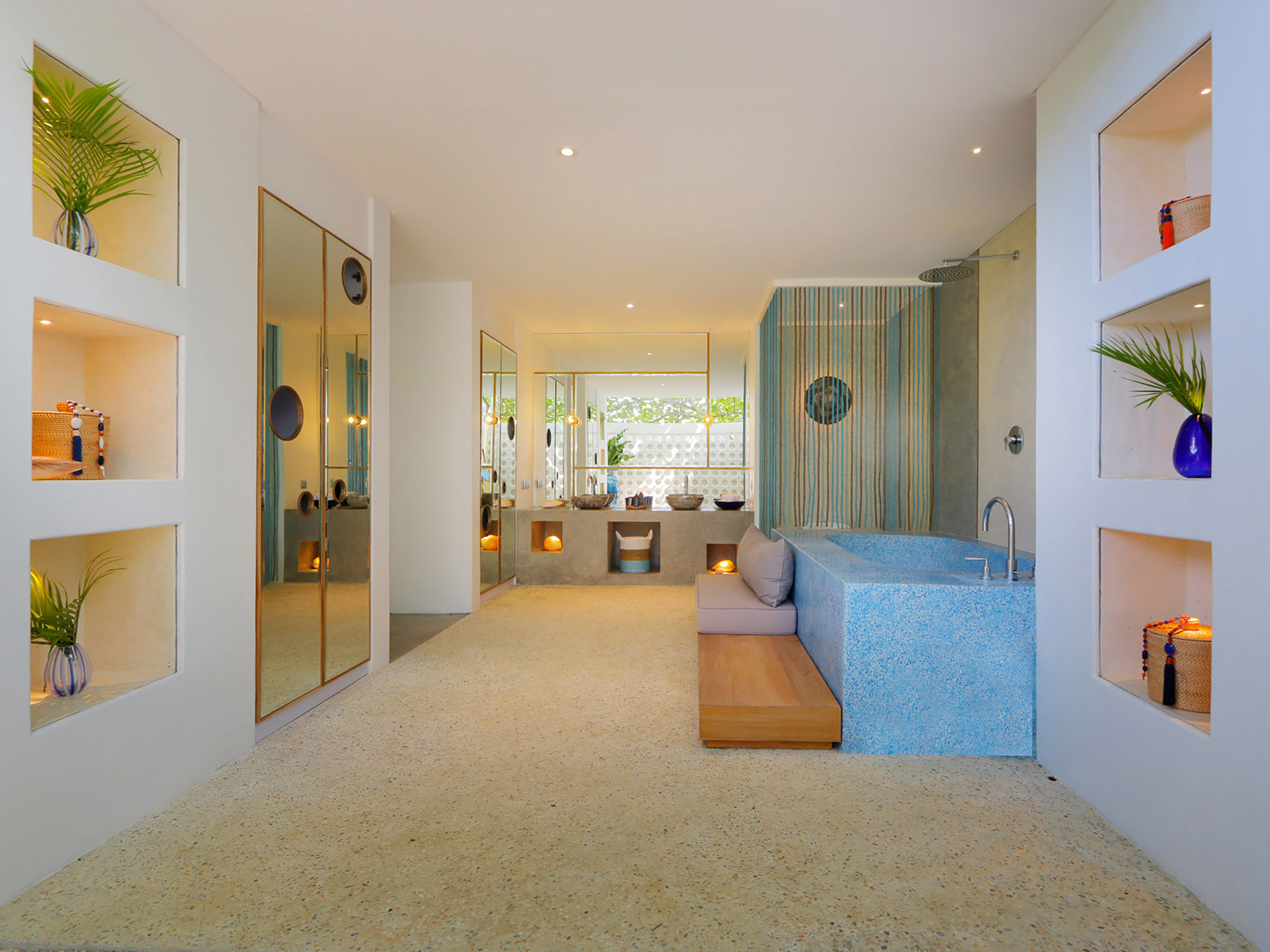 The maxi-minimalist design aesthetic is perfectly pitched, with a beach-chic colour palette of neutrals and aquas, and a circular theme softening the rectangular shapes, from decorative alcoves to bathroom mirrors to the pool terrace. All the rooms are adorned with natural materials — polished pebble and teakwood floors, terrazzo walls and bathtubs, bamboo screens, seagrass rugs, custom-designed furniture using plaited rope and rattan, and shells decorating woven baskets, curtain tie-backs and wooden bowls. Among the contemporary luxuries are sublimely comfortable King Koil beds, crisp cotton bed-linen, 52-inch TVs, NID music system, Bose speakers and home cinema. And attention to the smallest detail is evident in thoughtful extras such as beach bags in the bedrooms and Sensatia toiletries in the bathroom.