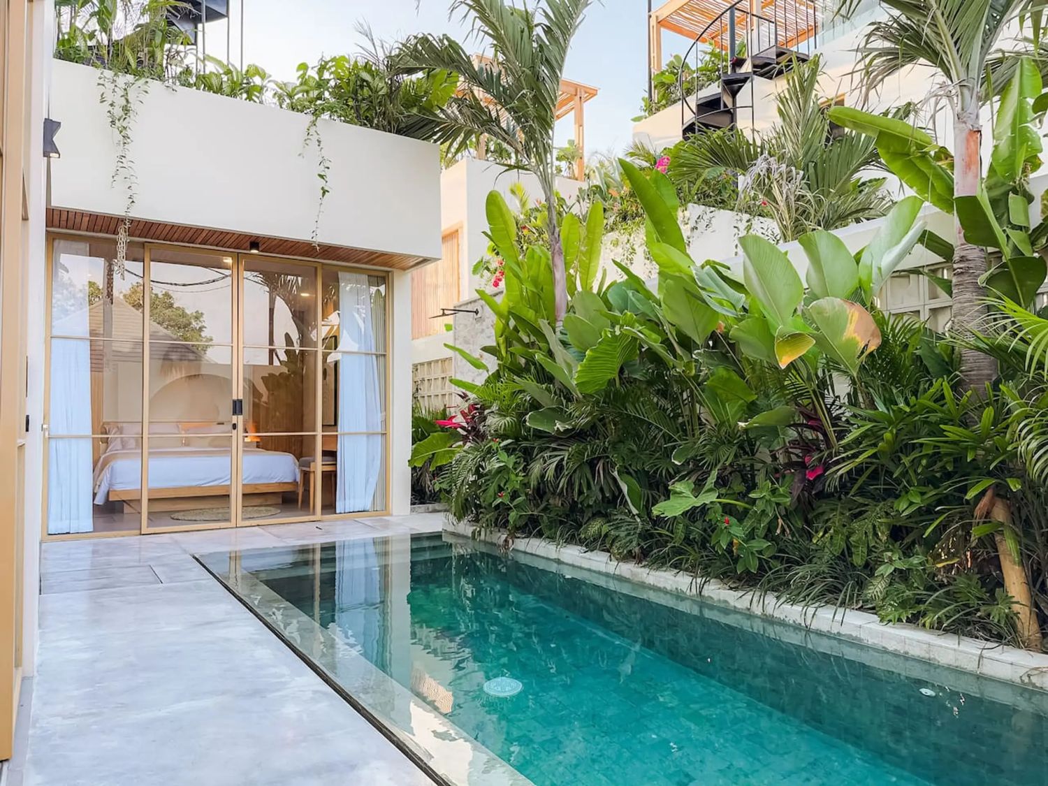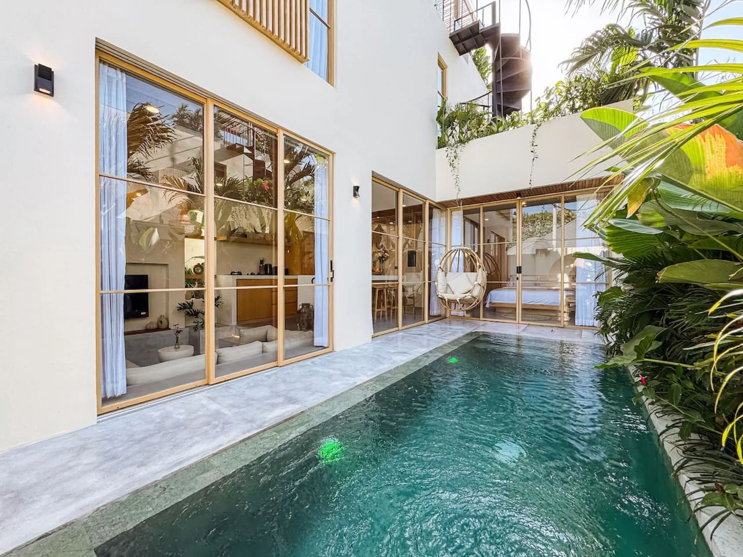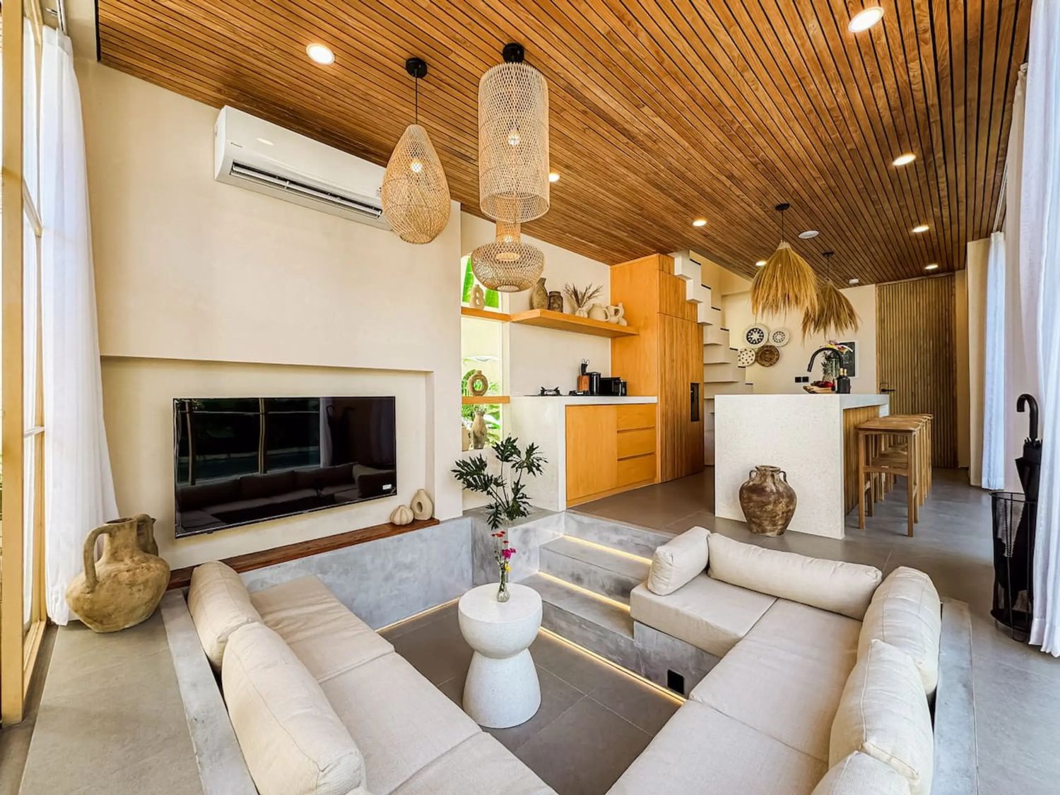 This private tropical escape in this spacious 3-bedroom villa, designed to blend modern comfort with island charm—perfect for families, groups, or friends seeking the ultimate Bali getaway. The villa features three comfortable bedrooms, including one with a private balcony, and a main bathroom with a unique open-air design and bathtub surrounded by nature. At the heart of the property is a private pool set within a lush garden, while the living area offers a cozy sunken sofa and TV lounge for relaxing after a day out. A fully equipped kitchen allows for easy meal preparation, and the rooftop chill-out space provides stunning sea views—ideal for sunset drinks, morning yoga, or stargazing. With its bright tropical design that seamlessly connects indoor and outdoor living, and its convenient location near Uluwatu’s famous surf spots, beaches, cafes, and beach clubs, this villa offers both tranquility and easy access to everything you need for a perfect stay in Bali.