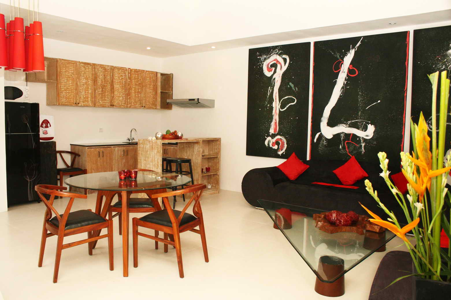 This Villa is situated on Jalan Batu Belig. It is a perfect private villa for couples or a Family which are looking for holidays. The style here is pure & simple, it is a very intimate villa. You will find at night like during the day a charming place to live for sure. The atmosphere in this villa is quite peaceful, and all the wood mixed with this modernity brings a natural side really enjoyable. Then, the garden is trimmed with huge palm trees, banana trees and birds of paradise flowers. The living area is located adjoining the bedrooms and also looks onto the garden and pool area. It has a very large sofa area, new kitchen and romantic dinning area adjoining the patio area for either outdoor dining or lying in the sun lounges. The kitchen is idea with everything easy to reach and has a large island counter that also serves as a bar area. All the furniture and specially painted artwork is new and helps give the villa a warm but modern feeling.