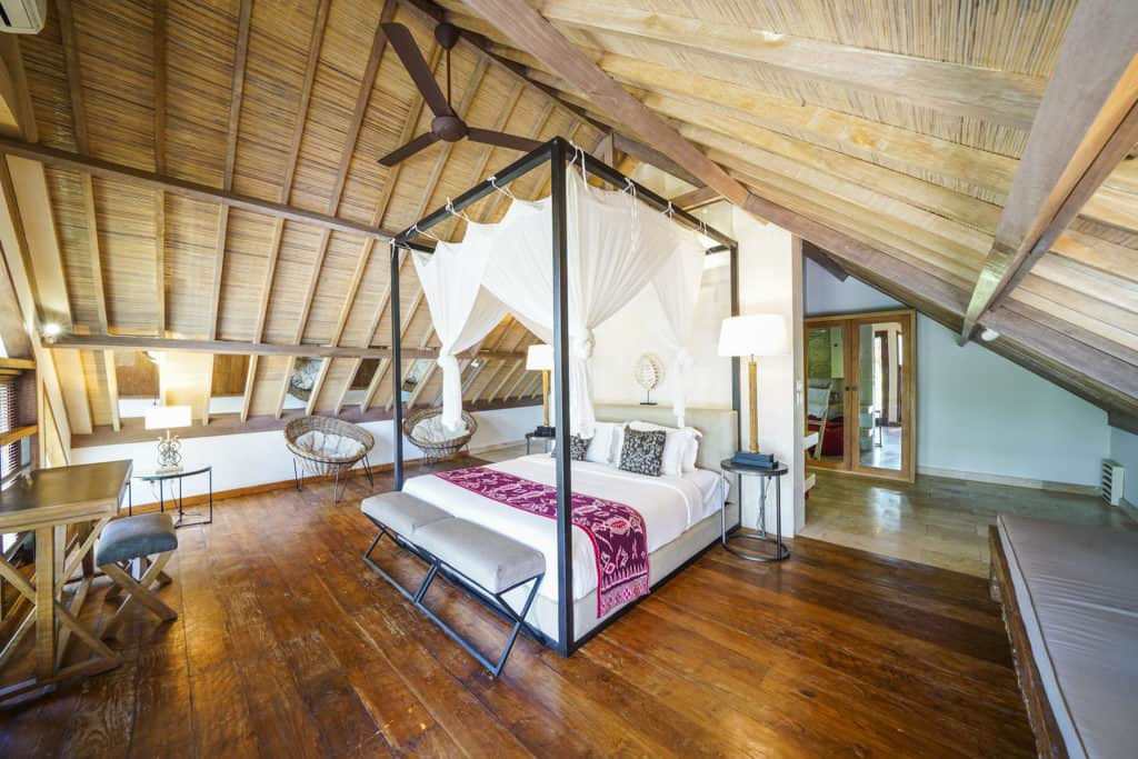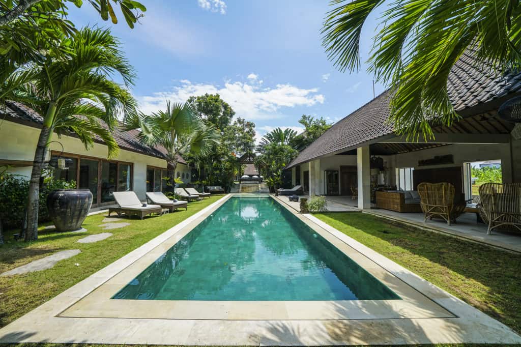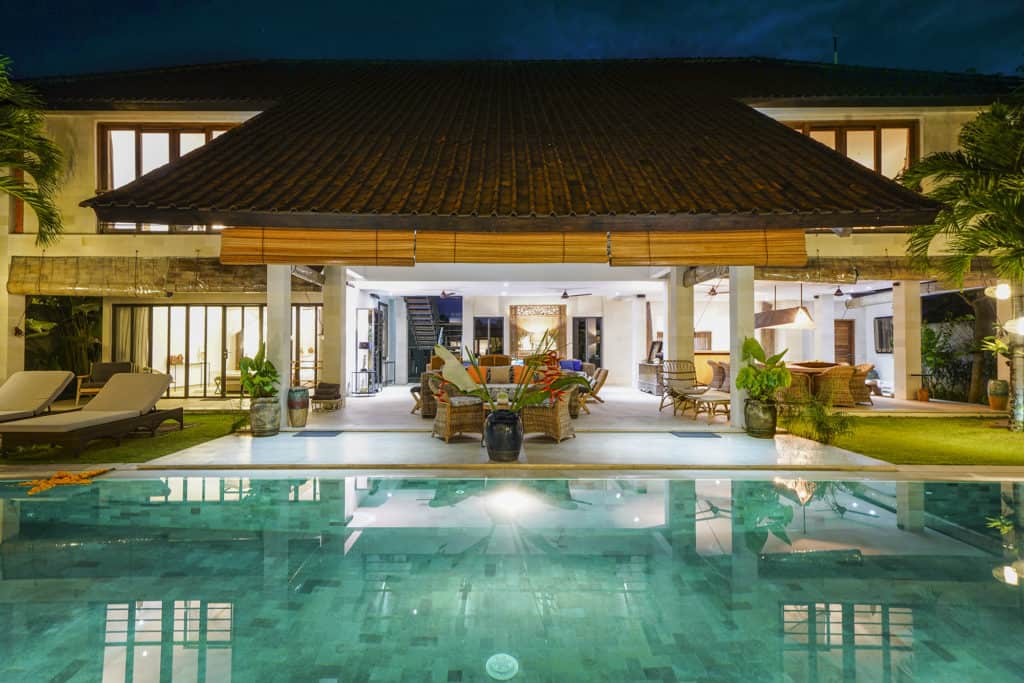 Paradise is no longer a place up in the clouds, this large capacity luxury villa in Seminyak is the combination of 3 Villas. These 3 large luxury villas are interconnected through gates in the gardens and when renting out the entire estate, you will have one massive paradise-like garden with 4 swimming(!!!) pools, 3 large living pavilions and a private event space for parties, yoga classes and events. Planning a tropical getaway with the whole family or are you seeking an amazing venue to host your special event in Seminyak? You won’t find any place more suitable than this Villas. The estate is set amidst rice paddy fields and yet, it is located in the most upscale area of Seminyak, close to the beach, cafes and restaurants.