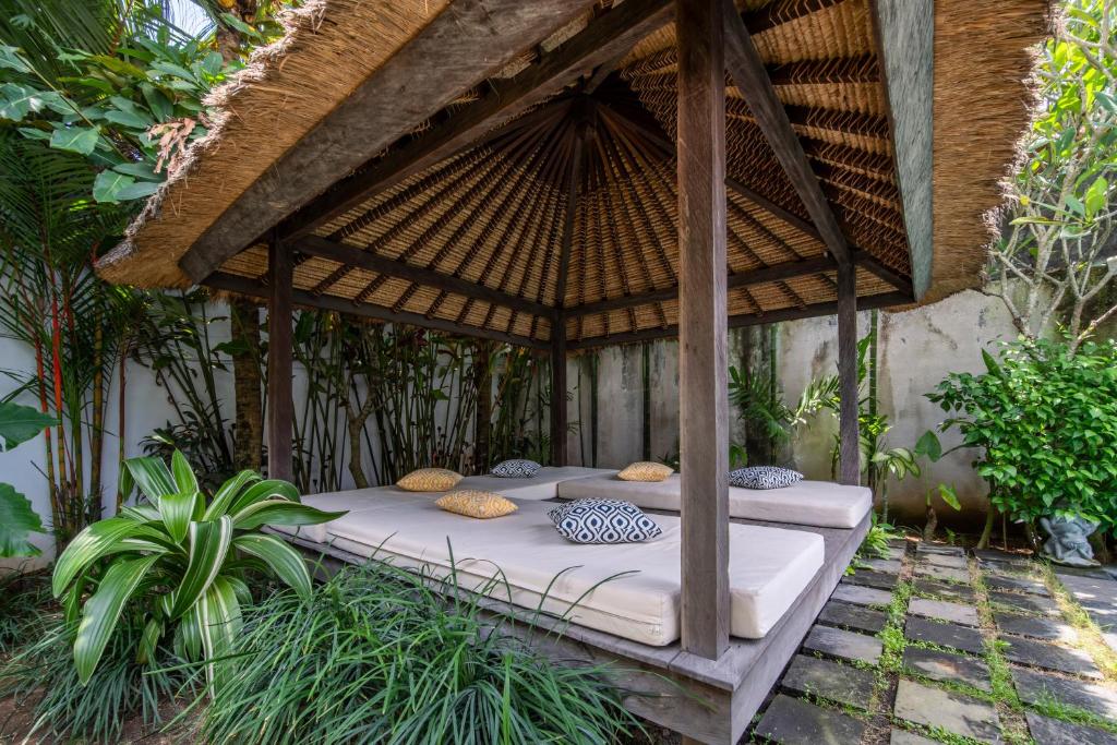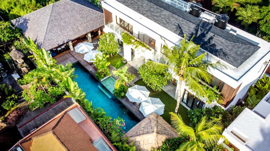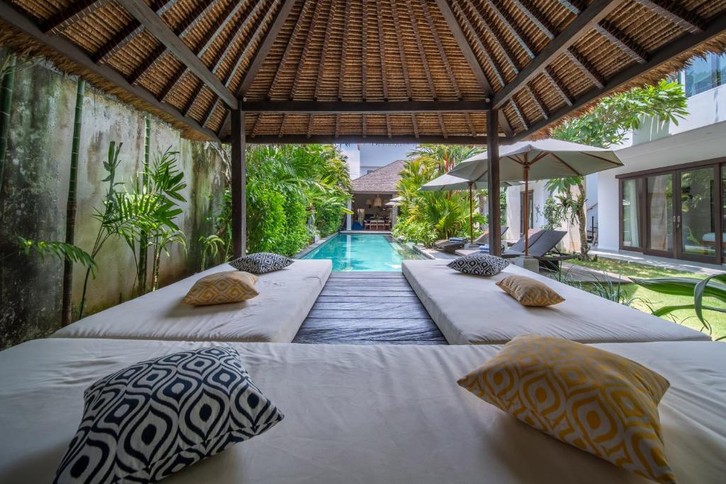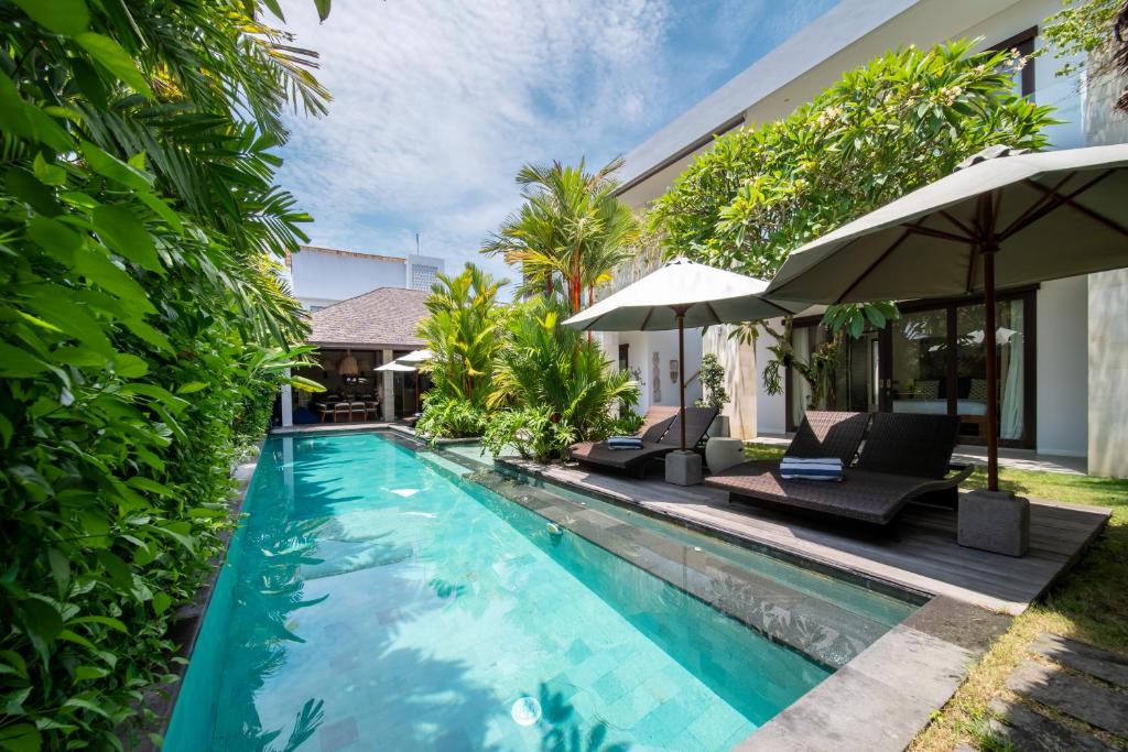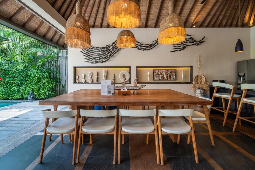 This Villa is a shining jewel amidst the vibrant life of Seminyak. Just moments away from the beach and the bustling streets lined with boutiques and fine dining, this luxurious 6-bedroom haven promises an escape that's both secluded and central. Make unforgettable memories in a setting where tropical modernity blends with charm and sophistication. Dream in style in one of This Villa's six spacious bedrooms, each one a serene retreat with chic modern furnishings and touches of local art. Slide open the glass doors and let the breeze waft through, or close the curtains for a cozy nap. Every room promises stylish comfort with plush bedding, air conditioning, and sleek en-suite bathrooms for complete privacy and relaxation. Step outside and immerse yourself in a lush, private garden oasis. Dive into the inviting blue waters of your own swimming pool, or lounge in the shade of a poolside umbrella. For the ultimate unwind, sprawl out in the gazebo amidst the rustling foliage. This natural sanctuary is perfect for both lively family fun and tranquil solitude under the sky. Discover a blend of traditional craftsmanship and contemporary design in the spacious living and dining areas. The Villa's open-plan concept with its high ceilings and ambient lighting invites you to relax and gather. The fully equipped kitchen offers everything you need for a home-cooked meal, while the smart TV calls for movie nights to remember.