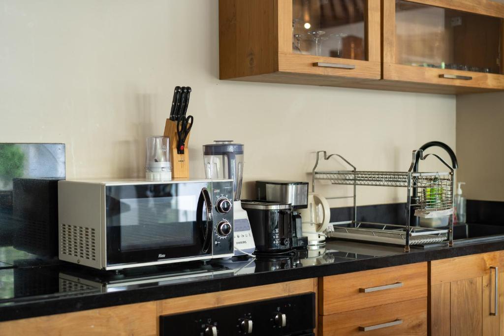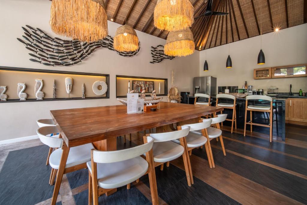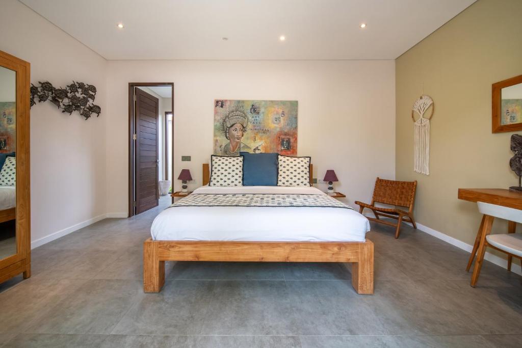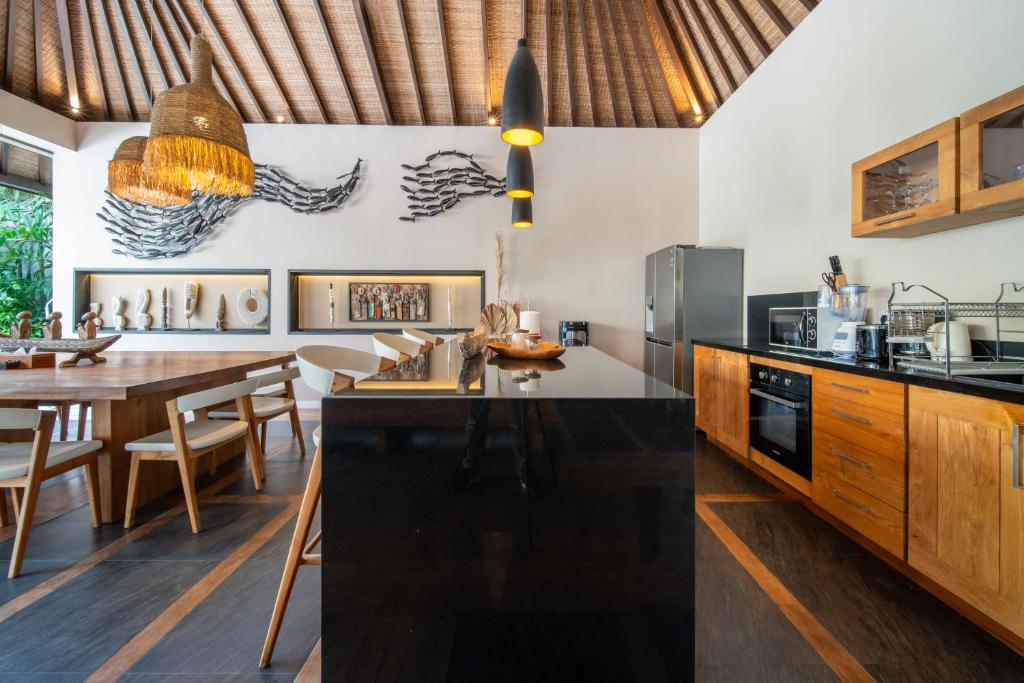 This Villa is a shining jewel amidst the vibrant life of Seminyak. Just moments away from the beach and the bustling streets lined with boutiques and fine dining, this luxurious 6-bedroom haven promises an escape that's both secluded and central. Make unforgettable memories in a setting where tropical modernity blends with charm and sophistication. Dream in style in one of This Villa's six spacious bedrooms, each one a serene retreat with chic modern furnishings and touches of local art. Slide open the glass doors and let the breeze waft through, or close the curtains for a cozy nap. Every room promises stylish comfort with plush bedding, air conditioning, and sleek en-suite bathrooms for complete privacy and relaxation. Step outside and immerse yourself in a lush, private garden oasis. Dive into the inviting blue waters of your own swimming pool, or lounge in the shade of a poolside umbrella. For the ultimate unwind, sprawl out in the gazebo amidst the rustling foliage. This natural sanctuary is perfect for both lively family fun and tranquil solitude under the sky. Discover a blend of traditional craftsmanship and contemporary design in the spacious living and dining areas. The Villa's open-plan concept with its high ceilings and ambient lighting invites you to relax and gather. The fully equipped kitchen offers everything you need for a home-cooked meal, while the smart TV calls for movie nights to remember.