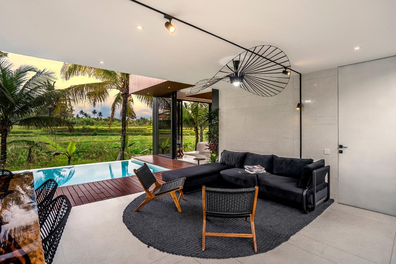 This modern one-story villa in the heart of the island offers stunning views of lush rice fields and features an infinity pool, blending natural materials and simple design. The open living and dining areas, along with a mini-kitchen, provide a perfect space for relaxation and entertainment. The three king-sized bedrooms, each with A/C and en-suite semi-open bathrooms, ensure comfort and a unique connection to nature. This villa is a serene retreat, ideal for those seeking both luxury and an immersive jungle experience.