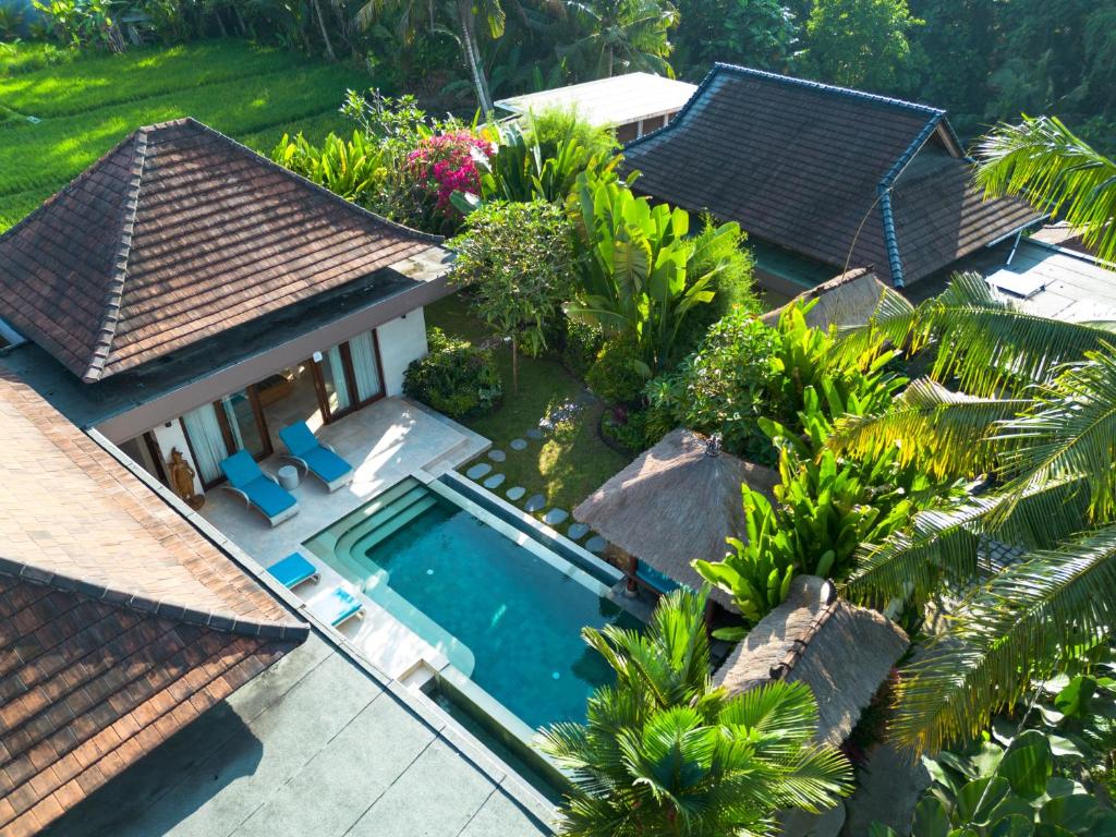 This Villa is a great find in Ubud. An architectural marvel, it also offers a variety of facilities and a breadth of landscapes. On one side, you will see the edge of a verdant forest and on the other side there are lush rice fields that extend all the way to another forested patch. The home is a cocoon of luxury and tranquility. Forage through the village landscape or simply relax and unwind. Enjoy the luxurious amenities in the house. The villa is surrounded by thick greenery and seems to be a world away from everything. And yet, it is just a 10-minute walk from the main road of Ubud and a 5-minute drive from the town center where you will find the palace. All three bedrooms in this holiday villa have beautiful teak furniture. They open directly to the garden and pool through sliding glass doors, which means, you can get outside views even from your bed. All three bedrooms in the villa come with ensuite bathrooms. At its center, you will find a lavish private swimming pool and an outdoor shower. Several loungers are placed on the pool terrace. If you prefer shade, then head to the poolside gazebo with a daybed and cushions for your relaxation.