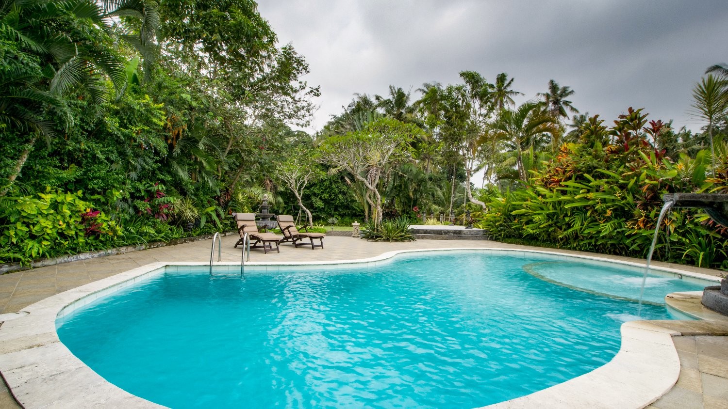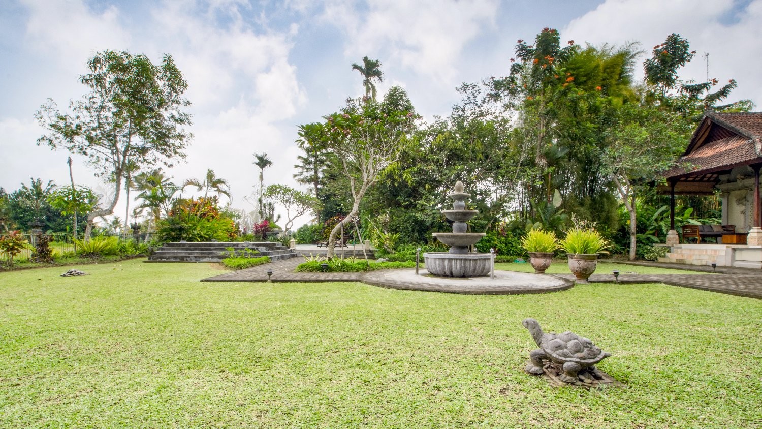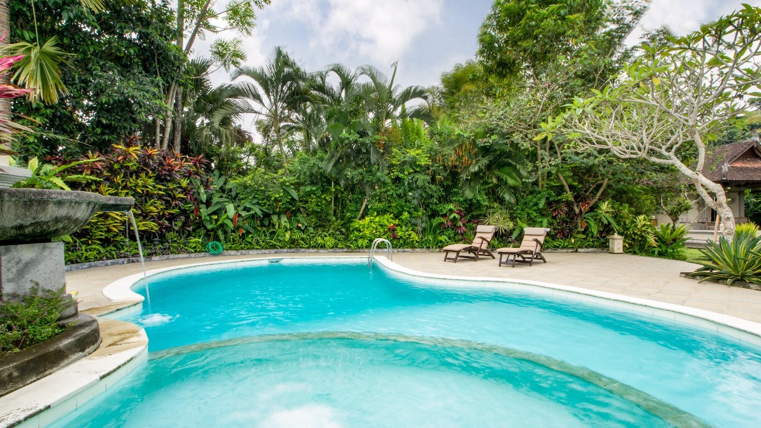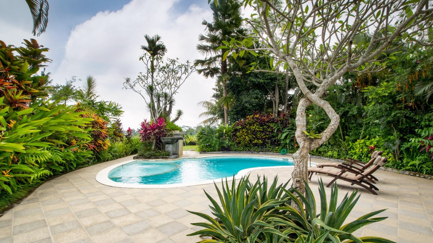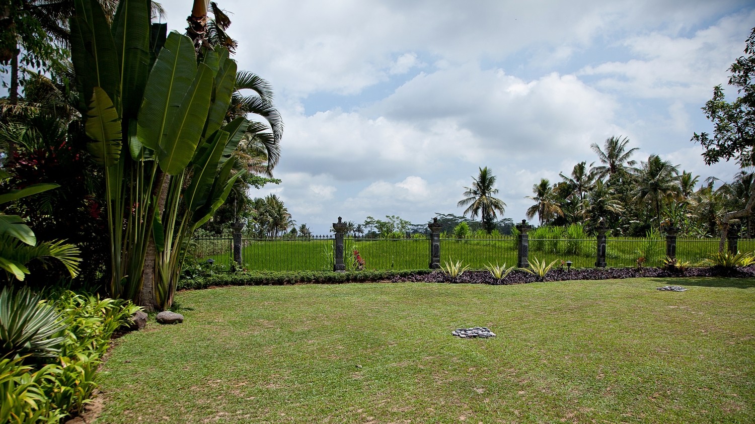 Sited at extensive well-manicured garden fenced with line of coconut tree, this villa is perfect for your tranquil staying accommodation in Bali’s heartland of Ubud. The atmosphere of Balinese culture can be sensed from the time you enter the area which is pictured in the architecture of the building. Detailed sculptured entrance and door enhances the ambiance of local building structure which is beautified by a cascading fountain. The villa itself consists of 1 main bedroom furnished with sofa, working desk and a bathroom with bathtub. Meanwhile, there are two more bedrooms located on the different side of the building. These bedrooms are connected by dining room and living room on the other side which are designed to suit the classic Balinese architecture. This villa is blessed with picturesque view of green rice field enhancing the view of great nature. This peaceful tropical view is also complemented by a lagoon-like pool where you can dip while enjoying the great sky of Bali meeting the endless stretch of green landscape. On the side of the pool, located a traditional Balinese bale where you can start your yoga activity, reading books, or just laying down while enjoying the cool breeze of wind and seeing the vast green paddy fields and coconut trees. The poolside is also perfect to get our tan work started or doing a small barbecue with your loved ones. While you spending your quality time in this villa, professional staff will take care of your needs and inquiries. Security staff is available 24 hours and the housekeeping will take care the rest of tidy up. If you want to explore the area, sightseeing while riding a bike is one of the best activities you could do. You may find local residence living not far from your villa or finding local village temples. Furthermore, the main hub of Ubud is only about 20 minutes and Goa Gajah for about 10 minutes by car.