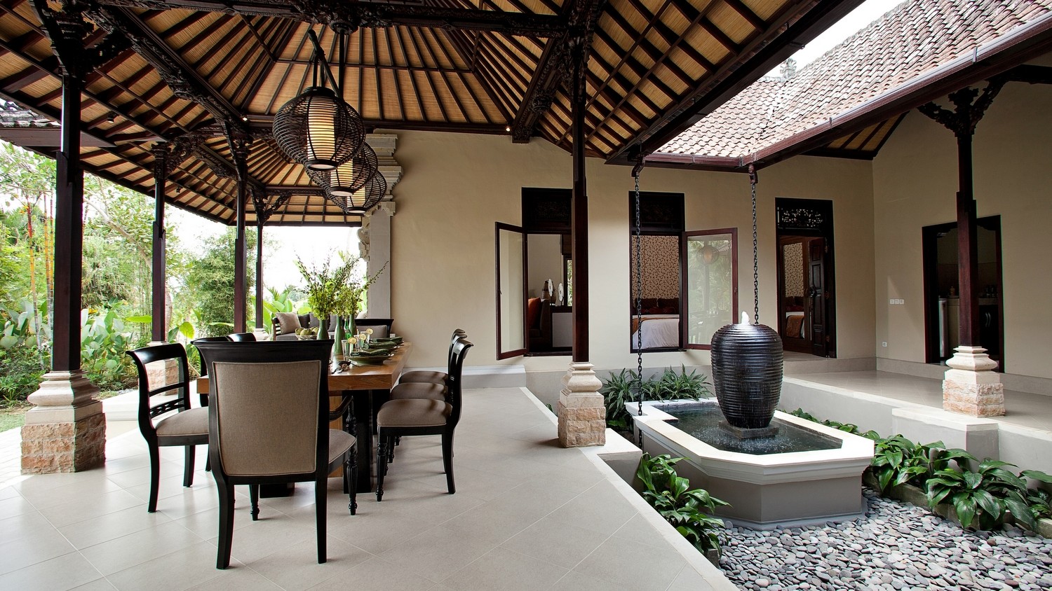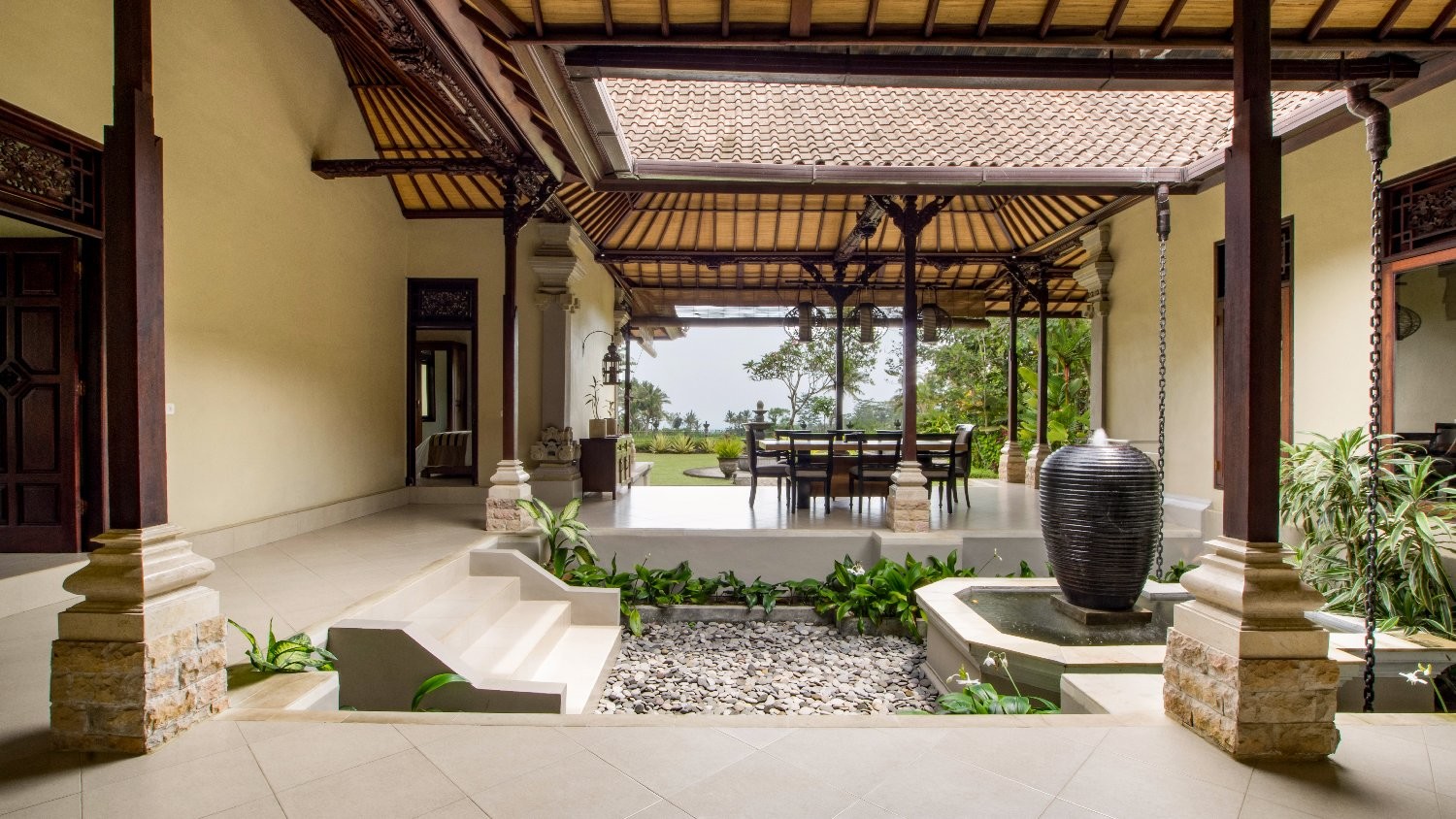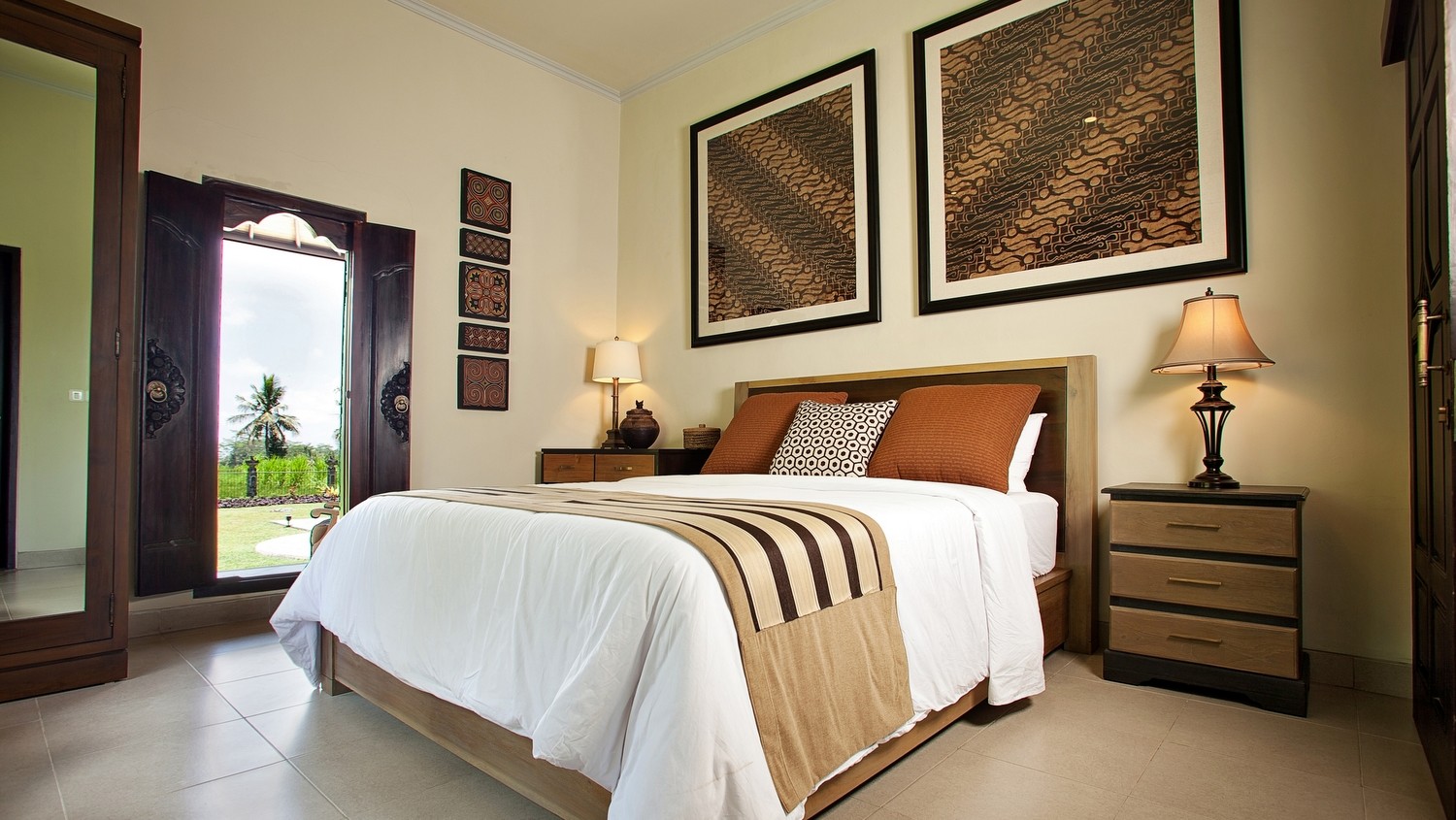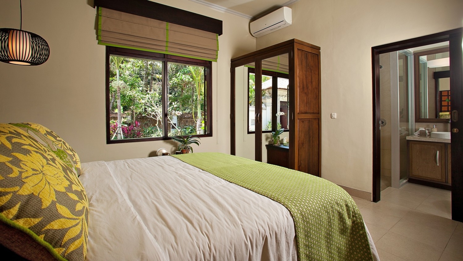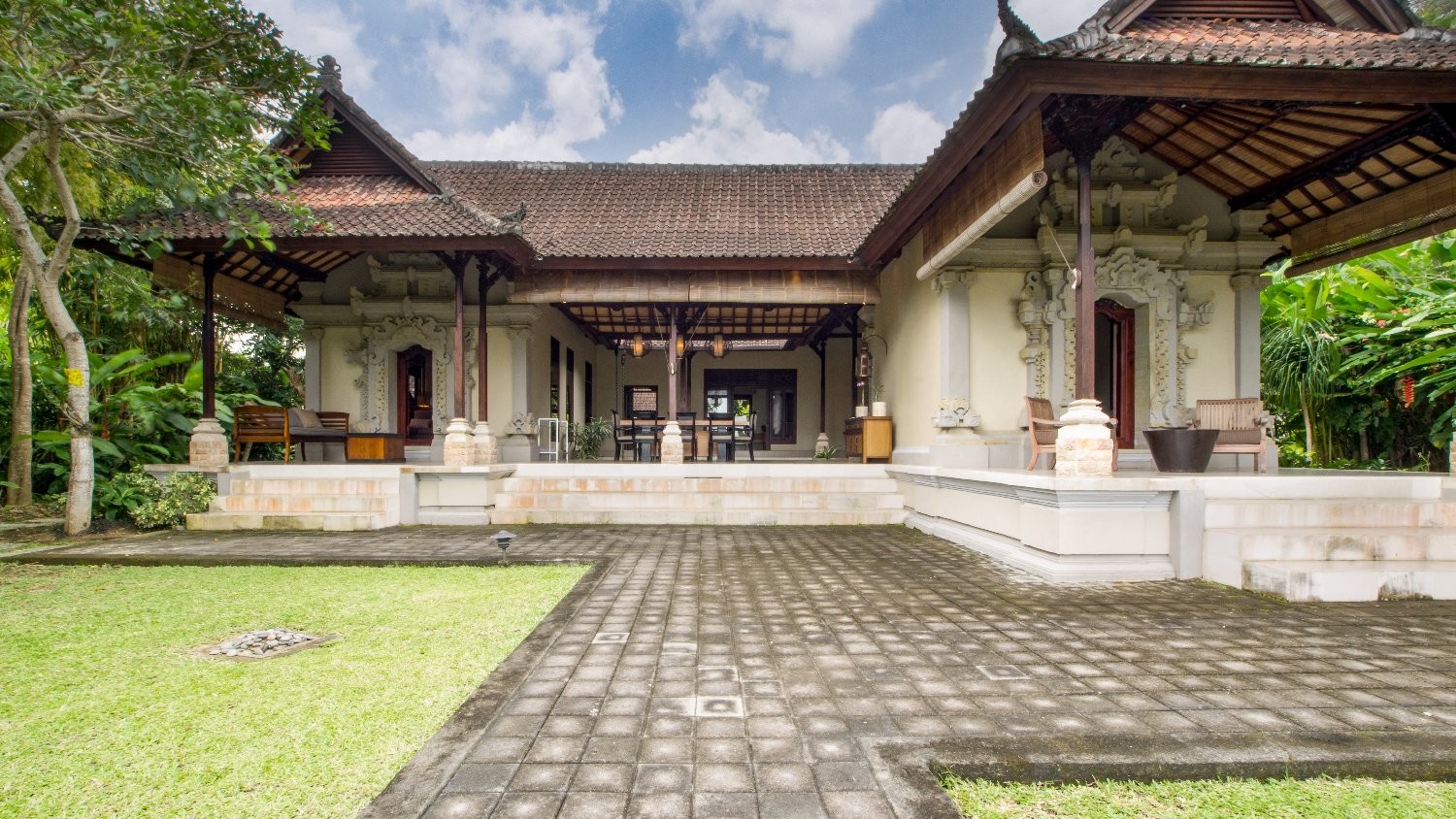 Sited at extensive well-manicured garden fenced with line of coconut tree, this villa is perfect for your tranquil staying accommodation in Bali’s heartland of Ubud. The atmosphere of Balinese culture can be sensed from the time you enter the area which is pictured in the architecture of the building. Detailed sculptured entrance and door enhances the ambiance of local building structure which is beautified by a cascading fountain. The villa itself consists of 1 main bedroom furnished with sofa, working desk and a bathroom with bathtub. Meanwhile, there are two more bedrooms located on the different side of the building. These bedrooms are connected by dining room and living room on the other side which are designed to suit the classic Balinese architecture. This villa is blessed with picturesque view of green rice field enhancing the view of great nature. This peaceful tropical view is also complemented by a lagoon-like pool where you can dip while enjoying the great sky of Bali meeting the endless stretch of green landscape. On the side of the pool, located a traditional Balinese bale where you can start your yoga activity, reading books, or just laying down while enjoying the cool breeze of wind and seeing the vast green paddy fields and coconut trees. The poolside is also perfect to get our tan work started or doing a small barbecue with your loved ones. While you spending your quality time in this villa, professional staff will take care of your needs and inquiries. Security staff is available 24 hours and the housekeeping will take care the rest of tidy up. If you want to explore the area, sightseeing while riding a bike is one of the best activities you could do. You may find local residence living not far from your villa or finding local village temples. Furthermore, the main hub of Ubud is only about 20 minutes and Goa Gajah for about 10 minutes by car.