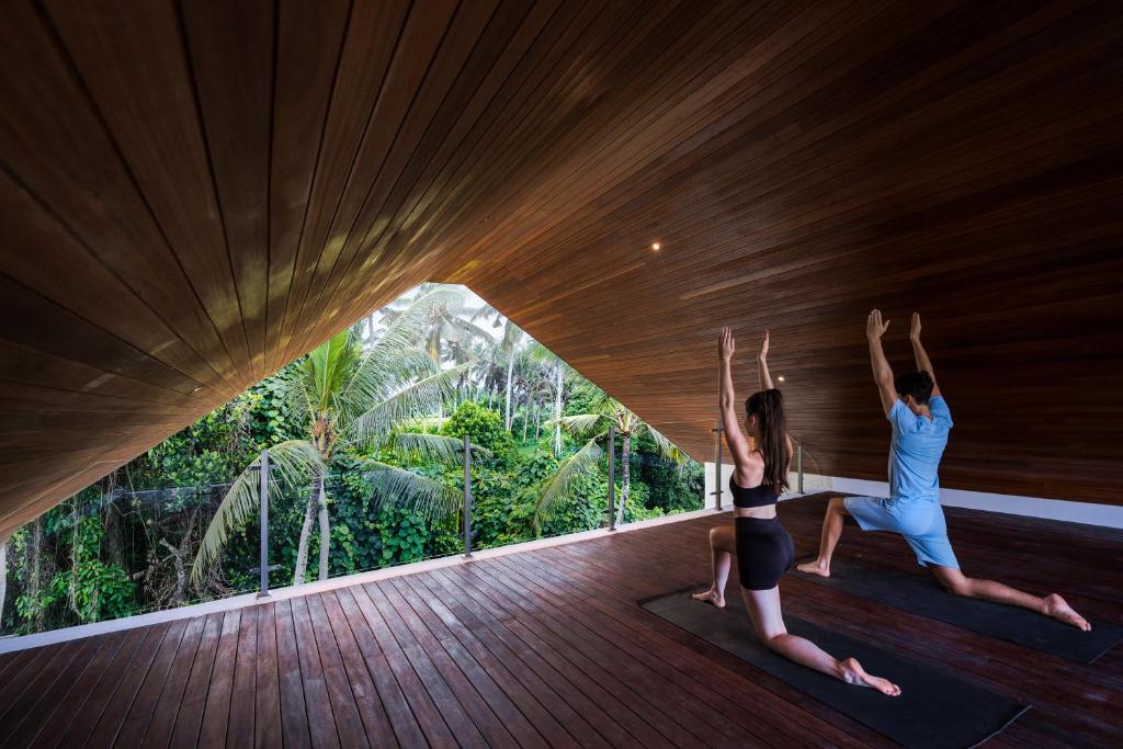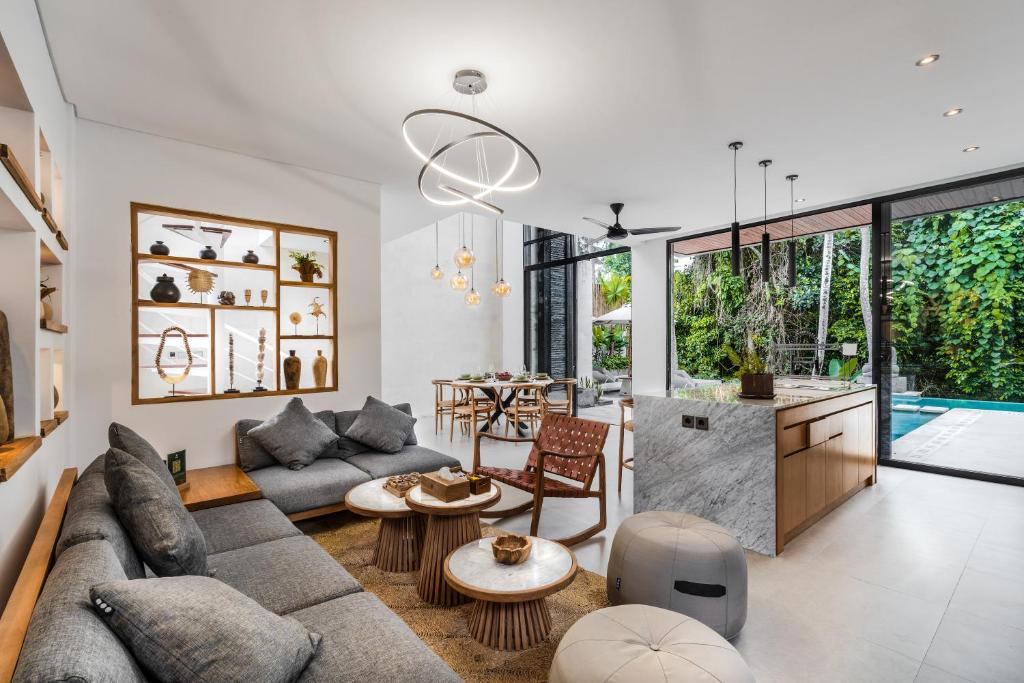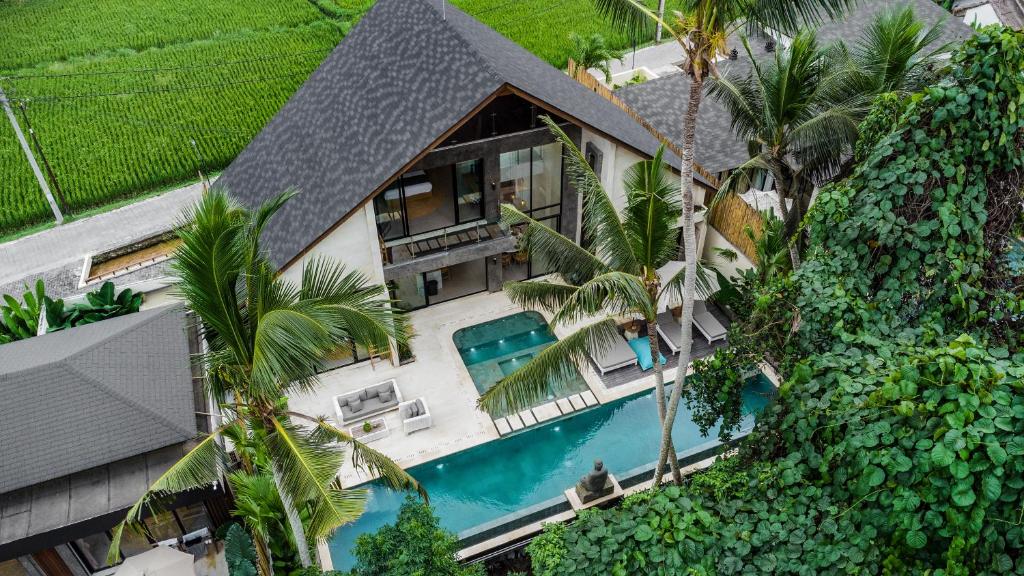 This is a 3-bedroom villa nestled in the lush landscapes of Peliatan, Ubud. The villa's modern three-story architecture seamlessly blends with the natural beauty of the jungle and rice fields. Feeling a sense of serenity and connection with nature, just like the calm ocean waves. Step into the first floor of this villa, where an open space living room awaits. This area features a ceiling fan, a comfortable sofa, and a dining table. The fully equipped kitchen includes a coffee maker, providing everything you need for a delightful culinary experience. Two bedrooms on this floor offer versatile queen beds that can convert to twin-size beds, ensuring flexibility for your sleeping arrangements. Each bedroom is equipped with AC, a smart TV, and en-suite bathrooms with indoor and outdoor bathtubs, allowing you to unwind in style. Second floor houses a private bedroom with a queen-size bed, AC, TV, and an en-suite bathroom. This private retreat offers a serene space to relax after a day of exploring the beautiful surroundings. On the top floor, the space is dedicated to wellness and is equipped with a yoga shala, perfect for practicing yoga, meditation, or simply enjoying the breathtaking views of the jungle and rice fields. This villa outdoor area is designed for relaxation and entertainment, with a swimming pool for your enjoyment. Additionally, there is a guest toilet for added convenience. Located in the heart of Ubud, the villa offers easy access to nearby attractions and activities.
