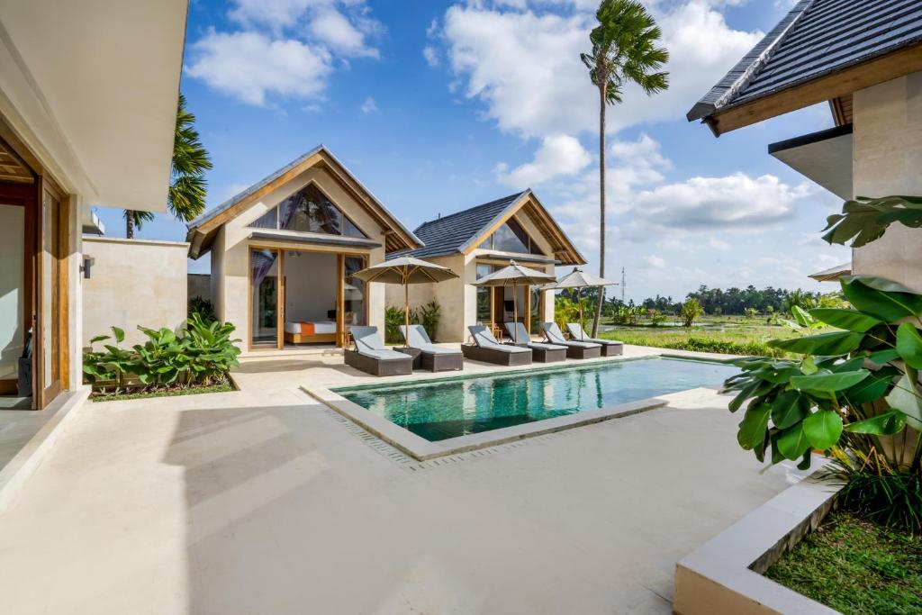 Nestled on a quiet lane in Ubud's artisan district, this contemporary villa offers a serene and stylish retreat. The inviting swimming pool serves as a central hub, linking the four stand-alone bedroom suites with the main house, all set against a backdrop of peaceful rice field views. Just a 3-minute drive from Ubud's shopping and dining options, the location balances tranquility with access to traditional Indonesian sights like temples and rice fields. With thoughtful architecture, unique design, and premium furnishings, this luxury villa combines comfort and elegance, featuring a fully-equipped kitchen and chic decor for a truly enjoyable stay.