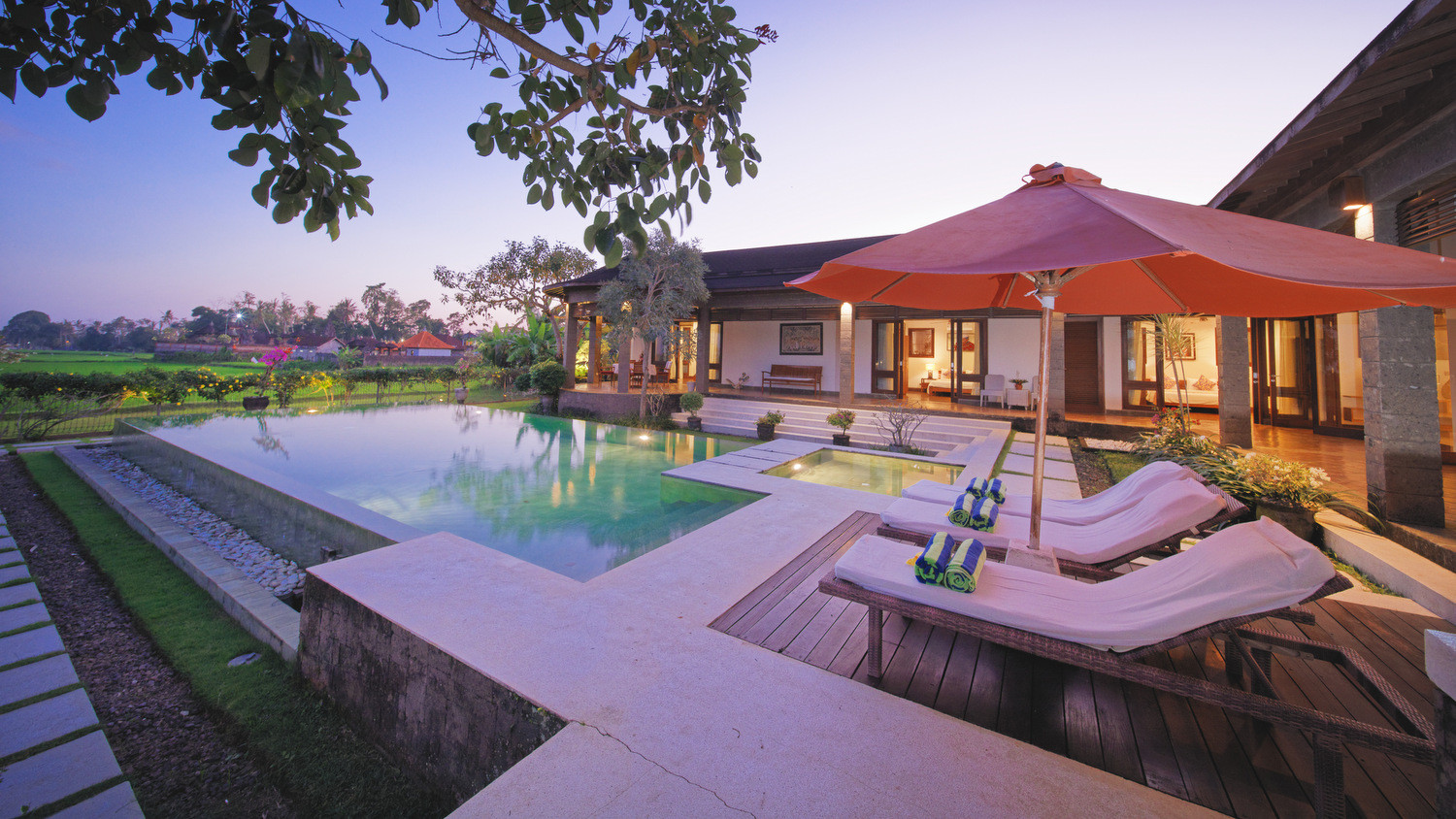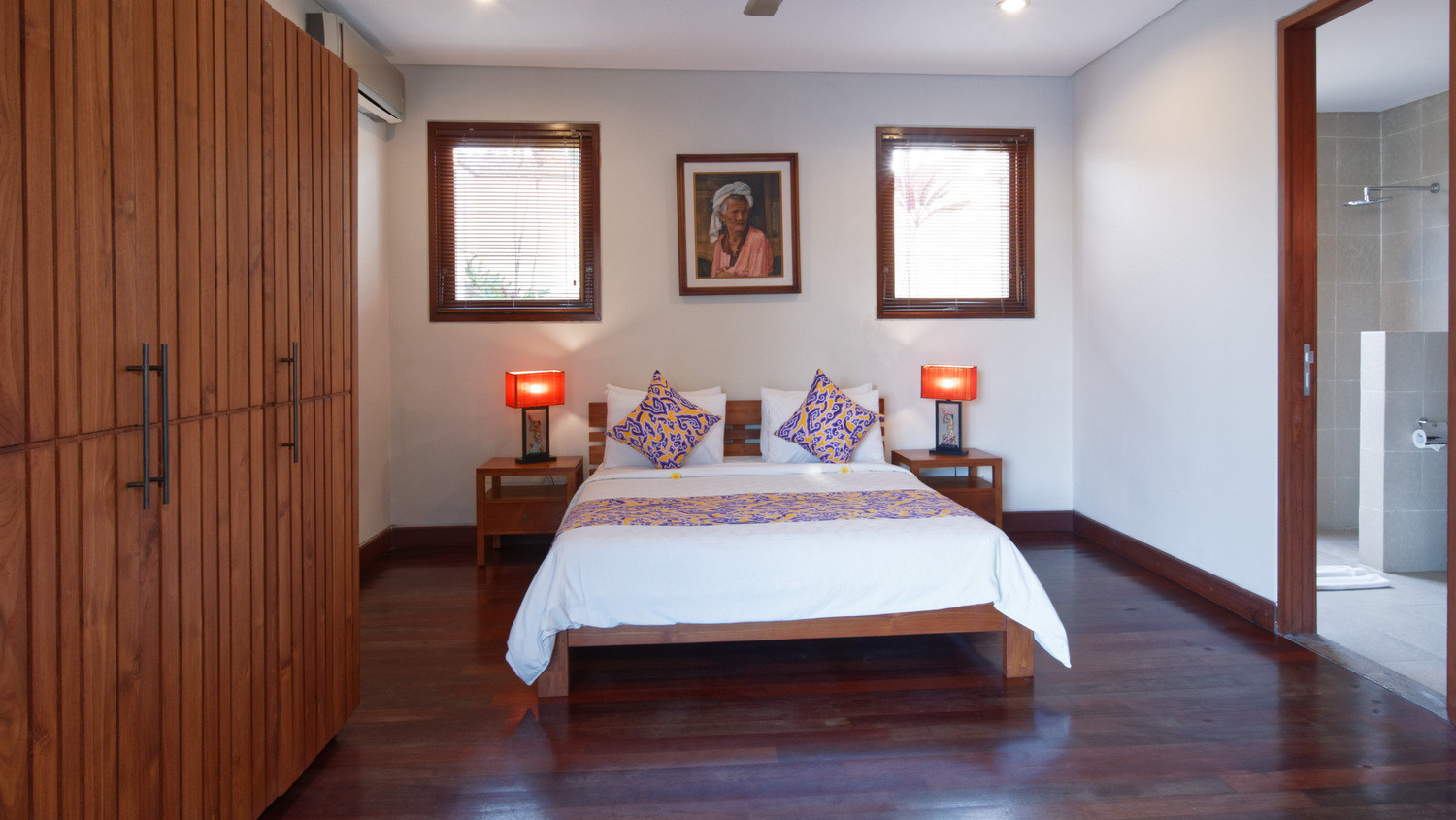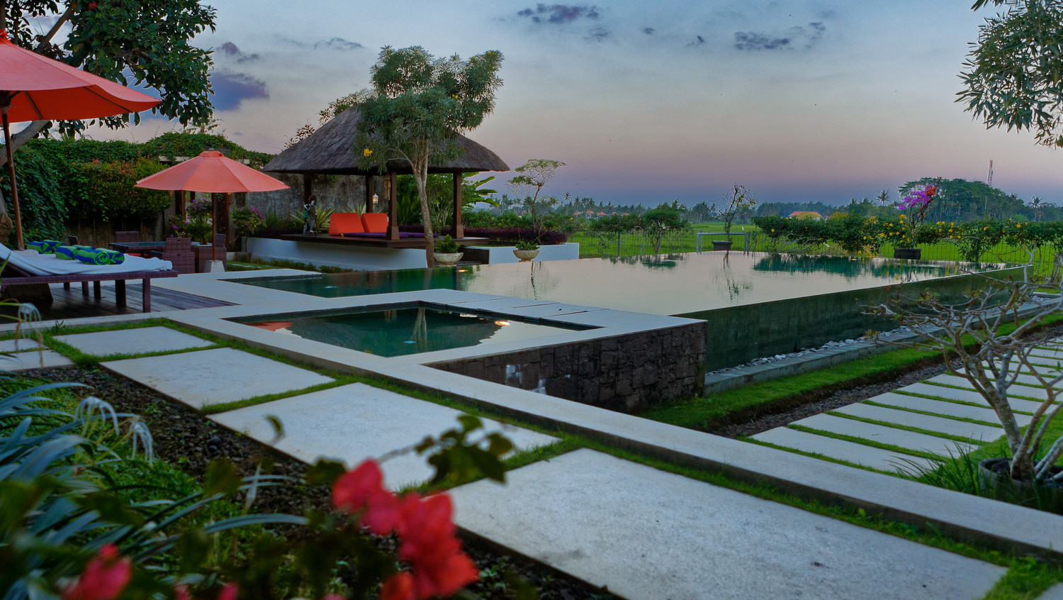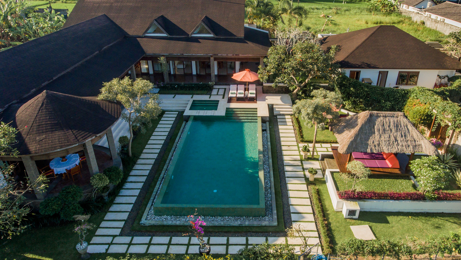 Our open-area-situated the villa is designed perfectly with a modern touch and embraces the idea of being part of the surrounding nature. The green areas around the villa infuse a fantastic feel and atmosphere into the building of the villa itself. With most of these open areas, the villa will definitely comfort you during your retreat time in Ubud. The luxurious features given to the villa along with its beautiful surroundings make this villa the most recommended one to stay in. It has three bedrooms, one of which is a master bedroom, are open into the pool giving a stunning view for you while enjoying the most comfortable corner of the villa. You will never find yourself running out space for your lovely families, as this villa has a huge living area to spend your time together with its additional TV-room just next to the living area. What a perfect movie and family time you would have upon staying with us at our Ubud Private Villa Rental. The huge swimming pool of this villa overlooking the rice fields will spoil you and make you feel the tranquility of this fantastic villa. You can also have a relaxing time with your lemonade in the traditional wooden building which is designed just close to the swimming pool. Every little thing featured in this villa is to bring the best out of the best that the villa can offer and making you experience the best treatment of your precious days in our Ubud private villa.