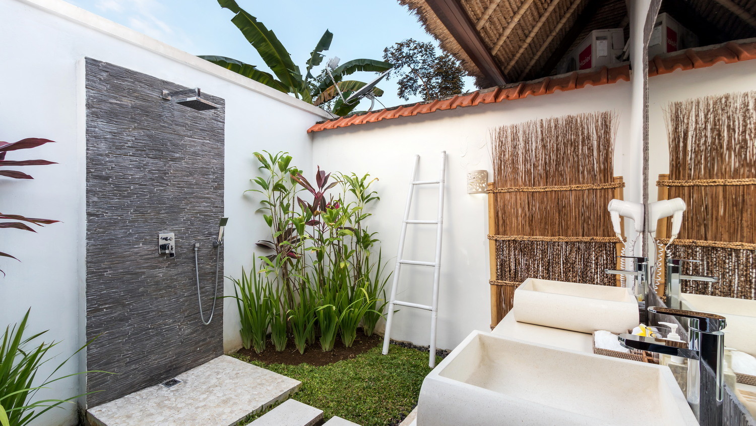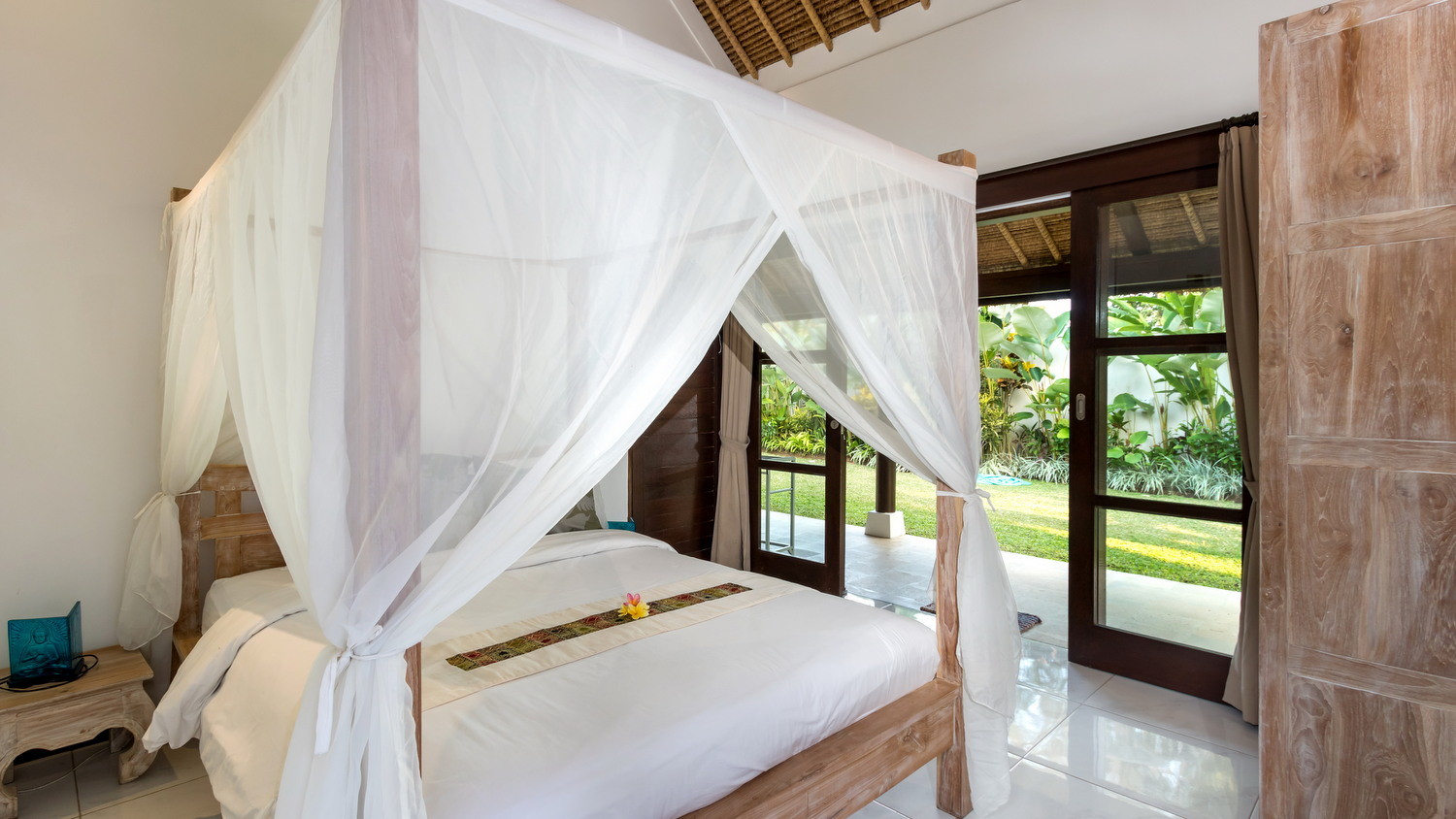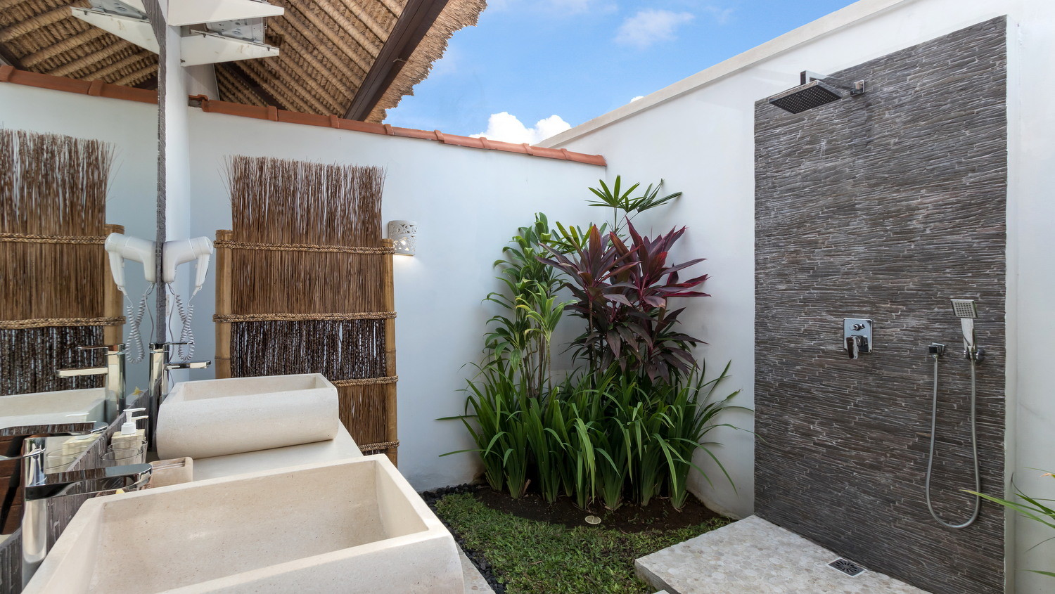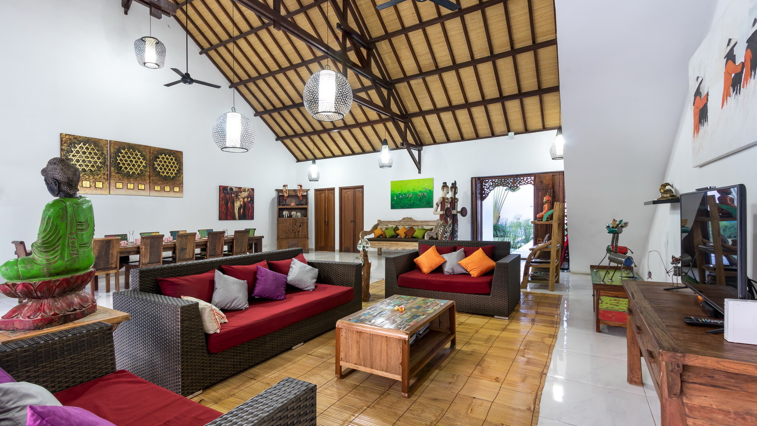 With alang-alang thatched roofs, breezy palm trees, spacious room filled with an eclectic collection of tall sculptures, the villa is a stunning setting that melts together a contemporary and an ethnically rich interior. The villa features a spacious alfresco entertainment room on the upper floor as well as 4-ensuite bedrooms enclosed with floor-to-ceiling sliding glass doors and windows.