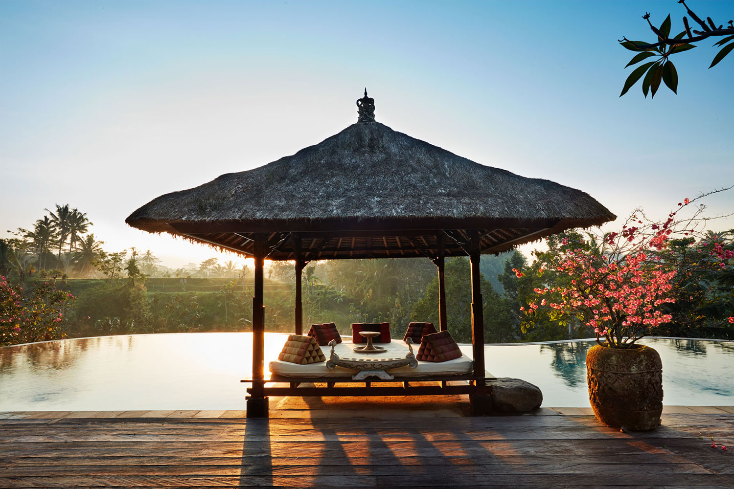 This 4 bedroom villa in Ubud, Bali is definitely your ultimate Bali-staying experience. When you enter the villa, you will be greeted by the view of mighty Mount Agung in the north. Located in Bali’s rich cultural highland, this villa presents you uncompromised green-surrounded scenery where lush widespread of rice fields and green valley meet the fresh air and serene atmosphere. It’s like nothing to be seen but lush green part of the earth. It is a well-paid off after one hour trip from International Ngurah Rai Airport, in Denpasar. This 4 bedroom villa is nestled with an infinity pool offering a view of green valley fenced with rice fields. Decoration and furniture are designed to enclose you with deep Balinese taste. Not to be forgotten, these four bedrooms are separated by a beautiful green garden, connecting you to the pool. It is a perfect spot to be relished for yoga area or simply enjoying the shower of sunlight. A personalized service is provided allowing you to experience a full Balinese cultural experience. You’ll be able to watch how our staff carefully take care of the tradition while serving you to fulfill your Bali vacation dream. Our staff will always be ready to assist you ensuring you to have the best moment of staying at this private villa in Ubud, Bali. To complete your journey, several Ubud’s favorite tourist spots are not far away from the villa. Heron Village, Ayung River, Elephant Cave and Payangan traditional market can be reached in less than thirty minute driving. You can also have a nice cycling trip or do a little sightseeing, walking and exploring the breathtaking landscape around your villa. This 4 bedroom villa, without a doubt, is an ideal choice for those who seek tranquility in cool upland area of Ubud.