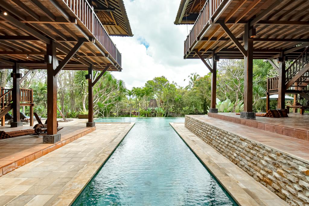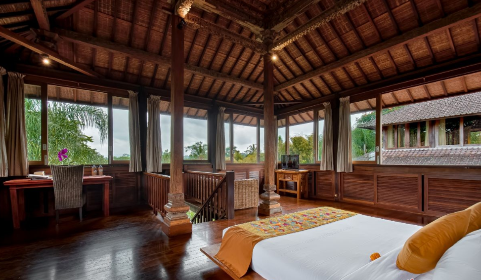 Our unique 7 bedroom Private Villa in Ubud is built in the lovely green surrounding featuring nature attractiveness around the buildings. The villa consists of two wooden houses, each of which is featured with bedroom, bathroom and living room in each house. Each of the room has large windows overlooking the outside view of the green nature surroundings as well the pool. The Bedroom in one of the houses features a double bed while another is with two single beds which is suitable for you and your friends or family to stay in. The living room in each house is designed overlooking the garden and makes it having an amazing nature view with most of the interior is made of the wooden materials, it gives a unique and classic touch to the furnished building in the entire house. On the very first floor of the building, you can enjoy sitting by the pool having your time talking or chilling out with your relatives. The place is very far from the crowd so you don’t have to be worried about being less private. As the house is also featured with kitchen, you can manage to use it easily whenever you want to prepare your meal for your family yourself.