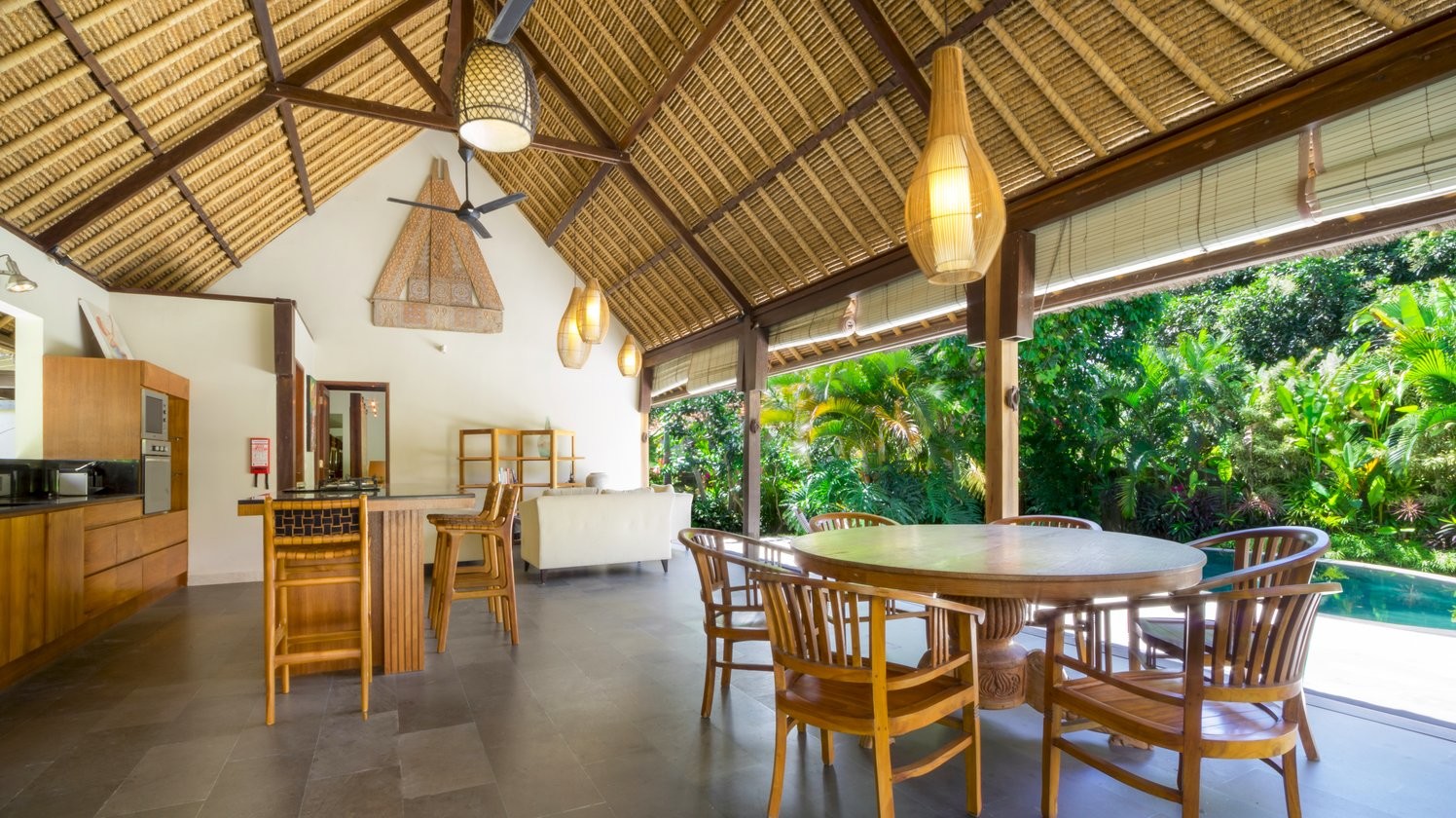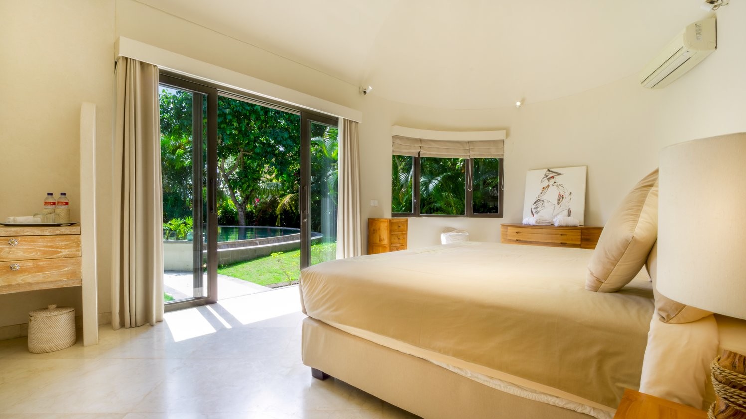 This villa is a beautiful 2-bedroom retreat recognized by oval shapes in its layout and architecture. The villa is located in the far south, close to Bali's most stunning beaches and the famous Uluwatu temple. This is the perfect villa for a small family or two couples. This villa is part of a 5-villa complex, separated by lovely garden walks. Each villa has its own entrance but the villa can also be rented out as a whole in case of special events like weddings or other celebrations. The air-conditioned master bedroom with view on the lovely garden features a king-size master bed, a large flat-screen TV, painted wooden furniture and there is a very large dressing-room with no less than 4 big mirrors. The en-suite bathroom is spacious and bright and it features a luxurious bathtub carved out of black stone., twin washbasins and there is also a rain-shower underneath Bali's clear blue skies. The guest bedroom is located in a separate round-shaped building and can be reached by a small garden walk. The room features two twin beds which can be joined together to make one big king-size bed, a flat-screen TV and wooden furniture. The indoor shower can be found inside the snail-shaped marmer wall, outside you will find the washbasin and there is a separate toilet. Enter the villa through its beautifully made antique Javanese door and find yourself in its a beautiful green garden with a green grass lawn and lots of tropical flowers, plants, and trees providing you with shade. Follow the stone path to reach the stunning round-shaped swimming-pool and the pavilions. On the villa's marmer veranda you can relax on one of the sunbeds to catch a tan and after diving into the pool for some refreshment, you can take a shower underneath the out-door rain-shower.