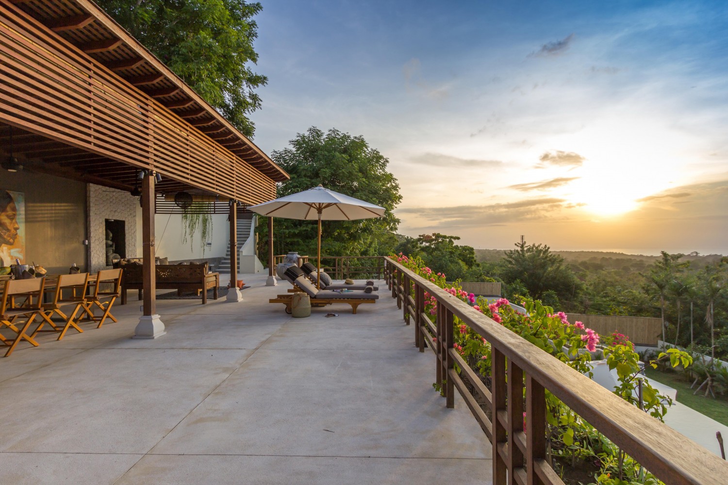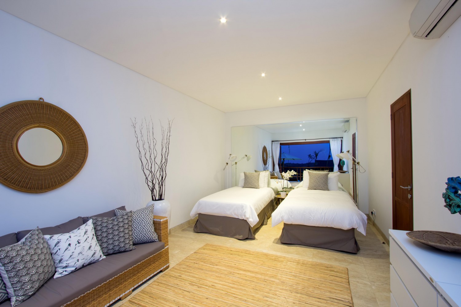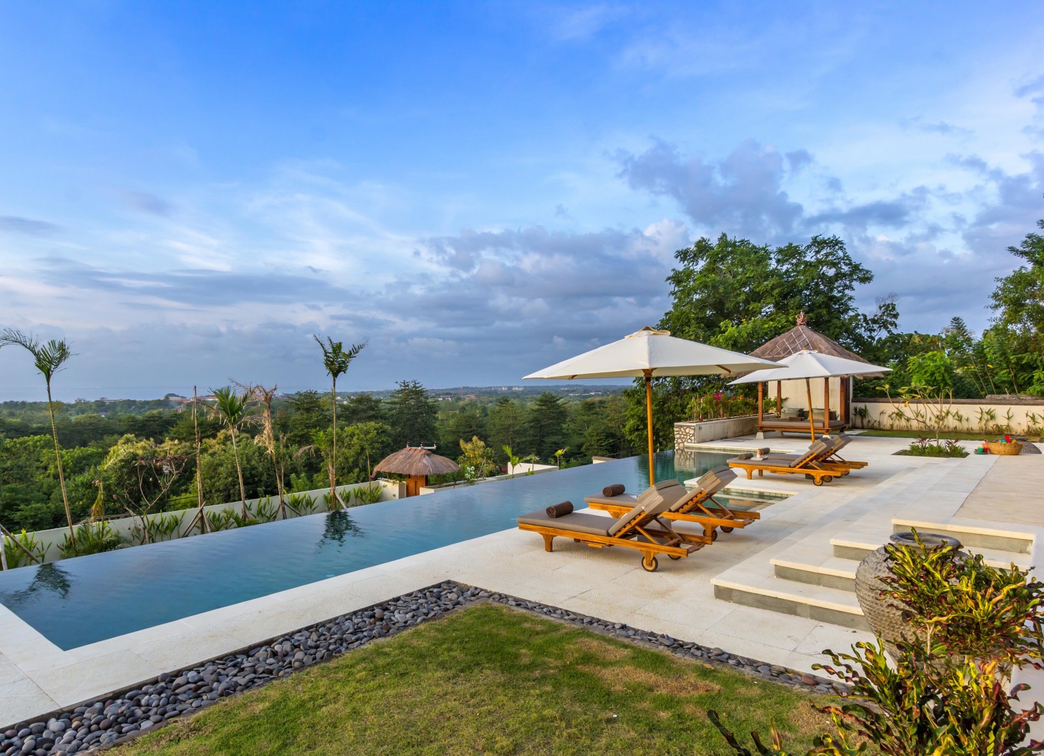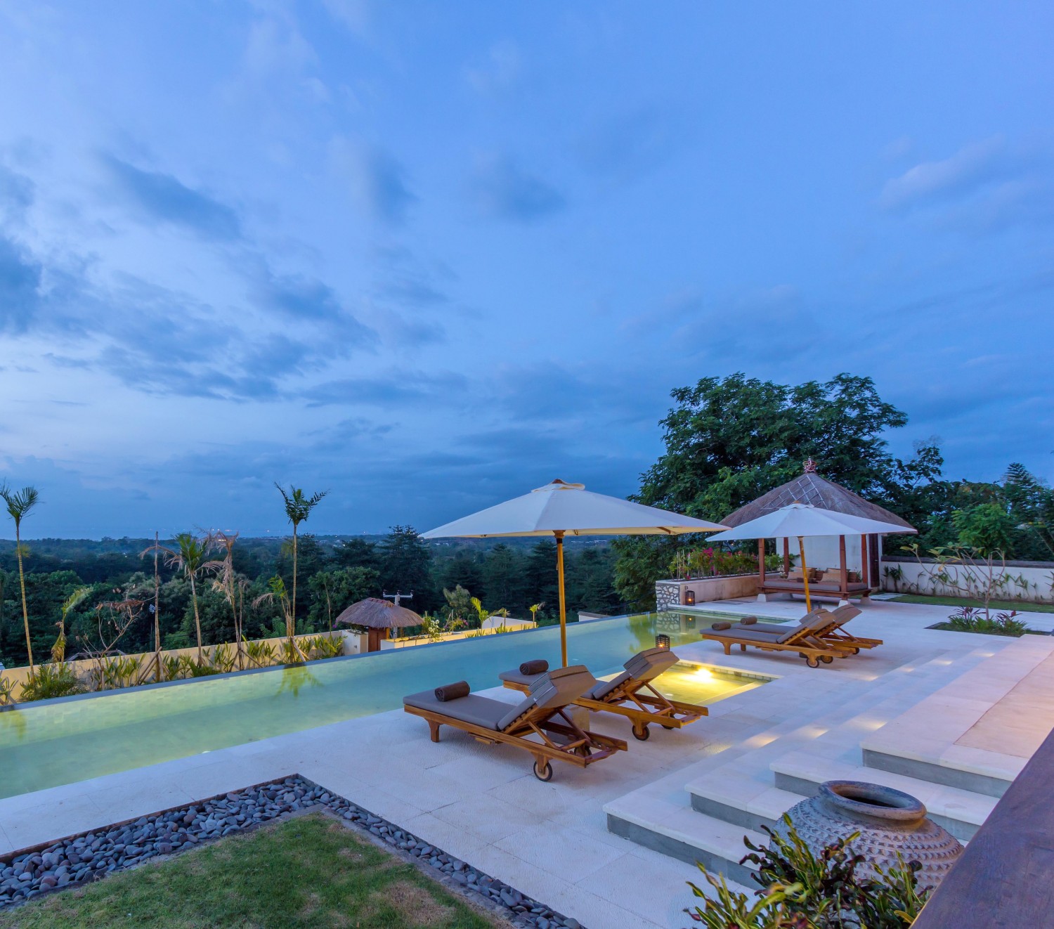 This stunning two and a half bedroomed villa is absolutely perfect for a family holiday. A very rare combination of a villa with a suitable number of bedrooms for a single family and yet with huge outdoor space for the children to really tear around and have fun. Indulge yourself in the beautifully decorated rooms – from your zen-like master bedroom, with luxury king-sized bed and ensuite marble-floored bathroom, to a huge tropical modern living room with TV, Apple TV, Netflix and a vast collection of books and board games for you to enjoy. Take time away from the garden and pool in the evenings to enjoy a drink at the bar on the deck and take in the breathtaking sunset view of the Balinese countryside and Indian Ocean in the distance.