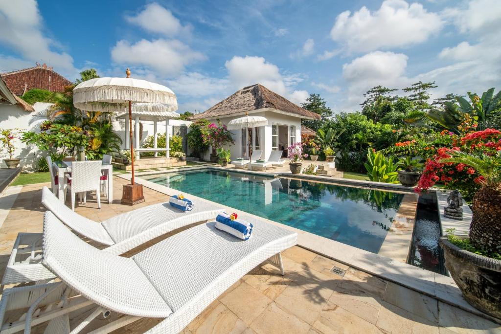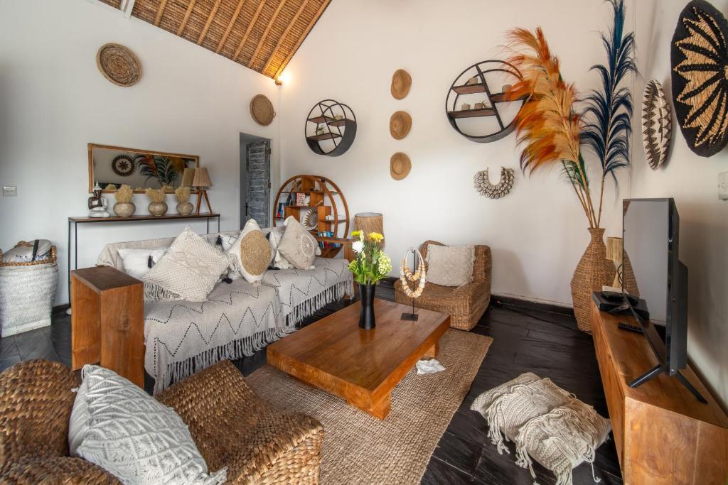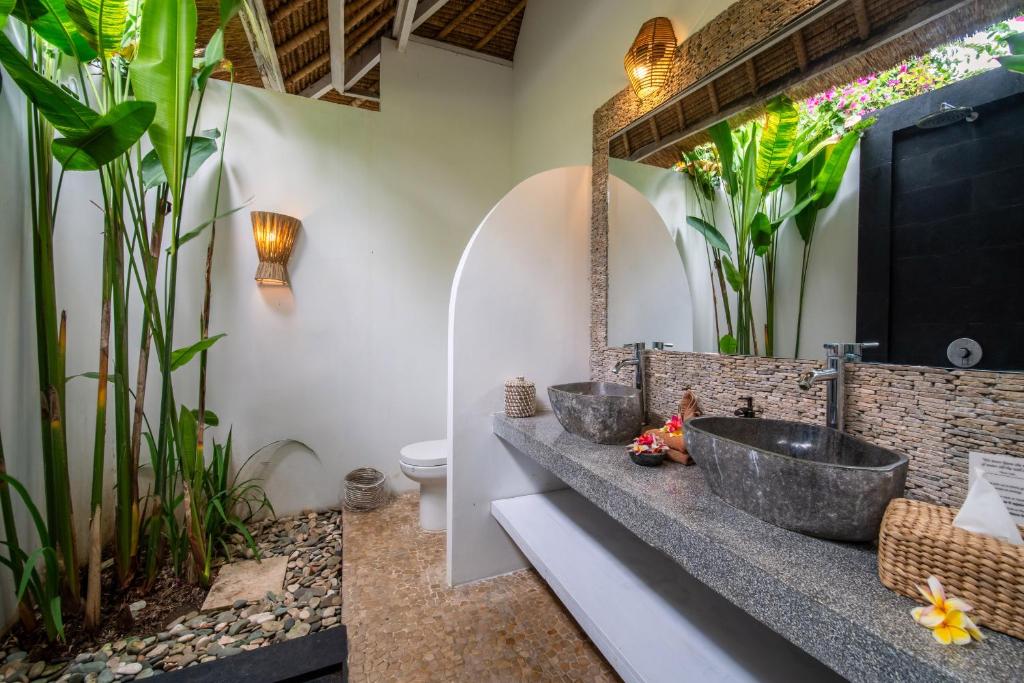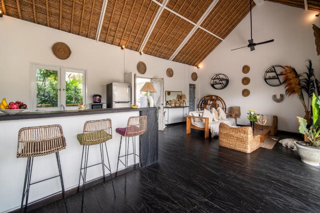 This 3-bedroom villa features a private pool surrounded by a lush tropical garden, offering plenty of spaces to relax, from sun loungers to a large patio for al fresco dining and a gazebo perfect for reading by the pool. The interiors are designed with raw materials, warm lighting, and tropical decor with modern Balinese accents. The fully equipped kitchen allows guests to prepare their own meals, while the comfortable living area with plush seating and a flat-screen TV is ideal for unwinding after a busy day. Each air-conditioned bedroom is designed for privacy and comfort, with an en suite bathroom featuring outdoor showers, and floor-to-ceiling glass doors that open directly to the pool and garden.