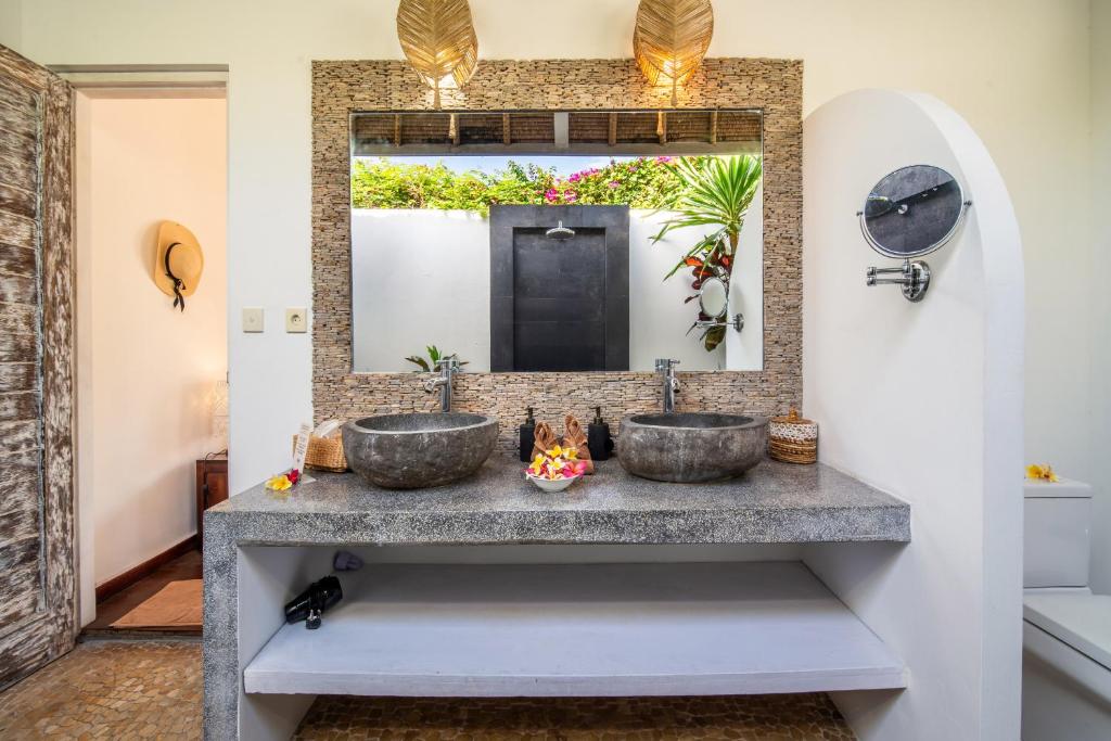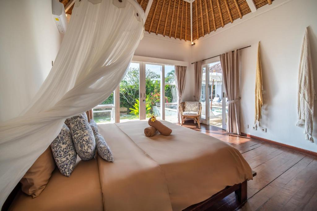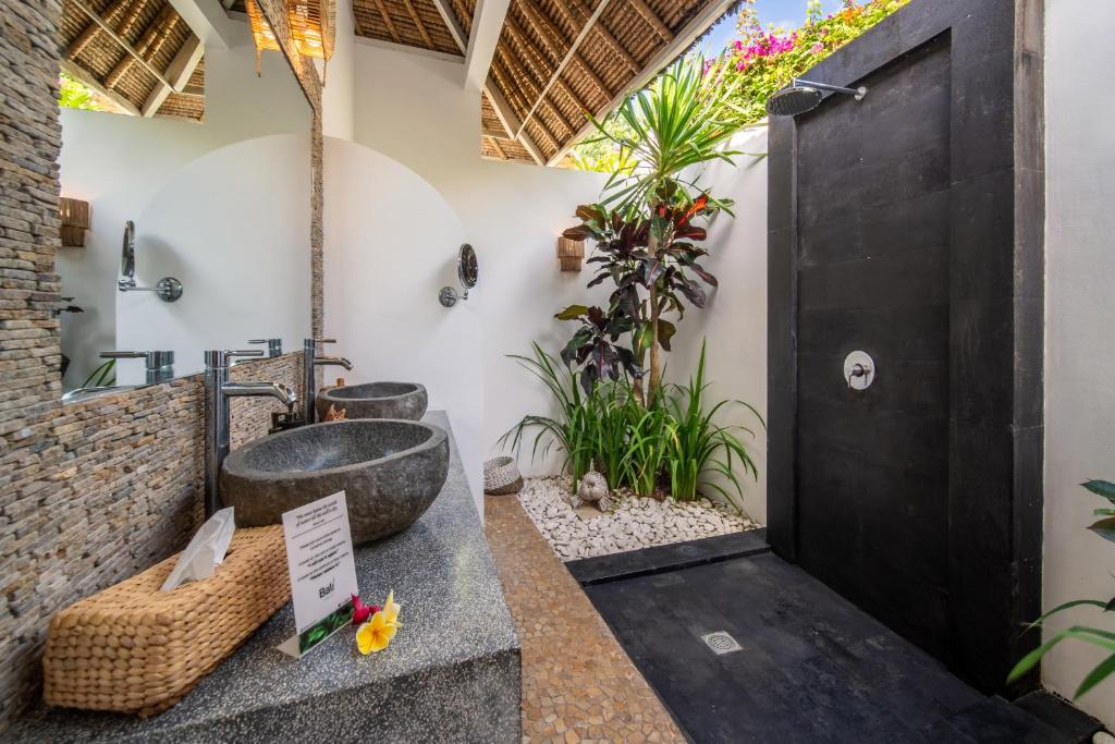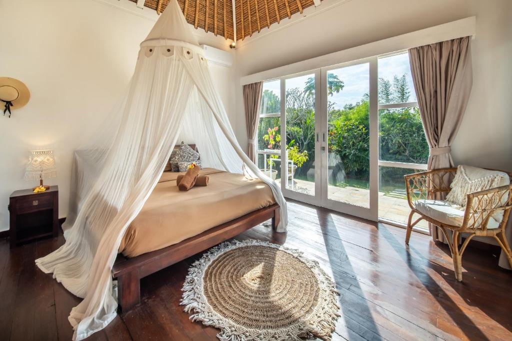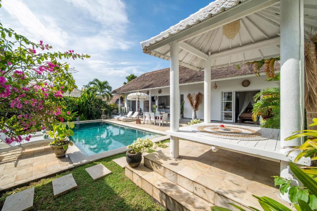 This 3-bedroom villa features a private pool surrounded by a lush tropical garden, offering plenty of spaces to relax, from sun loungers to a large patio for al fresco dining and a gazebo perfect for reading by the pool. The interiors are designed with raw materials, warm lighting, and tropical decor with modern Balinese accents. The fully equipped kitchen allows guests to prepare their own meals, while the comfortable living area with plush seating and a flat-screen TV is ideal for unwinding after a busy day. Each air-conditioned bedroom is designed for privacy and comfort, with an en suite bathroom featuring outdoor showers, and floor-to-ceiling glass doors that open directly to the pool and garden.